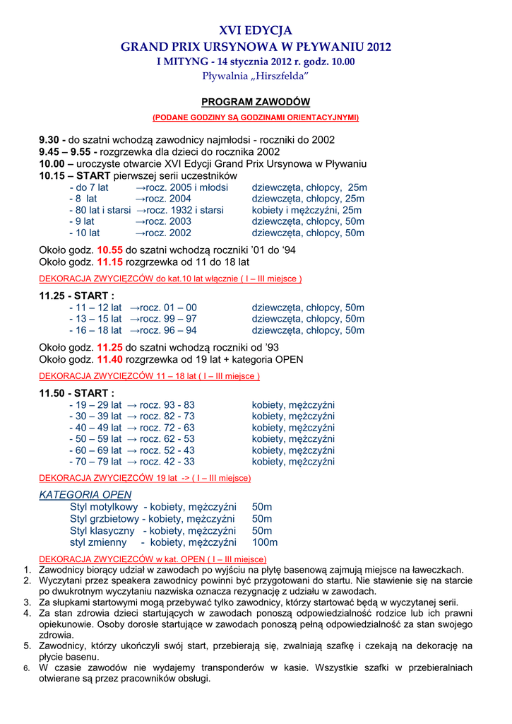 XVI EDYCJA GRAND PRIX URSYNOWA W PŁYWANIU 2012 I MITYNG - 14 stycznia 2012 r. godz. 10.00 Pływalnia „Hirszfelda” PROGRAM ZAWODÓW (PODANE GODZINY SĄ GODZINAMI ORIENTACYJNYMI) 9.30 - do szatni wchodzą zawodnicy najmłodsi - roczniki do 2002 9.45 – 9.55 - rozgrzewka dla dzieci do rocznika 2002 10.00 – uroczyste otwarcie XVI Edycji Grand Prix Ursynowa w Pływaniu 10.15 – START pierwszej serii uczestników - do 7 lat →rocz. 2005 i młodsi dziewczęta, chłopcy, 25m - 8 lat →rocz. 2004 dziewczęta, chłopcy, 25m - 80 lat i starsi →rocz. 1932 i starsi kobiety i mężczyźni, 25m - 9 lat →rocz. 2003 dziewczęta, chłopcy, 50m - 10 lat →rocz. 2002 dziewczęta, chłopcy, 50m Około godz. 10.55 do szatni wchodzą roczniki ’01 do ‘94 Około godz. 11.15 rozgrzewka od 11 do 18 lat DEKORACJA ZWYCIĘZCÓW do kat.10 lat włącznie ( I – III miejsce ) 11.25 - START : - 11 – 12 lat →rocz. 01 – 00 - 13 – 15 lat →rocz. 99 – 97 - 16 – 18 lat →rocz. 96 – 94 dziewczęta, chłopcy, 50m dziewczęta, chłopcy, 50m dziewczęta, chłopcy, 50m Około godz. 11.25 do szatni wchodzą roczniki od ’93 Około godz. 11.40 rozgrzewka od 19 lat + kategoria OPEN DEKORACJA ZWYCIĘZCÓW 11 – 18 lat ( I – III miejsce ) 11.50 - START : - 19 – 29 lat - 30 – 39 lat - 40 – 49 lat - 50 – 59 lat - 60 – 69 lat - 70 – 79 lat → rocz. 93 - 83 → rocz. 82 - 73 → rocz. 72 - 63 → rocz. 62 - 53 → rocz. 52 - 43 → rocz. 42 - 33 kobiety, mężczyźni kobiety, mężczyźni kobiety, mężczyźni kobiety, mężczyźni kobiety, mężczyźni kobiety, mężczyźni DEKORACJA ZWYCIĘZCÓW 19 lat -> ( I – III miejsce) KATEGORIA OPEN Styl motylkowy - kobiety, mężczyźni Styl grzbietowy - kobiety, mężczyźni Styl klasyczny - kobiety, mężczyźni styl zmienny - kobiety, mężczyźni 50m 50m 50m 100m DEKORACJA ZWYCIĘZCÓW w kat. OPEN ( I – III miejsce) 1. Zawodnicy biorący udział w zawodach po wyjściu na płytę basenową zajmują miejsce na ławeczkach. 2. Wyczytani przez speakera zawodnicy powinni być przygotowani do startu. Nie stawienie się na starcie po dwukrotnym wyczytaniu nazwiska oznacza rezygnację z udziału w zawodach. 3. Za słupkami startowymi mogą przebywać tylko zawodnicy, którzy startować będą w wyczytanej serii. 4. Za stan zdrowia dzieci startujących w zawodach ponoszą odpowiedzialność rodzice lub ich prawni opiekunowie. Osoby dorosłe startujące w zawodach ponoszą pełną odpowiedzialność za stan swojego zdrowia. 5. Zawodnicy, którzy ukończyli swój start, przebierają się, zwalniają szafkę i czekają na dekorację na płycie basenu. 6. W czasie zawodów nie wydajemy transponderów w kasie. Wszystkie szafki w przebieralniach otwierane są przez pracowników obsługi.