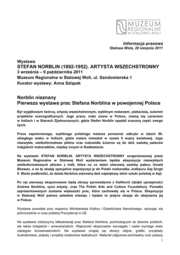 Informacja prasowa Stalowa Wola, 20 sierpnia 2011 Wystawa STEFAN NORBLIN (1892-1952). ARTYSTA WSZECHSTRONNY 3 września – 9 października 2011 Muzeum Regionalne w Stalowej Woli, ul. Sandomierska 1 Kurator wystawy: Anna Szlązak Norblin nieznany Pierwsza wystawa prac Stefana Norblina w powojennej Polsce Był wyjątkowym twórcą, artystą wszechstronnym, wybitnym malarzem, plakacistą, autorem projektów scenograficznych. Jego prace, mało znane w Polsce, cieszą się uznaniem w Indiach i w Stanach Zjednoczonych, gdzie Stefan Norblin spędził znaczną część swego życia. Prace zapomnianego, wybitnego polskiego malarza ponownie odkryto w latach 90. ubiegłego wieku w Indiach, gdzie malarz mieszkał w czasie II wojny światowej. Jego niezwykłe, wielkoformatowe płótna oraz malowidła ścienne są do dziś ozdobą pałaców indyjskich maharadżów, między innymi w Radżastanie. Na wystawie STEFAN NORBLIN. ARTYSTA WSZECHSTRONNY zorganizowanej przez Muzeum Regionalne w Stalowej Woli wydarzeniem będzie ekspozycja niezwykłych wielkoformatowych płócien z Indii, które na co dzień stanowią ozdobę pałacu Umaid Bhawan, a na tę okazję specjalnie wypożyczył je do Polski maharadża Jodhpuru Gaj Singh II. Warto podkreślić, że dzieła Norblina stanowią dziś największy zbiór sztuki polskiej w Azji. Po raz pierwszy eksponowane będą obrazy sprowadzone z Kalifornii (dzięki uprzejmości Andrew Norblina, syna artysty, oraz The Polish Arts and Culture Foundation). Ponadto zaprezentowanych zostanie większość prac, które zachowały się w Polsce. Ekspozycja w Stalowej Woli potrwa zaledwie miesiąc i będzie to jedyna okazja do obejrzenia jej w Polsce. Wystawa powstała przy wsparciu Ministerstwa Kultury i Dziedzictwa Narodowego, wpisując się jednocześnie w czas polskiej Prezydencji w UE. Na wystawie zobaczymy kilkadziesiąt prac Stefana Norblina, pochodzących ze zbiorów polskich, ale także indyjskich i amerykańskich. Większość eksponatów wymagała i nadal wymaga wielu zabiegów konserwatorskich. Na wystawie znajdą się obrazy olejne, grafiki, przykłady ilustratorstwa, plakaty i projekty kostiumów teatralnych. Materiał zdjęciowo-archiwalny oraz pokazy 1 multimedialne wzbogacą wiedzę o prywatnym życiu artysty oraz jego twórczości w Indiach. Malowidła ścienne pokazane zostaną na plenerowej wystawie wielkoformatowych fotografii. Ekspozycja jest ukoronowaniem wieloletniej działalności polskich konserwatorów w pałacu w Jodhpurze. Prace Norblina zostaną zaprezentowane późną jesienią tego roku w New Delhi i Bombaju. Wystawa została zorganizowana przez Muzeum Regionalne w Stalowej Woli (www.muzeum.stalowawola.pl), Ministerstwo Kultury i Dziedzictwa Narodowego Ambasadę Rzeczypospolitej Polskiej w Indiach Miasto Stalowa Wola przy współpracy The Polish Arts and Culture Foundation, Narodowego Instytutu Muzealnictwa i Ochrony Zbiorów Ambasady Indii w Polsce . Mehrangarh Museum Trust w Jodhpur Projekt dofinansowany ze środków Ministra Kultury i Dziedzictwa Narodowego. Wystawie towarzyszy katalog w wersji polsko-angielskiej Wystawa STEFAN NORBLIN (1892-1952). ARTYSTA WSZECHSTRONNY 3 września – 9 października 2011, Muzeum Regionalne w Stalowej Woli, ul. Sandomierska 1 Czynne: wtorek 8.00-18.00, środa, czwartek, piątek 8.00-15.00, sobota, niedziela 16.00-19.00. Część plenerowa wystawy (fotografie wielkoformatowych malowideł ściennych z Indii) Stalowa Wola, ul. Staszica 14 Czynna całą dobę, oświetlona w nocy Muzeum Regionalne w Stalowej Woli jest nowoczesną instytucją, która czerpie inspirację z tradycji miasta Stalowa Wola, wybudowanego od podstaw w latach 30. XX wieku. Modernizm i dekoracyjność stylu art déco są obecne w architekturze i urbanistyce, zachowanych wnętrzach niektórych budynków, ale też w zbiorach, wystawach i publikacjach Muzeum poświęconych sztuce użytkowej i architekturze art déco. Muzeum tworzy platformę dialogu między tradycjami dwudziestolecia międzywojennego a nowoczesnymi działaniami we współczesnej kulturze. Promuje m.in. design oraz sztukę współczesną, prowadząc szeroko zakrojoną działalność edukacyjną oraz wystawienniczą. Jest także organizatorem serii wystaw najnowszego polskiego designu: Unpolished, Polska Folk, Dziecinada, Zwykła Rzecz – prezentowanych m.in. w Londynie, Kopenhadze, Berlinie, Paryżu, Mediolanie, Kolonii i w Wenecji. Dodatkowe informacje: Anna Szlązak, e-mail: [email protected]; tel: +48 15 844 85 56 Joanna Łozińska, [email protected]; tel +48 660 41 41 02 2 STEFAN NORBLIN ur. 29 czerwca 1892 r. w Warszawie – zm. 12 sierpnia 1952 r. w San Francisco. Właściwie Juliusz Stefan Norblin de la Gourdaine – był synem warszawskiego przemysłowca Stanisława Ignacego Norblina i Bronisławy z Piaseckich – a praprawnukiem Jana Piotra Norblina, wybitnego malarza pochodzenia francuskiego, tworzącego w Polsce w XVIII wieku. Życiorys Stefana Norblina naznaczyły najważniejsze zjawiska historyczne dwudziestego stulecia: odzyskanie przez Polskę niepodległości (1918), wybuch II wojny światowej (1939), emigracja najpierw do Indii, potem do Stanów Zjednoczonych oraz jej następstwa. W 1910 r. ukończył Akademię Ekonomiczno-Handlową w Antwerpii, następnie podjął pracę w koncernie papierniczym. Jego pasją była jednak sztuka. Zaczął rysować, na początku karykatury i portrety, co zaowocowało pierwszą wystawą w amsterdamskiej galerii Memling (1913). Zwiedził wówczas także Paryż i Londyn, gdzie tworzył ilustracje pod pseudonimem hrabia von Luxemburg. W 1920 r. podczas wojny polsko-rosyjskiej Norblin zaciągnął się do armii. Jako tłumacz (znał biegle kilka języków) uczestniczył w konferencji pokojowej w Rydze. Po powrocie do Polski aktywnie uczestniczył w życiu intelektualnej i artystycznej elity warszawskiej. Jego pierwszą żoną była aktorka Maria Modzelewska. W 1933 r. poślubił Lenę Żelichowską, tancerkę Teatru Narodowego oraz po