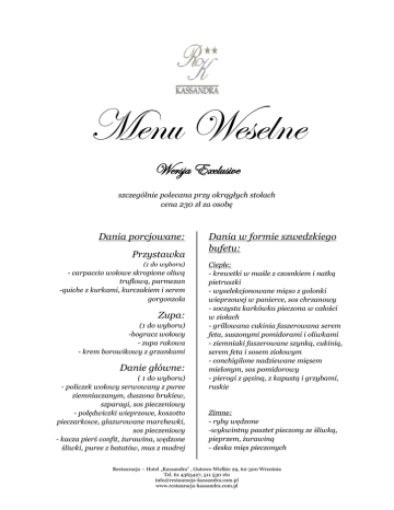 Menu Weselne Wersja Exclusive szczególnie polecana przy okrągłych stołach cena 230 zł za osobę Dania porcjowane: Przystawka (1 do wyboru) - carpaccio wołowe skropione oliwą truflową, parmezan -quiche z kurkami, kurczakiem i serem gorgonzola Zupa: (1 do wyboru) -bogracz wołowy - zupa rakowa - krem borowikowy z grzankami Danie główne: ( 1 do wyboru) - policzek wołowy serwowany z puree ziemniaczanym, duszona brukiew, szparagi, sos pieczeniowy - polędwiczki wieprzowe, koszotto pieczarkowe, glazurowane marchewki, sos pieczeniowy - kacza pierś confit, żurawina, wędzone śliwki, puree z batatów, mus z modrej Dania w formie szwedzkiego bufetu: Ciepłe: - krewetki w maśle z czosnkiem i natką pietruszki - wyselekcjonowane mięso z golonki wieprzowej w panierce, sos chrzanowy - soczysta karkówka pieczona w całości w ziołach - grillowana cukinia faszerowana serem feta, suszonymi pomidorami i oliwkami - ziemniaki faszerowane szynką, cukinią, serem feta i sosem ziołowym - conchigilone nadziewane mięsem mielonym, sos pomidorowy - pierogi z gęsiną, z kapustą i grzybami, ruskie Zimne: - ryby wędzone -wykwintny pasztet pieczony ze śliwką, pieprzem, żurawiną - deska mięs pieczonych Restauracja – Hotel „Kassandra” , Gutowo Wielkie 29, 62-300 Września Tel. 61 4365427, 511 530 161 [email protected] www.restauracja-kassandra.com.pl kapusty - filet z dorsza na puree ziemniaczany, sos beurre blanc, jajko poche, różyczki brokuły Deser: Torcik czekoladowy z kulką lodów naturalnych Kolacja: ( 1 do wyboru) - tatar wołowy, tradycyjne dodatki, majonez kaparowy, grzanki - łosoś marynowany w oliwie czosnkowej i koprze włoskim, domowe frytki, pieczony topinambur, rozmaryn, dip koperkowy -melon w szynce szwarcwaldzkiej - jajka z sosem gribiche - tatar ze śledzia na razowym pieczywie - sałatka z grillowanym kurczakiem, warzywami i sosem vinegrette - sałatka z wędzonym łososiem i sosem koperkowym - sałatka makaronowa z szynką, papryką i kukurydzą - sałatka ziemniaczana z porem i ogórkiem kiszonym - platery owoców Ponadto - ok. godziny 22.00 serwujemy szynkę wieprzową pieczoną w całości, sos tatarski - ok. godziny 23.00 podajemy tort weselny Menu dla dzieci: Mini tortille z szynką i serem Rosół z makaronem Nuggetsy drobiowe z frytkami i surówką Puchar lodowy z bitą śmietaną Makarom z sosem pomidorowym i mięsem wieprzowym Restauracja – Hotel „Kassandra” , Gutowo Wielkie 29, 62-300 Września Tel. 61 4365427, 511 530 161 [email protected] www.restauracja-kassandra.com.pl Szampan na przywitanie gości, dekoracja sali i apartament dla nowożeńców na koszt restauracji „Kassandra” Dodatkowo: Do Państwa dyspozycji: - bufet słodyczy - fontanna czekoladowa z owocami - stół kawowy W cenę wliczone są napoje. Alkohol i orkiestra we własnym zakresie lub za dodatkową opłatą Koszt poprawin 25 zł/ osoba Menu na poprawiny Rosół z makaronem Obiad: (2,5 kawałki mięsa na osobę) - kotlet drobiowy de volaille z masłem, serem i pieczarkami - kotlety z indyka z pieczarkami i cebulą - kotlet schabowy z serem camembert i żurawiną - soczysta pieczeń z karkówki w sosie pieprzowym - zraz wieprzowy w sosie pieczeniowym - morszczuk sauté Dodatki: - ziemniaki -frytki - pyzy drożdżowe - kluski śląskie - kopytka Warzywa: - bukiet surówek ( 4 rodzaje) Restauracja – Hotel „Kassandra” , Gutowo Wielkie 29, 62-300 Września Tel. 61 4365427, 511 530 161 [email protected] www.restauracja-kassandra.com.pl