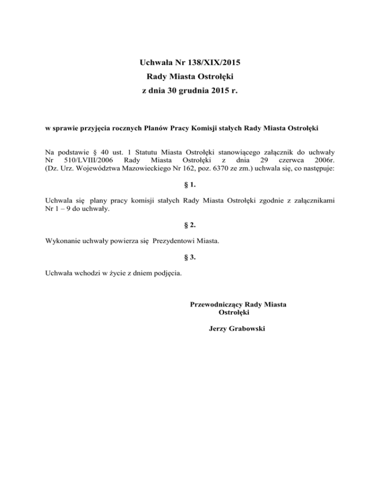 Uchwała Nr 138/XIX/2015 Rady Miasta Ostrołęki z dnia 30 grudnia 2015 r. w sprawie przyjęcia rocznych Planów Pracy Komisji stałych Rady Miasta Ostrołęki Na podstawie § 40 ust. 1 Statutu Miasta Ostrołęki stanowiącego załącznik do uchwały Nr 510/LVIII/2006 Rady Miasta Ostrołęki z dnia 29 czerwca 2006r. (Dz. Urz. Województwa Mazowieckiego Nr 162, poz. 6370 ze zm.) uchwala się, co następuje: § 1. Uchwala się plany pracy komisji stałych Rady Miasta Ostrołęki zgodnie z załącznikami Nr 1 – 9 do uchwały. § 2. Wykonanie uchwały powierza się Prezydentowi Miasta. § 3. Uchwała wchodzi w życie z dniem podjęcia. Przewodniczący Rady Miasta Ostrołęki Jerzy Grabowski Załącznik nr 1 do uchwały Nr 138/XIX/2015 Rady Miasta Ostrołęki z dnia 30 grudnia 2015r. PLAN PRACY KOMISJI REWIZYJNEJ na 2016 rok L.p. 1. 2. 3. TEMATYKA TERMIN REALIZACJI Przeprowadzenie kontroli budżetu Miasta za 2015 rok i wystąpienie z wnioskiem do RIO o opinię w sprawie udzielenia absolutorium dla Prezydenta Miasta. I półrocze Rozpatrzenie projektu uchwały Rady Miasta wraz z wnioskiem Komisji Rewizyjnej w sprawie udzielenia Prezydentowi Miasta absolutorium z tytułu działalności finansowej miasta za 2015 rok, oraz sprawozdania Prezydenta Miasta Ostrołęki z wykonania budżetu miasta za 2015 rok. I półrocze na bieżąco Kontrole zlecone przez Radę Miasta. 4. Inne kontrole przeprowadzane w miarę zaistniałych potrzeb. na bieżąco 5. Analiza projektu budżetu miasta na 2017 rok. IV kwartał Przewodniczący Komisji Rewizyjnej /-/ Edward Górecki Załącznik nr 2 do uchwały Nr 138/XIX/2015 Rady Miasta Ostrołęki z dnia 30 grudnia 2015r. PLAN PRACY KOMISJI BUDŻETU i FINANSÓW na 2016 rok Lp. 1. 2. TEMATYKA TERMIN REALIZACJI Tematy wynikające z przyjętego Planu Pracy Rady Miasta Ostrołęki na 2016 r. Rozpatrywanie projektów uchwał Rady Miasta w sprawie zmiany uchwały budżetowej na 2016 rok wraz z wieloletnią prognozą finansową na lata 2016-2026, na bieżąco na bieżąco 3. Analiza finansowa rocznego sprawozdania z wykonania uchwały budżetowej za 2015 rok. II kwartał 4. Rozpatrzenie sprawozdań finansowych oraz sprawozdań z działalności Spółek z większościowym udziałem Miasta za 2015 rok. maj-czerwiec 5. Informacja o przebiegu wykonania budżetu Miasta Ostrołęki oraz o przebiegu wykonania planów finansowych samorządowych instytucji kultury za I półrocze 2016 roku wraz z Informacją o kształtowaniu się wieloletniej prognozy finansowej, w tym o przebiegu realizacji przedsięwzięć za I półrocze 2016 roku, 6. Rozpatrzenie projektu uchwały Rady Miasta Ostrołęki w sprawie wieloletniej prognozy finansowej Miasta Ostrołęki na lata 2017-2026 oraz projektu uchwały w sprawie uchwalenia uchwały budżetowej na 2017 rok wraz z wnioskami zgłoszonymi podczas prac Komisji Rady Miasta Ostrołęki. wrzesień- październik grudzień Przewodnicząca Komisji Budżetu i Finansów /-/ Ewa Żebrowska-Rosak Załącznik nr 3 do uchwały Nr 138/XIX/2015 Rady Miasta Ostrołęki z dnia 30 grudnia 2015r. PLAN PRACY KOMISJI GOSPODARKI KOMUNALNEJ, INFRASTRUKTURY TECHNICZNEJ I OCHRONY ŚRODOWISKA na 2016 rok Lp. 1. 2. 3. 4. 5. TEMATYKA Tematy wynikające z przyjętego Planu Pracy Rady Miasta na 2016 rok. Informacja z realizacji Programu edukacji ekologicznej społeczeństwa Ostrołęki ze szczególnym uwzględnieniem selektywnej zbiórki odpadów za 2015 rok. Informacja dotycząca realizacji uchwały w sprawie udzielenia pomocy finansowej na usuwanie pokryć dachowych z materiałów zawierających azbest za 2015 r. Projekt uchwały w sprawie zatwierdzenia taryf dla zbiorowego zaopatrzenia w wodę i zbiorowego odprowadzania ścieków. środków Rozpatrzenie propozycji podziału finansowych na inwestycje wspólne finansowane z budżetu Miasta i udziału finansowego Mieszkańców. 6. Analiza stanu gospodarki odpadami komunalnymi. 7. Wyjazdowe posiedzenie Komisji do Stacji Segregacji Odpadów Komunalnych przy ul. Turskiego. TERMIN REALIZACJI na bieżąco luty marzec marzec – kwiecień kwiecień kwiecień maj – czerwiec Rozpatrzenie sprawozdań finansowych oraz sprawozdań z działalności Spółek z większościowym udziałem Miasta za 2015 rok. czerwiec 9. Objazd inwestycji miejskich: kontynuowanych, nowo rozpoczętych i przygotowywanych. w miarę potrzeb i zgłoszonych wniosków 10. Informacja dotycząca przygotowaniu miasta Ostrołęki do sezonu zimowego. październik 8. Przewodniczący Komisji Gospodarki Komunalnej, Infrastruktury Technicznej i Ochrony Środowiska /-/ Michał Skowroński Załącznik nr 4 do uchwały Nr 138/XIX/2015 Rady Miasta Ostrołęki z dnia 30 grudnia 2015r. PLAN PRACY KOMISJI OŚWIATY RADY MIASTA NA 2016 ROK Lp. 2. TERMIN REALIZACJI styczeń – Zadania wynikające z Planu Pracy Rady Miasta Ostrołęki na 2015 grudzień rok. 2016 Sprawozdanie z wykonania budżetu miasta, dotyczące realizacji marzec zadań z zakresu oświaty i wychowania, informacja o sytuacji 3. Prezentacja książki pt. „Pamięć i tożsamość”. 1. 4. 5. 6. 7. 8. 9. TEMATYKA finansowej jednostek oświatowych za 2015r. marzec Poznanie możliwości korzystania w tzw. „w nowej perspektywie finansowej” z programów pomocowych z UE, przez szkoły, przedszkola i inne placówki oświatowe, dla których Miasto Ostrołęka jest organem prowadzącym. Posiedzenie wyjazdowe do Specjalnego Ośrodka SzkolnoWychowawczego w Ostrołęce. Zapoznanie się z funkcjonowaniem świetlic szkolnych pod kątem liczebności uczniów, frekwencji, zmianowości i zatrudnienia nauczycieli. Analiza wniosków zgłoszonych przez placówki oświatowe o przyznanie nagrody Rady Miasta w Ostrołęce za wyjątkowe osiągnięcia w pracy pozalekcyjnej. Analiza sytuacji oświatowej w zakresie rządowych planów co do zmian w systemie oświaty dotyczących przyjęcia dzieci 6-letnich do klas pierwszych i ewentualnego wygaszania gimnazjów. Zorganizowanie konferencji: „Jan Paweł II – nauczycielem”. Zaopiniowa