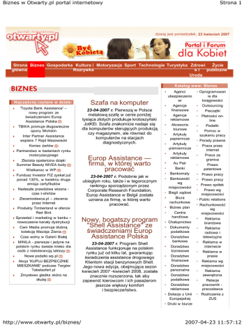 Biznes w Otwarty.pl portal internetowy Strona 1 dzisiaj jest poniedziałek, 23 kwiecień 2007 Strona Biznes Gospodarka Kultura i Motoryzacja Sport Technologie Turystyka Zdrowi Życie główna Rozrywka ei publiczne Uroda Katalog www: Biznes Najczęściej czytane w dziale: Szafa na komputer 'Toyota Bank Assistance' – nowy program ze świadczeniami Europ Assistance Polska TBWA promuje długowieczne opony Michelin Inter Partner Assistance wspiera 7 Rajd Mazowiecki Koniec żartów Partnerstwo w badaniach rynku motoryzacyjnego 23-04-2007 r. Pierwszą w Polsce metalową szafę w cenie poniżej tysiąca złotych produkuje krotoszyński JotKEl. Szafa znakomicie nadaje się dla komputerów sterujących produkcją czy magazynem, ale również do komputerów na stacjach diagnostycznych. Złocista opalenizna dzięki Summer Beauty NIVEA body Wielkanoc w WP Fundusz Investor FIZ zyskał już ponad 130%, w kwietniu druga emisja certyfikatów Nadeszła prawdziwa wiosna czas t-shirtów Zleceniodawca.pl – zlecenia przez Internet Produkty Timberland w ofercie Red Bird Sprzedaż i marketing w banku – nowoczesne kanały dystrybucji Cam Media promuje ślubną kolekcję Macieja Zienia Czas wolny w Galerii Białej MINILA - pierwsze i jedyne na polskim rynku świeże mleko dla osób z nietolerancją laktozy Nowe podatki.wp.pl Akcja 'KUPUJ BEZPIECZNIE MIESZKANIE' podczas Targów Tabelaofert.pl Zmysłowo gładka skóra na dłużej http://www.otwarty.pl/biznes/ Europ Assistance — firma, w której warto pracować 23-04-2007 r. Podobnie jak w ubiegłym roku, także i w tegorocznym rankingu sporządzonym przez Corporate Research Foundation, Europ Assistance w Belgii została uznana za firmę, w której warto pracować. Nowy, bogatszy program "Shell Assistance" ze świadczeniami Europ Assistance Polska 23-04-2007 r. Program Shell Assistance funkcjonuje na polskim rynku już od kilku lat, gwarantując świadczenia assistance drogowego Klientom stacji benzynowych Shell. Jego nowa edycja, obejmująca sezon kwiecień 2007 -kwiecień 2008, została znacznie rozszerzona, tak aby zapewnić kierowcom i ich pasażerom jeszcze większy komfort i bezpieczeństwo. Agenci ubezpieczenio wi Agencje finansowe Agencje reklamowe Akcesoria biurowe Artykuły papiernicze Artykuły piśmiennicze Artykuły reklamowe Au Pair Banki Bankomaty Bankowość wg miejscowości Biegli sądowi Biura rachunkowe Biznes plan Centra handlowe Chałupnictwo Dokumenty podatkowe Doradztwo bankowe Doradztwo biznesowe Doradztwo finansowe Doradztwo personalne Doradztwo podatkowe Doradztwo reklamowe Dotacje z Unii Europejskiej Druki w biurze Oprogramowan ie dla księgowości Outsourcing Pieczątki Płatności online Podatki Pomoc w szukaniu pracy Porady prawne Praca przez internet Praca za granica Prawo patentowe Prawo pracy Prawo pracy Prawo spółek Prawo wg miejscowości Public relations Rachunkowość wg miejscowości Reklama branżowa Reklama radiowa i telewizyjna Reklama w internecie Reklama w prasie Reklama wg miejscowości Reklama zewnętrzna Relacje pracownik pracodawca Rozliczenia z ZUS 2007-04-23 11:57:12