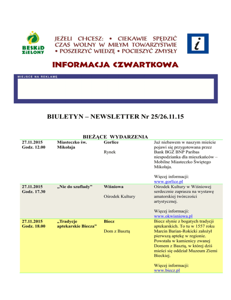 INFORMACJA CZWARTKOWA BIULETYN – NEWSLETTER Nr 25/26.11.15 BIEŻĄCE WYDARZENIA 27.11.2015 Godz. 12.00 Miasteczko św. Mikołaja Gorlice Rynek 27.11.2015 Godz. 17.30 „Nie do szuflady” Wiśniowa Ośrodek Kultury 27.11.2015 Godz. 18.00 „Tradycje aptekarskie Biecza” Biecz Dom z Basztą Już niebawem w naszym mieście pojawi się przygotowana przez Bank BGŻ BNP Paribas niespodzianka dla mieszkańców – Mobilne Miasteczko Świętego Mikołaja. Więcej informacji: www.gorlice.pl Ośrodek Kultury w Wiśniowej serdecznie zaprasza na wystawę amatorskiej twórczości artystycznej. Więcej informacji: www.okwisniowa.pl Biecz słynie z bogatych tradycji aptekarskich. To tu w 1557 roku Marcin Barian-Rokicki założył pierwszą aptekę w regionie. Powstała w kamienicy zwanej Domem z Basztą, w której dziś mieści się oddział Muzeum Ziemi Bieckiej. Więcej informacji: www.biecz.pl 27.11.2015 Godz. 19.00 „Podróże z Osiecką” Biecz Kino „Farys” od: 28.11.2015 do: 29.11.2015 28.11.2015 Godz. 18.00 Kurs instruktora turystyki kwalifikowanej Zabawa Andrzejkowa Zespół Szkół Wstęp wolny. Więcej informacji: www.biecz.pl Zapraszamy osoby zainteresowane ukończeniem kursu o specjalności „Turystyka piesza górska”. Żarnowiec Koszt: 280zł. Więcej informacji: www.ttpik.pl Zapraszamy do zabawy. Szymbark Dom Ludowy 28.11.2015 Godz. 18.00 Zabawa Andrzejkowa Dyrektor Miejsko-Gminnego Ośrodka Kultury w Bieczu, Młodzież z Liceum Ogólnokształcącego w Bieczu oraz Maszynka Kreatywności zapraszają na koncert utworów z tekstami Agnieszki Osieckiej. Moderówka Wstęp: 45zł. od osoby. Więcej informacji: www.jedlicze.pl Zapraszamy do zabawy z zespołem „Heaven”. Dom Strażaka 28.11.2015 Godz. 18.00 28.11.2015 Godz. 19.00 Zabawa Andrzejkowa Zabawa Andrzejkowa Dom Ludowy Wstęp: 120zł. od pary. Więcej informacji: www.jedlicze.pl Rada Sołecka oraz Stowarzyszenia „Nasza Piotrówka” zaprasza na zabawę. Dobieszyn Wstęp: 30zł. od osoby. Więcej informacji: www.jedlicze.pl Zapraszamy do zabawy. Piotrówka Dom Ludowy 29.11.2015 Godz. 8.00 „Jak wspaniale być kobietą” Gorlice Gorlickie Centrum Kultury 29.11.2015 Godz. 16.00 Oratorium „Peregrinus” Zakliczyn Kościół pw. św. Idziego Opata Wstęp: 100zł od pary. Więcej informacji: www.jedlicze.pl Zapraszamy na Warsztaty Rozwoju Osobistego dla Kobiet. Więcej informacji: www.halogorlice.info Oratorium „Peregrinus” to wędrówka tytułowego pielgrzyma, podczas której przypominamy sobie ważne postaci, miejsca i wydarzenia z historii Ziemi Tarnowskiej. 29.11.2015 Godz. 17.00 Artur Andrus – Koncert Jedlicze Sala Rafinerii Orlen Południe 29.11.2015 Godz. 18.00 Kabaret Czwarta Fala Brzostek Dom Kultury 30.11.2015 Godz. 10.00 Spektakl „Jaś i Małgosia” Skołyszyn Gminny Ośrodek Kultury i Czytelnictwa 30.11.2015 Godz. 17.30 Kabaret Młodych Panów Biecz Kino „Farys” 30.11.2015 Godz. 19.00 Santander Orchestra Lusławice Europejskie Centrum Muzyki Krzysztofa Pendereckiego Więcej informacji: www.zakliczyninfo.pl Artur Andrus to artysta multimedialny. Na co dzień redaktor trójkowej “Powtórki z rozrywki”, legendarny gospodarz spotkań kabaretowych w warszawskiej „Piwnicy pod Harendą”, co jakiś czas konferansjer różnych imprez kabaretowych, a poza tym poeta, piosenkarz, dziennikarz, autor książek, tekstów piosenek, bajek, artysta kabaretowy, komentator „Szkła kontaktowego”, Mistrz Mowy Polskiej. www.gok.jedlicze.pl Kabaret Czwarta Fala – kielecka formacja młodego pokolenia, której twórczość opiera się na odnajdywaniu odrealnionych aspektów pozornie normalnych sytuacji. Kabaret ma na koncie 3 autorskie programy, każdy doskonale przyjmowany przez publiczność. Wstęp wolny. Więcej informacji: www.brzostek.pl Gminny Ośrodek Kultury i Czytelnictwa w Skołyszynie zaprasza na spektakl "Jaś i Małgosia" w wykonaniu aktorów z Teatru Maska z Rzeszowa. Spektakl dla przedszkolaków i uczniów z klas I-III. Więcej informacji: www.skolyszyn.pl Zapraszamy do wzięcia udziału. Wstęp: 50zł. Więcej informacji: www.halogorlice.info Zapraszamy wszystkich chętnych na koncert. W programie: K. Penderecki – Concertino na trąbkę i orkiestrę F. Chopin – I Koncert fortepianowy e-moll A. Dvorak – VII Symfonia od: 30.11.2015 do: 05.12.2015 01.12.2015 Godz. 10.00 03.12.2015 Godz. 18.00 od: 03.12.2015 do: 05.12.2015 Nowica – drugie otwarcie Determinanty rozwoju lokalnej przedsiębiorczości Teatralna jesień – „Za rok o tej samej porze” „Lwy, Cezary, Oscary” Gorlice – Uście Gorlickie – Nowica Gorlice Centrum Kształcenia Praktycznego i Ustawicznego Jasło Jasielski Dom Kultury Rzepiennik Strzyżewski Kino „Za Rogiem” 04.12.2015 Godz. 18.00 04.12.2015 Godz. 18.00 Krzysztof Jakubowski – wernisaż wystawy XXXI Salon Gorlicki Gorlice Dwór Karwacjanów Gorlice Więcej informacji: www.penderecki-center.pl Zapraszamy na różne wydarzenia: warsztaty muzyczne, teatralne oraz plastyczne, wystawy, spektakle oraz koncerty. Więcej informacji: www.usciegorlickie.pl Zapraszamy do udziału w bezpłatnej konferencji. W programie spotkania: innowacyjność, konkurencyjność, budowanie relacji z otoczeniem, tworzenie marki, pozyskiwanie klienta. Zaprezentowane zostaną również doświadczenia osób uczestniczących w projekcie „Lokalne inicjatywy na rzecz rozwoju regionalnego powiatu gorlickiego i nowosądeckiego”. Więcej informacji: www.terazgorlice.pl „Za rok o tej samej porze” to komedia romantyczna z udziałem Olgi Bończyk i Piotra Gąsowskiego. Wstęp: 70zł. Więcej informacji: www.terazjaslo.pl Kino „Za Rogiem” Serdecznie zaprasza na przegląd filmowy. Więcej informacji: www.rzepiennik.info K. Jakubowski - Urodzony w 1958 w Bielsku Podlaskim. Studia na Wydziale Sztuk Pięknych Uniwersytetu Mikołaja Kopernika w Toruniu w pracowni prof. Adolfa Ryszki. Więcej informacji: www.muzeum.gorlice.pl Doroczna prezentacja Gorlickiego Środowiska Plastycznego – 