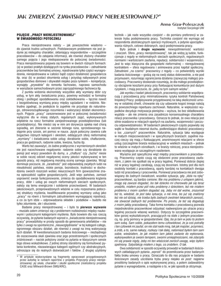 JAK ZMIERZYĆ ZJAWISKO PRACY NIEREJESTROWANEJ?* Anna Giza-Poleszczuk Instytut Socjologii UW POJĘCIE „PRACY NIEREJESTROWANEJ” W ŚWIADOMOŚCI POTOCZNEJ Praca nierejestrowana należy – jak powszechnie wiadomo – do zjawisk trudno uchwytnych. Podstawowym problemem nie jest jedynie jej nielegalny charakter, skłaniający respondentów – szczególnie pracodawców – do zatajania informacji, ale również złożony charakter samego pojęcia i jego niedopasowanie do potocznej świadomości. Praca nierejestrowana pojawia się bowiem w dwóch różnych formach: (a) w postaci praktyk działających na rynku pracodawców – zatrudnianie pracowników bez formalnej umowy, rejestrowanie tylko części wynagrodzenia, nierejestrowana w całości bądź części działalność gospodarcza itp. oraz (b) w postaci strumienia usług i przysług nabywanych przez gospodarstwa domowe i obywateli niejako poza rynkiem – korepetycje, wynajęty „prywatnie” do remontu fachowiec, naprawa samochodu w warsztacie samochodowym przez zaprzyjaźnionego fachowca itp. Z punktu widzenia ekonomisty wszystkie akty wymiany dóbr czy usług, w tym akty świadczenia pracy, powinny wchodzić w formalny obieg i podlegać opodatkowaniu oraz oskładkowaniu – łącznie nawet z bezgotówkową wymianą pracy między sąsiadami i w rodzinie. Nietrudno zgadnąć, że podejście to zupełnie nie przystaje do naturalnego, zdroworozsądkowego rozumienia i waloryzacji działań ekonomicznych. Pojęcie „pracy” zarezerwowane jest w potocznej świadomości wyłącznie dla w miarę stałych, regularnych zajęć, wykonywanych odpłatnie na rzecz formalnie zarejestrowanego przedsiębiorstwa (lub przedsiębiorcy). Nie mieści się w nim ani dorywcza opieka nad chorą sąsiadką, ani zbieranie w sezonie leśnego runa, sprzedawanego następnie przy szosie, ani pomoc w nauce. Język potoczny zawiera całe bogactwo różnych kategorii i określeń, oddających sferę nieformalnej „wymiany” i świadczenia sobie usług: dorabianie sobie, chałturzenie, praca po godzinach, radzenie sobie, lewizna, fucha itp. Warto też zauważyć, że żadne praktycznie z wymienionych określeń nie jest nacechowane negatywnie: radzenie sobie czy dorabianie do pensji jest wręcz powodem do dumy, a „chałtura” czy „fucha” niesie w sobie raczej odcień negatywnej oceny jakości wykonywanej w ten sposób pracy, niż negatywną moralną ocenę samego zjawiska. Wciąż dominuje poczucie, że „zaradność” jest odpowiedzią zwykłych ludzi na nieudolność państwa, niskie pensje, bezrobocie, trudności w dochodzeniu swoich roszczeń wobec nieuczciwych firm (powszechnie znana opieszałość sądów gospodarczych). Jeśli więc państwo, zamiast usprawnić swoje funkcjonowanie, zmierza do opodatkowania krążenia pracy, dóbr i usług po owych nieformalnych sieciach społecznych, należy się temu energicznie i solidarnie przeciwstawić. W badaniach jakościowych, przeprowadzonych właśnie w celu rozpoznania potocznej struktury myślenia, kwalifikowanie prywatnej wymiany usług jako „pracy” na równi z formalnym zatrudnieniem wymagającej rejestracji, a co za tym idzie – odprowadzania składek i podatków – budziło nie tylko zdumienie, ale i oburzenie. Badanie pracy nierejestrowanej – i było to pierwsze wyzwanie – musiało zatem zmierzyć się z problemem rozbieżności między naukowymi i potocznymi kategoriami myślenia. Było bowiem dla nas rzeczą oczywistą, że pytanie badanych wprost o „świadczenie nierejestrowanej pracy” prowadziłoby w prosty sposób do generowania artefaktów – nie tylko z uwagi na spontaniczne „nieuwzględnianie” w tej kategorii całego, ogromnego obszaru działań, ale również z uwagi na inną waloryzację tych działań. W kwestionariuszach badania ilościowego – niezbędnego do oszacowania skali zjawiska oraz jego przestrzennych i społecznych zróżnicowań – nacisk położony został na pytania w klasycznym sensie tego słowa wskaźnikowe. Z jednej strony staraliśmy się formułować pytania konkretne, niezawierające kategorii ogólnych czy abstrakcyjnych, odnoszące się do realnych doświadczeń i faktów. Z drugiej użyliśmy * W artykule wykorzystane są fragmenty opracowań przygotowanych przez autorkę w ramach raportów z projektu Przyczyny pracy nierejestrowanej: jej skala, charakter i skutki społeczne (realizatorzy projektu CASE oraz Millward-Brown SMG/KRC). 20 technik – jak nade wszystko conjoint – do pomiaru preferencji w zakresie trybu podejmowania pracy. Technika conjoint nie wymaga od respondenta abstrakcyjnych operacji myślowych, a jedynie uporządkowania różnych, celowo dobranych, opcji podejmowania pracy. Było jednak i drugie wyzwanie: niewspółmierność wartości i znaczeń. Sfera „pracy nierejestrowanej”, tak jak widzą ją ludzie, funkcjonuje z reguły w nieformalnych sieciach społecznych, regulowanych normami i wartościami zaufania, reputacji, solidarności i wzajemności. Jest to więc klasyczna dla gospodarki nieformalnej – nieregulowanej kontraktem – sfera regulowana i animowana przez kapitał społeczny. Zatrudnieni „na czarno” pracownicy z reguły – co potwierdziły wyniki badania ilościowego – godzą się na swój status dobrowolnie, a nie pod przymusem, rozumiejąc ograniczenia działania (zazwyczaj małego) pracodawcy. Pracownicy doskonale rozumieją, że dla małego przedsiębiorcy obciążenie kosztami pracy przy fluktuującej koniunkturze jest dużym ryzykiem, i mają poczucie, że „jadą na tym samym wózku”. Jak wynika z badań jakościowych, pracownicy solidarnie współpracują z pracodawcą przy minimalizowaniu ryzyka kontroli Państwowej Inspekcji Pracy: podpisywanie przygotowanej na taką okoliczność umowy w ostatniej chwili, chowanie się czy udawanie kogoś innego należą do powszechnego repertuaru zachowań. Naturalnie, w większości wypadków decyduje motywacja pieniężna – wyższa, bo bez sk