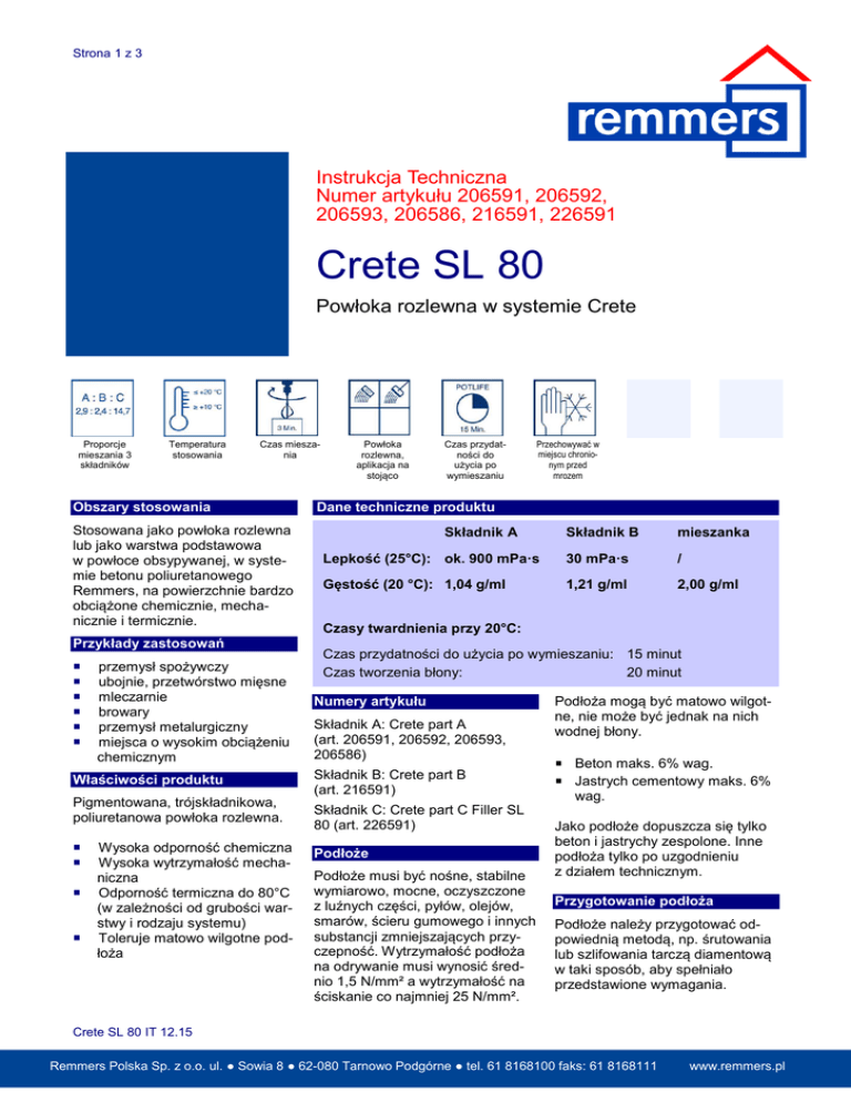 Strona 1 z 3 Instrukcja Techniczna Numer artykułu 206591, 206592, 206593, 206586, 216591, 226591 Crete SL 80 Powłoka rozlewna w systemie Crete Proporcje mieszania 3 składników Temperatura stosowania Czas mieszania Obszary stosowania Stosowana jako powłoka rozlewna lub jako warstwa podstawowa w powłoce obsypywanej, w systemie betonu poliuretanowego Remmers, na powierzchnie bardzo obciążone chemicznie, mechanicznie i termicznie. Przykłady zastosowań przemysł spożywczy ubojnie, przetwórstwo mięsne mleczarnie browary przemysł metalurgiczny miejsca o wysokim obciążeniu chemicznym Właściwości produktu Pigmentowana, trójskładnikowa, poliuretanowa powłoka rozlewna. Wysoka odporność chemiczna Wysoka wytrzymałość mechaniczna Odporność termiczna do 80°C (w zależności od grubości warstwy i rodzaju systemu) Toleruje matowo wilgotne podłoża Powłoka rozlewna, aplikacja na stojąco Czas przydatności do użycia po wymieszaniu Przechowywać w miejscu chronionym przed mrozem Dane techniczne produktu Składnik A Składnik B mieszanka Lepkość (25°C): ok. 900 mPa·s 30 mPa·s / Gęstość (20 °C): 1,04 g/ml 1,21 g/ml 2,00 g/ml Czasy twardnienia przy 20°C: Czas przydatności do użycia po wymieszaniu: 15 minut Czas tworzenia błony: 20 minut Numery artykułu Składnik A: Crete part A (art. 206591, 206592, 206593, 206586) Składnik B: Crete part B (art. 216591) Składnik C: Crete part C Filler SL 80 (art. 226591) Podłoże Podłoże musi być nośne, stabilne wymiarowo, mocne, oczyszczone z luźnych części, pyłów, olejów, smarów, ścieru gumowego i innych substancji zmniejszających przyczepność. Wytrzymałość podłoża na odrywanie musi wynosić średnio 1,5 N/mm² a wytrzymałość na ściskanie co najmniej 25 N/mm². Podłoża mogą być matowo wilgotne, nie może być jednak na nich wodnej błony. Beton maks. 6% wag. Jastrych cementowy maks. 6% wag. Jako podłoże dopuszcza się tylko beton i jastrychy zespolone. Inne podłoża tylko po uzgodnieniu z działem technicznym. Przygotowanie podłoża Podłoże należy przygotować odpowiednią metodą, np. śrutowania lub szlifowania tarczą diamentową w taki sposób, aby spełniało przedstawione wymagania. Crete SL 80 IT 12.15 Remmers Polska Sp. z o.o. ul. ● Sowia 8 ● 62-080 Tarnowo Podgórne ● tel. 61 8168100 faks: 61 8168111 www.remmers.pl Strona 2 z 3 Wyłomy i ubytki w podłożu należy wypełnić używając zapraw mineralnych. Gruntowanie Warstwa gruntującą Crete TF 60 musi być stwardniała, przed układaniem Crete SL 80 (maksymalny czas przed wykonaniem powłoki: 48 godzin przy 20°C). Proporcje mieszania A: 2,9 B: 2,4 C: 14,7 cz. wag. Mieszanie Podczas pracy należy zadbać o odpowiednie wyposażenie ochronne (patrz informacje na temat sprzętu ochrony osobistej). Crete SL 80 to produkt trójskładnikowy. Najpierw należy dobrze wymieszać składnik A (żywicę), następnie dodaje się składnik B (utwardzacz) i ponownie starannie miesza, aż powstanie jednorodna masa bez smug. Mieszankę żywicy z utwardzaczem należy przelać do odpowiedniego pojemnika do mieszania i stopniowo dodawać składnik C (wypełniacz), mieszając tak długo, aż powstanie jednorodna masa bez zbryleń. Do mieszania wypełniaczy z mieszanką żywicy i utwardzacza zalecamy sprawdzone mieszarki z ruchem wymuszonym. Wskazówki wykonawcze Crete SL 80 jest powłoką o charakterze funkcjonalnym. firmy Remmers oraz myjki wysokociśnieniowe. W przypadku stosowania jako warstwa obsypywana należy zagwarantować, aby obsypanie granulatem nastąpiło najpóźniej po 15 minutach (zależnie od temperatury). Podczas czyszczenia należy pamiętać o stosowaniu odpowiednich środków ochronnych (patrz: „Indywidualne środki ochrony”). Na granicach pokrywanych powierzchni należy wykonać odpowiednie nacięcia kotwiące. (Głębokość/szerokość nacięcia jest równa podwojonej grubości systemu powłokowego). Przy jednoczesnym wystąpieniu co najmniej dwóch rodzajów obciążeń (chemiczne, mechaniczne, termiczne) należy się liczyć z ograniczoną wytrzymałością. Na powierzchniach sąsiadujących należy stosować materiał pochodzący z tej samej partii produkcyjnej. Sposób stosowania Wymieszany materiał natychmiast po sporządzeniu nakłada się na przygotowaną powierzchnię i równomiernie rozprowadza za pomocą odpowiednio ustawionej rakli dystansowej. Dla poprawienia rozpływności świeżą warstwę należy koniecznie wałkować wałkiem kolczastym. Temperatura podłoża: min. +10°C maks. +20°C W przypadku powłoki obsypywanej, świeżą, jeszcze płynną warstwę obsypuje się do nasycenia wymaganym materiałem. Temperatura podłoża: min. +10°C maks. +20°C Czas schnięcia Wilgotność względna powietrza: Maks. 85% Można chodzić po: 16 h (20°C) Można chodzić po: 24 h (10°C) Pełne stwardnienie po: 7 dniach Punkt rosy: Podczas aplikacji i twardnienia temperatura podłoża musi być o co najmniej 3°C wyższa od temperatury punktu rosy. Chronić przed kondensatem! Wyższe temperatury skracają, niższe wydłużają czas przydatności wymieszanej masy do użycia. Wskazówki Czyszczenie / utrzymanie Wszystkie podane wartości i wielkości zużycia oznaczone zostały w warunkach laboratoryjnych (20°C). Podczas stosowania na placu budowy mogą wystąpić nieznaczne odchylenia. Zaleca się regularne czyszczenie wykonanego systemu, aby zachować antypoślizgowe właściwości i czysty wygląd posadzki. Do tego celu można stosować normalne środki do czyszczenia posadzek Zużycie 6 10 kg/m² Indywidualne środki ochrony Odpowiednie rękawice z kauczuku nitrylowego (np. Tricotril firmy KCL), okulary ochronne, ochrona przed rozpryskami, koszula z długimi rękawami lub zarękawki. Podczas aplikacji natryskowej materiału o odpowiedniej konsystencji konieczne jest stosowanie rozszerzonego zestawu środków (filtr oddechowy). Patrz w tym celu: karta charakterystyki. Przechowywanie, mieszanie i nakładanie Wa