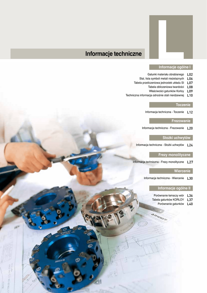 Informacje techniczne L Informacje ogólne I Gatunki materiału obrabianego Stal, lista symboli metali nieżelaznych Tabela przeliczeniowa jednostek układu SI Tabela obliczeniowa twardości Właściwości gatunków Korloy Techniczna informacja odnośnie stali nierdzewnej L02 L06 L07 L08 L09 L10 Toczenie Informacja techniczna - Toczenie L12 Frezowanie Informacja techniczna - Frezowanie L20 Stożki uchwytów Informacja techniczna - Stożki uchwytów L24 Frezy monolityczne Informacja techniczna - Frezy monolityczne L27 Wiercenie Informacja techniczna - Wiercenie L30 Informacje ogólne II Porównanie łamaczy wiór Tabela gatunków KORLOY Porównanie gatunków L36 L37 L40 L Informacje ogólne I Stale węglowe i stopowe konstrukcyjne Typ Stal węglowa Korea KS 1010 SM15C C15E4 C15M2 - S15C 1015 S20C 1020 C25 C25E4 C25M2 C30 C30E4 C30M2 S25C 1025 S30C 1030 C35 C35E4 C35M2 C40 C40E4 C40M2 S35C 1035 S40C 1039 1040 SM43C - S43C SM45C C45 C45E4 C45M2 C50 C50E4 C50M2 S45C 1042 1043 1045 1046 S458C S50C 1049 SM53C - S53C SM55C C55 C55E4 C55M2 S55C 1050 1053 1055 SM58C C60 C60E4 C60M2 S58C SM35C Informacje ogólne I SM40C Stożki Frezowanie Toczenie SM48C SM50C Frezy monolityczne Wiercenie Informacje ogólne II Informacje techniczne Stale chromowe ISO Japonia KS ISO JIS NF NF/EN Rosja ГOCT XC10 - C15E C15R C22 C22E C22R C25 C25E C25R C30 C30E C30R - - C22 C22E C22R C25 C25E C25R C30 C30E C30R - C35 C35E C35R C40 C40E C40R C35 C35E C35R C40 C40E C40R 35Г - - 40Г C45 C45E C45R 080A47 080M50 C50 C50E C50R - C45 C45E C45R C50 C50E C50R C45 C45E C45R C50 C50E C50R 45Г - - 50Г 070M55 C55 C55E C55R C60 C60E C60R C55 C55E C55R C55 C55E C55R - C60 C60E C60R C60 C60E C60R 60Г Wielka Brytania Niemcy BS BS/EN 30Г 40Г 45Г 50Г Francja DIN DIN/EN Rosja NF NF/EN ГOCT 40XH 30XH3A - - - - SNCM415 SNCM420(H) SNCM431 SNCM439 SNCM447 SNCM616 SNCM625 SNCM630 SNCM815 SCr415(H) - - SCr420(H) 5120(H) - 17Cr3 17CrS3 - 20XH2M(20XHM) 15X 15XA 20X SCr430(H) 34Cr4 34CrS4 37Cr4 37CrS4 34Cr4 34CrS4 37Cr4 37CrS4 34Cr4 34CrS4 37Cr4 37CrS4 30X SCr435(H) 5130(H) 5132(H) 5135(H) SCr440(H) 5140(H) 530M40 41Cr4 41CrS4 41Cr4 41CrS4 41Cr4 41CrS4 40X 41CrNiMo2 41CrNiMoS2 - SNCM240 20Cr4(H) 20CrS4 34Cr4 34CrS4 34Cr4 34CrS4 37Cr4 37CrS4 37Cr4 37CrS4 41Cr4 41CrS4 SCr445(H) AISI SAE Francja C10E C10R 070M20 C22, C22E C22R C25 C25E C25R 080A30 080M30 CC30 C30E C30R C35 C35E C35R 080M40 C40 C40E C40R 080A42 U.S.A DIN DIN/EN 20NCD2 SNCM240 SCr440(H) 040A10 045A10 045M10 055M15 Niemcy 15NiCr13 20NiCrMo2 20NiCrMoS2 SNC236 SNC415(H) SNC631(H) SNC815(H) SNC836 SNCM220 SCr435(H) BS BS/EN 655M13(655H13) 805A20 805M20 805A22 805M22 - 15NiCr13 20NiCrMo2 20NiCrMoS2 SCr420(H) Wielka Brytania 8615 8617(H) 8620(H) 8622(H) 8637 8640 4320(H) 4340 - SNC236 SNC415(H) SNC631(H) SNC815(H) SNC836 SNCM220 SNCM415 SNCM420(H) SNCM431 SNCM439 SNCM447 SNCM616 SNCM625 SNCM630 SNCM815 SCr415(H) AISI SAE 1059 1060 Korea SCr430(H) L 02 JIS S10C SM30C Stale chromoniklowe z dodatkiem molibdenu ISO U.S.A C10 SM25C Stale Stale chromosto- niklowe powe Japonia SM10C SM20C Typ ISO SCr445(H) - 35X 45X * Powyższe gatunki stali dostarczane są przez odpowiednich krajowych dostawców Informacje ogólne I Typ Stale Stale sto- chromowomolibdenowe powe Korea ISO Japonia KS ISO JIS 708M20(708H20) - 34CrMo4 34CrMoS4 42CrMo4 42CrMoS4 SCM432 SCM435(H) (4135H) 4137(H) 4140(H) 4142(H) SCM445(H) - SCM445(H) SMn420(H) SMn433(H) 22Mn6(H) - SMn420(H) SMn433(H) 4145(H) 4147(H) 1522(H) 1534 SMn438(H) 36Mn6(H) SMn438(H) 1541(H) 150M36 SMn443(H) 42Mn6(H) SMn443(H) 1541(H) 41CrAlMo74 SMnC420(H) SMnC443(H) SACM645 - NF NF/EN Rosja ГOCT 18CrMo4 18CrMoS4 - - 34CrMo4 34CrMoS4 708M70 709M40 42CrMo4 42CrMoS4 - 34CrMo4 34CrMoS4 42CrMo4 42CrMoS4 34CrMo4 34CrMoS4 42CrMo4 42CrMoS4 - - - 150M19 150M36 - - - - - - - - 30Г2 35Г2 35Г2 40Г2 40Г2 45Г2 - - 20XM 20XM 30XM 30XMA 35XM - * Powyższe gatunki stali dostarczane są przez odpowiednich krajowych dostawców Korea ISO Japonia KS ISO JIS BS BS/EN Niemcy Germany DIN DIN/EN Francja Rosja NF/EN ГOCT France NF "NFNF/EN" BM 2 S6/5/2 Z 85 WDCV BM 35 S6/5/2/5 6-5-2-5 S2/9/2 Informacje ogólne II 105WCr6 105WC13 BD3 X210Cr12 Z200C12 BA2 X100CrMoV5 1 Z100CDV5 BH21 X30WCrV9 3 Z30WCV9 BH13 X40CrMoV5 1 Z40CDV5 55NiCrMoV6 55NCDV7 Informacje techniczne T1 T4 T5 T15 M2 M3-1 M3-2 M4 M 35 M36 M7 M42 F2 L6 W2-9 1/ W2-8 1-2 D3 D2 A2 H21 H11 H13 H12 H10 H19 L6 Wielka Brytania Wiercenie SKH2 SKH3 SKH4 SKH10 SKH51 SKH52 SKH53 SKH54 SKH55 SKH56 SKH57 SKH58 SKH59 SKS11 SKS2 SKS21 SKS5 SKS51 SKS7 SKS8 SKS4 SKS41 SKS43 SKS44 SKS3 SKS31 SKS93 SKS94 SKS95 SKD1 SKD11 SKD12 SKD4 SKD5 SKD6 SKD61 SKD62 SKD7 SKD8 SKT3 SKT4 ANSI SAE Frezy monolityczne HS18-0-1 HS6-5-2 HS6-6-2 HS6-5-3 HS6-5-4 HS6-5-2-5 HS10-4-3-10 HS2-9-2 HS2-9-1-8 105V 105WCr1 210Cr12 100CrMoV5 X30WCrV9-3 X37CrMoV5-1 X40CrMoV5-1 X35CrWMoV5 32CrMoV12-28 55NiCrMoV7 U.S.A Stożki SKH2 SKH3 SKH4 SKH10 SKH51 SKH52 SKH53 SKH54 SKH55 SKH56 SKH57 SKH58 SKH59 STS11 STS2 STS21 STS5 STS51 STS7 STS8 STS4 STS41 STS43 STS44 STS3 STS31 STS93 STS94 STS95 STD1 STD11 STD12 STD4 STD5 STD6 STD61 STD62 STD7 STD8 STF3 STF4 Francja Frezowanie Stale narzędziowe SCM440(H) DIN DIN/EN Toczenie 4130 - Niemcy Informacje ogólne I SCM420(H) SCM430 SCM420(H) SCM430 molibdenowa z dodatkiem aluminium Stale stopowe narzędziowe BS BS/EN - SMnC420(H) SMnC443(H) Stale chromowo- SACM645 Stale szybkotnące Wielka Brytania SCM415(H) SCM418(H) SCM440(H) Typ AISI SAE 18CrMo4 18CrMoS4 - SCM415(H) SCM418(H) SCM432 SCM435(H) Stale manganowe i manganowochromowe U.S.A L * Powyższe gatunki stali dostarczane są przez odpowiednich krajowych dostawców L 03 L Informacje ogólne I Typ Stal węglowa automatowa Typ Stale Stale nierdze- austenityczne wne KS ISO JIS SUM11 SUM12 SUM21 SUM22 SUM22L SUM23 SUM23L SUM24L SUM25 SUM31 SUM31L SUM32 SUM41 SUM42 SUM43 STB1 STB2 STB3 9S20 11SMn28 11SMnPb28 11SMnPb28 12SMn35 44SMn28 B1 B2 SUM11 SUM12 SUM21 SUM22 SUM22L SUM23 SUM23L SUM24L SUM25 SUM31 SUM31L SUM32 SUM41 SUM42 SUM43 SUJ1 SUJ2 SUJ3 STB4 STB5 - SUJ4 SUJ5 ISO Jap