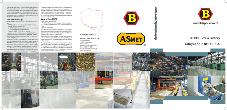 SEPARACJA BARWNA In ASMET Group W grupie ASMET The ASMET Group is comprised of the following companies: • ASMET spółka z ograniczoną odpowiedzialnością sp.k. (Limited Liability Company LLP) • LS ASMET spółka z ograniczoną odpowiedzialnością S.K.A. (Limited Joint-Stock Partnership) • Fabryka Śrub BISPOL S.A. (Screw Factory) In addition to its manufacturing activity, BISPOL S.A. also conducts commercial activity based on both its own production range and the commercial offer of the other companies in the Group. The ASMET Group is two production plants which offer long-run products (BISPOL S.A.) as well as unit products (ASMET Innovation and Implementation Centre in Reguły). In addition, we have two logistic centres, two zinc plating plants and a chain of stores. Utilising the ASMET Group offer and warehouses, we have for more than ten years now been able to service our customers through a Just In Time system – we deliver fasteners directly to assembly lines. Grupę ASMET tworzą spółki: • ASMET spółka z ograniczoną odpowiedzialnością sp.k. • LS ASMET spółka z ograniczoną odpowiedzialnością S.K.A. • Fabryka Śrub BISPOL S.A. Poza działalnością produkcyjną BISPOL S.A. prowadzi też działalność handlową korzystając zarówno z własnej oferty produkcyjnej jak i oferty handlowej pozostałych przedsiębiorstw wchodzących w skład Grupy. Grupa ASMET to dwa zakłady produkcyjne oferujące wyroby wielkoseryjne (BISPOL S.A.) jak i z produkcji jednostkowej (Centrum Innowacyjno-Wdrożeniowe ASMET w Regułach). Poza tym posiadamy dwa centra logistyczne, dwa zakłady nanoszenia powłok cynkowych i sieć sklepów firmowych. Korzystając z oferty i magazynów Grupy ASMET jesteśmy w stanie od ponad dziesięciu lat obsługiwać naszych klientów w systemie Just In Time – dostarczamy elementy złączne bezpośrednio na linie montażowe. SEPARACJA BARWNA doświadczenie, które łączy Cynkownia Fabryki Śrub BISPOL S.A. jest jedną z najnowocześniejszych tego typu w Polsce. Jest przyjazna środowisku naturalnemu, preparaty chemiczne są wolne od metali ciężkich ujętych w dyrektywie RoHS, wszystkie zostały poddane rejestracji zgodnie z REACH, a zastosowane metody neutralizacji odpadów spełniają wymagania Ministerstwa Środowiska. Bielsko Biała C - 0% M - 100% Y - 100% C - 0% M - 0% Y - 100% Contact/Kontakt K - 100% Fabryka Śrub BISPOL S.A. ul. Towarowa 30 43-300 Bielsko-Biała Poland / Polska Phone/tel.: +48 33 499 02 00 Fax: +48 33 499 02 01 e-mail: [email protected] www.bispol.com.pl www.bispol.com.pl C - 0% M - 100% Y - 100% C - 0% M - 0% Y - 100% K - 100% BISPOL Screw Factory Fabryka Śrub BISPOL S.A. Styczeń 2015 The Fabryka Śrub BISPOL S.A. zinc plating plant is one of the most modern plants of the type in Poland. It is environmentally friendly, with the chemicals used being free of heavy metals given in the RoHS Directive, all having been recorded in accordance with REACH, while the waste treatment methods used meet the requirements of the Ministry of the Environment. About us O nas Fabryka Śrub BISPOL S.A. is one of the largest manufacturers of fasteners in Poland and has a tradition which dates back to 1880. Since 2004, BISPOL S.A. has belonged to ASMET Group, comprised of companies which conduct manufacturing and commercial activities in the fastener and fastening technology sector. Years of experience and unending modernisation processes have led to improvement in production based on new technologies and reliable machinery. We are ready for the greatest challenges brought by the speed at which civilisation is currently developing. Our assets are the experience and professionalism of our personnel along with a technically advanced machinery. Our range includes a variety of non-standard products manufactured according to customer documentation, as well as bolts, screws, nuts, washers and other normalised fasteners, along with various modifications with regard to the length and pitch of thread, dimensional tolerances, mechanical property classes and accuracy. The scope of modification depends above all on your needs and expectations. The quality management system in the scope of fasteners manufacturing is certified in compliance with ISO/TS 16949:2009. We have certified environment management system complying with PN-EN ISO 14001:2004 in place. Our heat treatment line is certified for compli- Fabryka Śrub BISPOL S.A. jest jednym z największych w Polsce producentów elementów złącznych. Tradycje firmy sięgają 1880 r. Od 2004r. BISPOL S.A. należy do Grupy ASMET, którą tworzą przedsiębiorstwa prowadzące działalność produkcyjno-handlową w branży elementów złącznych i technik zamocowań. Lata doświadczeń i niekończących się procesów modernizacyjnych prowadziły do doskonalenia produkcji w oparciu o nowe technologie i solidny park maszynowy. Jesteśmy gotowi na największe wyzwania jakie niesie obecne tempo rozwoju cywilizacji. Naszymi atutami są doświadczenie i profesjonalizm załogi oraz zaawansowany technicznie park maszynowy. Asortyment jaki oferujemy obejmuje szeroką gamę wyrobów niestandardowych wykonywanych według dokumentacji klienta, śruby, wkręty, nakrętki, podkładki i inne elementy złączne normowe, oraz ich różne modyfikacje w zakresie długości i skoku gwintu, tolerancji wymiarowych, klas własności mechanicznych oraz dokładności. Zakres modyfikacji jest uzależniony przede wszystkim od Państwa potrzeb oraz oczekiwań. Posiadamy System Zarządzania Jakością w zakresie produkcji wyrobów śrubowych i elementów złącznych, certyfikowany według ISO/TS 16949:2009 oraz certyfikowany system zarządzania środowiskiem zgodny z normą PN-EN ISO 14001:2005. Nasza linia obróbki cieplnej jest ance with AIAG CQI-9 specification and the electroplating line is certified for compliance with AAA specification. certyfikowana na zgodność z wymaganiami specyfikacji AIAG CQI-9, a linia galwanizacyjna