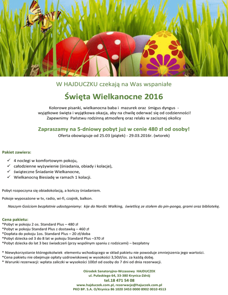W HAJDUCZKU czekają na Was wspaniałe Święta Wielkanocne 2016 Kolorowe pisanki, wielkanocna baba i mazurek oraz śmigus dyngus wyjątkowe święta i wyjątkowa okazja, aby na chwilę oderwać się od codzienności! Zapewnimy Państwu rodzinną atmosferę oraz relaks w zacisznej okolicy Zapraszamy na 5-dniowy pobyt już w cenie 480 zł od osoby! Oferta obowiązuje od 25.03 (piątek) - 29.03.2016r. (wtorek) Pakiet zawiera: 4 noclegi w komfortowym pokoju, całodzienne wyżywienie (śniadania, obiady i kolacje), świąteczne Śniadanie Wielkanocne, Wielkanocną Biesiadę w ramach 1 kolacji. Pobyt rozpoczyna się obiadokolacją, a kończy śniadaniem. Pokoje wyposażone w tv, radio, wi-fi, czajnik, balkon. Naszym Gościom bezpłatnie udostępniamy: kije do Nordic Walking, świetlicę ze stołem do pin-ponga, grami oraz bibliotekę. Cena pakietu: *Pobyt w pokoju 2 os. Standard Plus – 480 zł *Pobyt w pokoju Standard Plus z dostawką – 460 zł *Dopłata do pokoju 1os. Standard Plus – 20 zł/doba *Pobyt dziecka od 3 do 8 lat w pokoju Standard Plus –370 zł *Pobyt dziecka do lat 3 bez świadczeń (przy wspólnym spaniu z rodzicami) – bezpłatny * Niewykorzystanie któregokolwiek elementu wchodzącego w skład pakietu nie powoduje zmniejszenia jego wartości. *Cena pakietu nie obejmuje opłaty uzdrowiskowej w wysokości 3,50zł/os. za każdą dobę. * Warunki rezerwacji: wpłata zaliczki w wysokości 100zł od osoby do 7 dni od dnia rezerwacji. Ośrodek Sanatoryjno-Wczasowy HAJDUCZEK ul. Pułaskiego 64, 33-380 Krynica-Zdrój tel.18 471 54 08 www.hajduczek.com.pl, [email protected] PKO BP. S.A. O/Krynica 86 1020 3453 0000 8902 0010 4513