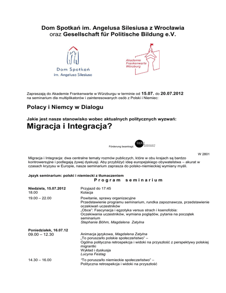 Dom Spotkań im. Angelusa Silesiusa z Wrocławia oraz Gesellschaft für Politische Bildung e.V. Zapraszają do Akademie Frankenwarte w Würzburgu w terminie od 15.07. do 20.07.2012 na seminarium dla multiplikatorów i zainteresowanych osób z Polski i Niemiec: Polacy i Niemcy w Dialogu Jakie jest nasze stanowisko wobec aktualnych politycznych wyzwań: Migracja i Integracja? Förderung beantragt: W 2801 Migracja i Integracja: dwa centralne tematy rozmów publiczych, które w obu krajach są bardzo kontrowersyjne i podlegają żywej dyskusji. Aby przybliżyć ideę europejskiego obywatelstwa – akurat w czasach kryzysu w Europie, nasze seminarium zaprasza do polsko-niemieckiej wymiany myśli. Język seminarium: polski i niemiecki z tłumaczeniem Program seminarium Niedziela, 15.07.2012 18.00 Przyjazd do 17:45 Kolacja 19.00 – 22.00 Powitanie, sprawy organizacyjne Przedstawienie programu seminarium, rundka zapoznawcza, przedstawienie oczekiwań uczestników „Obce”: Fascynacja i egzotyka versus strach i ksenofobia: Oczekiwania uczestników, wymiana poglądów, pytania na początek seminarium Stephanie Böhm, Magdalena Zatylna Poniedziałek, 16.07.12 09.00 – 12.30 Animacja językowa, Magdalena Zatylna „To porusza/ło polskie społeczeństwo” – Ogólna polityczna retrospekcja i widoki na przyszłość z perspektywy polskiej migrantki Wykład i dyskusja Lucyna Festag 14.30 – 16.00 “To porusza/ło niemieckie społeczeństwo” – Polityczna retrospekcja i widoki na przyszłość Wykład i dyskusja Niyazi Akcay 16.30 – 18.30 Obecny stan debaty na temat integracji migrantów w Niemczech: Rozwój społecznych i polityczny, aktualne kwestie i punkty sporne Porównanie z sytuacją w Polsce Homaira Mansury 19.30 „Niemiecko-polski wieczór specjałów“ (zorganizowany wspólnie z kulturowymi i kulinarnymi specjałami przywiezionymi przez uczestników) Wtorek, 17.07.12 09.00 – 12.30 14.00 – 14.30 14.30 – 16.00 16.30 – 18.00 „Czy islam należy do tożsamości Niemiec?” Muzułmanki i Muzułmanie w Niemczech Rabia Ünlü Urząd ds. Cudzoziemców i Integracji w Würzburgu: W jaki sposób migranci angażują się w życie społeczne i polityczne w Würzburgu Natali Soldo-Bilac Wyjazd do miasta Religijne i społeczne życie w gminie muzułmańskiej Wizyta w meczecie, dyskusja Kemal Özkan, Imam Wizyta w Polskiej Misji Katolickiej Osobiste przeżycia migracji i integracji: Dyskusja z księdzem Jerzym Sobotą i członkami Polskiej Misji Po spotkaniu Czas wolny w Würzburgu 20.00 Wizyta w miejskiej winiarni w Würzburgu z degustacją wina Środa, 18.07.12 09.00 – 12.30 Rozgrzewka, animacja językowa, Magdalena Zatylna Europejski Pakt na Rzecz Migracji i Azylu - przegląd Eva Peteler Sytuacja osób dotkniętych „zbiorowym zakwaterowaniem” Eva Peteler i jeden z mieszkańców dotknięty tym problemem 14.00 – 14.30 Wizyta w Gminie Żydowskiej – i Centrum Kultury Shalom Europa 14.30 – 18.00 Powitanie i wprowadzeniedo tematu przez przedstawiciela Żydowskiej Gminy w Bawarii Dr. Josef Schuster Zwiedzanie muzeum i synagogi Dyskusja z członkami Gminy Żydowskiej, którzy po 1989 wyemigrowali z państw wschodnich do Würzburga Po spotkaniu 18.45 20.00 – 21.00 Spacer po mieście Powrót Podzielenie się wrażeniami z całego dnia i wykładu Stephanie Böhm, Magdalena Zatylna Czwartek, 19.07.12 09.00 – 12.30 15.00 – 18.30 Rozgrzewka, animacja językowa, Magdalena Zatylna Obcy we własnym państwie? Wykład i dyskusja z Canaan Topcu i Edgar Weick, Bunter Tisch Höchst Propozycja podczas przerwy popołudniowej:spacer do kaplicy Stereotypy i dyskryminacja – Ogólne psychologiczne uwarunkowania: Antycyganizm w porównaniu z innymi grupami dotkniętymi dyskryminacją Georg Förster, Uniwersytet Würzburg 20.00 Wspólny wieczór pożegnalny Piątek, 20.07.12 09.00 – 11.00 Quo vadis, Europa? Co nas najbardziej interesuje: Kontynuacja różnych tematów (praca w małych gruoach; tematy będą wybierane przez uczestników) Przedstawienie wyników na forum Moderacja: Stephanie Böhm, Magdalena Zatylna 11.15 – 12.15 Ewaluacja seminarium, opracowanie tematów na kolejne seminaria Pożegnanie, Stephanie Böhm, Magdalena Zatylna Zakończenie seminarium, wyjazd W trakcie seminarium w Akademie Frankenwarte będzie można zobaczyć wystawę fotografii Fundacji Friedricha Eberta „W centrum obywatelskiego zaangażowania – imigracja. 20 portretów“ Podczas trwania seminarium dla dorosłych w razie potrzeby będzie propozycja programu alternatywnego dla dzieci. Prowadzące Stephanie Böhm: Magdalena Zatylna Grazyna Wiercimok Agnieszka Kalbarczyk Aleksandra Pilorz Referenci Lucyna Festag Niyazi Akcay Homaira Mansury Natali Soldo-Bilac Rabia Ünlü Jerzy Sobota Kemal Özkan Eva Peteler Dr. Josef Schuster Canaan Topcu Edgar Weick Georg Förster Koordynatorka projektu, prowadząca seminarium, docentka Akademie Frankenwarte Koordynatora projektu, tłumaczka, Dom Spotkań Angelusa Silesiusa Wrocław Nauczycielka, tłumaczka Nauczycielka, tłumaczka Nauczycielka, tłumaczka Absolwentka germanistyki i polonistyki we Wrocławiu, docentka języka niemieckiego jako drugiego języka ojczystego oraz polskiego jako języka obcego, mieszka w Gotha od 2007 roku Politolog, Würzburg Dozentka Akademie Frankenwarte Zarząd Urzędu ds. Cudzoziemców i Integracji w Würzburgu Prawniczka, germanistka, docentka na Uniwersytecie w Würzburgu Ksiądz, Polska Misja Katolicka Imam Lekarka, Würzburg przedstawiciela Żydowskiej Gminy w Bawarii Niezależna dziennikarka Frankfurt/Main Bunter Tisch, Höchst Psycholog, Doktorant na Uniwersytecie Wurzburg Koszty uczestnictwa: Dla uczestników z Polski € 55,00 (dorośli), € 25,00 (dzieci). Opłata obejmuje zakwaterowanie w pokoju dwuosobowym i wyżywienie. Nocleg w pokoju jednoosobowym wynosi 155 €. Dojazd we własnym zakresie. (Możliwe zorganizowanie grupowego przejazdu autokarem). Zgłoszenia proszę wysyłać do 15.06.2012 na adres: [email protected] T