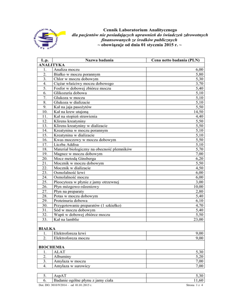 Cennik Laboratorium Analitycznego dla pacjentów nie posiadających uprawnień do świadczeń zdrowotnych finansowanych ze środków publicznych ~ obowiązuje od dnia 01 stycznia 2015 r. ~ L.p. Nazwa badania ANALITYKA 1. Analiza moczu 2. Białko w moczu porannym 3. Chlor w moczu dobowym 4. Ciężar właściwy moczu dobowego 5. Fosfor w dobowej zbiórce moczu 6. Glikozuria dobowa 7. Glukoza w moczu 8. Glukoza w dializacie 9. Kał na jaja pasożytów 10. Kał na krew utajoną 11. Kał na stopień strawienia 12. Klirens kreatyniny 13. Klirens kreatyniny w dializacie 14. Kreatynina w moczu porannym 15. Kreatynina w dializacie 16. Kwas moczowy w moczu dobowym 17. Liczba Addisa 18. Materiał biologiczny na obecność plemników 19. Magnez w moczu dobowym 20. Mocz metodą Ginsberga 21. Mocznik w moczu dobowym 22. Mocznik w dializacie 23. Osmolalność krwi 24. Osmolalność moczu 25. Pleocytoza w płynie z jamy otrzewnej 26. Płyn mózgowo-rdzeniowy 27. Płyn na preparaty 28. Potas w moczu dobowym 29. Proteinuria dobowa 30. Przygotowanie preparatów (1 szkiełko) 31. Sód w moczu dobowym 32. Wapń w dobowej zbiórce moczu 33. Kał na lamblie Cena netto badania (PLN) 6,00 5,80 5,30 3,70 5,40 5,10 5,10 5,10 5,50 14,50 4,40 5,50 5,50 5,10 5,10 5,50 5,10 5,70 7,00 6,20 5,50 4,50 6,00 6,00 3,00 10,00 2,80 5,40 6,10 4,70 5,40 5,50 23,00 BIAŁKA 1. Elektroforeza krwi 2. Elektroforeza moczu 9,00 9,00 BIOCHEMIA 1. ALAT 2. Albuminy 3. Amylaza w moczu 4. Amylaza w surowicy 5,30 5,20 7,00 7,00 5. 6. AspAT Badanie ogólne płynu z jamy ciała Dot. DO. 3010/9/2014 – od 01.01.2015 r. 5,30 11,60 Strona 1 z 4 7. 8. 9. 10. 11. 12. 13. 14. 15. 16. 17. 18. 19. 20. 21. 22. 23. 24. 25. 26. 27. 28. 29. 30. 31. 32. 33. 34. 35. 36. 37. 38. 39. 40. 41. 42. 43. 44. 45. Białko c-reaktywne Białko całkowite Bilirubina bezpośrednia Bilirubina całkowita Chlor w surowicy Cholesterol Cholesterol HDL CK CK-MB aktywność Krzywa cukrowa (4 oznaczenia) Krzywa cukrowa (3 oznaczenia) Krzywa cukrowa (2 oznaczenia) Elektrolity (K, Na) Fosfataza alkaliczna Fosforany nieorganiczne Gazometria, K, Na, Ca zjon. GGTP Glukoza z palca na czczo Glukoza we krwi: 2 godz. po posiłku Glukoza z żyły na czczo Hemoglobina glikowana HbA1c Kreatynina Krzywa żelazowa Kwas moczowy LDH Lipaza Magnez Mocznik Odwirowanie i przygotowanie surowicy Płyn stawowy – badanie ogólne Płyn z jamy opłucnej – badanie ogólne Płyn z jamy otrzewnej – badanie ogólne Płyn z osierdzia – badanie ogólne Transferyna Trójglicerydy Wapń całkowity Wapń zjonizowany Wskaźniki nerkowe Żelazo HEMATOLOGIA 1. Morfologia 5 DIFF z rozmazem (automat) 2. Morfologia z rozmazem (ręczny) 3. Oporność osmotyczna erytrocytów 4. Przygotowanie i barwienie preparatów ( 1 szk.) 5. Retikulocyty 6. Test na mononukleozę zakaźną 7. Trombocyty w komorze Burkera 8. Wybarwienie i ocena szpiku 9. Wybarwienie szpiku (1 szkiełko) IMMUNOLOGIA 1. Anty-HCV ujemny Dot. DO. 3010/9/2014 – od 01.01.2015 r. 8,00 5,20 5,70 5,70 5,40 5,50 7,90 5,80 21,20 7,40 4,90 3,80 5,30 6,10 5,30 8,00 5,40 3,00 3,00 3,00 14,60 5,10 11,00 5,50 6,00 27,00 6,90 5,50 4,50 11,60 11,60 11,60 11,60 12,30 7,00 5,50 5,60 8,00 6,30 6,50 7,00 5,20 5,50 5,20 12,40 6,20 7,20 5,70 25,50 Strona 2 z 4 2. 3. 4. 5. 6. 7. 8. 9. 10. 11. 12. 13. 14. 15. 16. 17. 18. 19. 20. 21. 22. 23. 24. 25. 26. 27. 28. 29. 30. 31. 32. 33. 34. 35. 36. 37. 38. Anty-HCV dodatni Antygen HBs ujemny Anty-tyreoglobulinowe p-ciała (a-TG) Anty-mikrosomalne p-ciała (a-TPO) BNP-peptyd natriuretyczny Ca-125 CEA Ca 19.9 Ca 15.3 DHES AFP CK-MB mass Estradiol Ferrytyna FSH FT3 (Access) FT4 (Access) HCG IgE całk. Insulina (Access) Insulina po stymulacji Kortyzol w moczu Kortyzol w surowicy (po południu) Kortyzol w surowicy (rano) Kwas foliowy LH Progesteron Prolaktyna (PRL) Parathormon (PTH) Prolaktyna po metoklopramidzie t. PSA Test potwierdzenia AgHBS Testosteron Troponina I (access) TSH (Access) Witamina B12 Witamina D (25 OH D) KOAGULOLOGIA 1. APTT 2. D-dimery 3. Fibrynogen 4. Układ krzepnięcia 5. Układ krzepnięcia z FIBRYNOGENEM 6. Wskaźnik protrombinowy (INR) POBIERALNIA 1. OB. PRACOWNIA BAKTERIOLOGII 1. ASO 2. Czynnik reumatoidalny (RF) 3. Odczyn Rosse’go-Walera 4. Przeciwciała przeciwjądrowe anty-nDNA 5. Przeciwciała przeciwko Helicobacter pylori Dot. DO. 3010/9/2014 – od 01.01.2015 r. 47,20 14,00 18,50 18,50 57,50 23,00 17,00 25,00 25,00 25,00 17,50 14,00 16,20 11,20 14,20 12,60 11,70 15,40 15,40 15,40 15,40 12,00 12,00 12,00 23,00 14,70 11,40 17,00 29,00 17,00 17,60 26,40 17,00 15,50 11,00 14,30 32,00 7,62 26,40 12,87 8,69 15,40 7,62 5,70 10,00 10,00 12,30 11,00 10,10 Strona 3 z 4 6. 7. 8. 9. 10. 11. 12. 13. 14. Test w kierunku kiły (W-R) Test w kierunku kiły (W-R) dodatni HIV-ujemny HIV-dodatni Przeciwciała anty-HBS Toksoplazmoza IgG Toksoplazmoza IgM Prokalcytonina Clostridum difficile POSIEWY 1. Posiew ujemny (wymaz) 2. Posiew ujemny (mocz) 3. Posiew dodatni z antybiogramem 4. Posiew krwi ujemny 5. Posiew krwi dodatni z antybiogramem 6. Posiew płynu mózgowo-rdzeniowego ujemny 7. Posiew płynu mózgowo-rdzeniowego dodatni 8. Badanie bakteriologiczne wody 9. Identyfikacja grzybów drożdżopodobnych 10. Identyfikacja + mykogram grzybów 11. Badanie czystości powierzchni 12. Wymaz w kierunku Salmonella-Shigella 13. Wymaz w kierunku Salonella-Shigella dodatni 14. Diagnostyka patogenu alarmowego Główny Księgowy Samodzielnego Publicznego Szpitala Wojewódzkiego im. Papieża Jana Pawła II w Zamościu (-) mgr Andrzej Gryn Dot. DO. 3010/9/2014 – od 01.01.2015 r. 8,80 18,70 23,10 257,40 38,10 30,50 34,60 75,00 61,60 13,00 13,00 32,00 45,00 72,60 44,80 81,40 8,80 35,20 58,00 14,00 11,00 27,50 89,00 Dyrektor Samodzielnego Publicznego Szpitala Wojewódzkiego im. Papieża Jana Pawła II w Zamościu (-) lek. med. Andrzej Mielcarek Strona 4 z 4