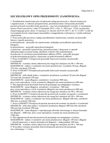 Załącznik nr 1 SZCZEGÓŁOWY OPIS PRZEDMIOTU ZAMÓWIENIA 1. Przedmiotem zamówienia jest świadczenie usług pocztowych w obrocie krajowym i zagranicznym, w zakresie przyjmowania, przemieszczania i doręczania przesyłek pocztowych pod wszystkie kody pocztowe , oraz ich ewentualnych zwrotów w rozumieniu ustawy Prawo pocztowe z dnia 23 listopada 2012 r. (Dz. U. 2012 poz. 1529), na potrzeby Zamawiającego przez okres 12 miesięcy (w okresie od 01.01.2017 r. do 31.12.2017 r.).lub do wyczerpania kwoty stanowiącej maxymalne wynagrodzenie wykonawcy z tytułu realizacji zamówienia 2. Przez przesyłki pocztowe, będące przedmiotem zamówienia, rozumie się przesyłki listowe i paczki pocztowe: a) ekonomiczne - przesyłki nie rejestrowane, niebędące przesyłkami najszybszej kategorii, b) priorytetowe - przesyłki najszybszej kategorii, c) polecone - przesyłki rejestrowane, przemieszczane i doręczone w sposób zabezpieczające je przed utratą, ubytkiem wartości lub uszkodzeniem, d) polecone za zwrotnym potwierdzeniem odbioru (ZPO) - przesyłki przyjęte za pokwitowaniem przyjęcia i doręczane za pokwitowaniem odbioru. 3. Przez GABARYT A krajowych przesyłek listowych rozumie się przesyłki o wymiarach: MINIMUM - wymiary strony adresowej nie mogą być mniejsze niż 90 x 140 mm, MAKSIMUM - żaden z wymiarów nie może przekroczyć: wysokość 20 mm, długość 325 mm, szerokość 230 mm. 4. Przez GABARYT B krajowych przesyłek listowych rozumie się przesyłki o wymiarach: MINIMUM - jeśli chodź jeden z wymiarów przekracza wysokość 20 mm lub długość 325 mm lub szerokość 230 mm, MAKSIMUM - suma długości, szerokości i wysokości 900 mm, przy czym największy z tych wymiarów (długość) nie może przekroczyć 600 mm. 5. Dla zagranicznych przesyłek listowych przyjmuje się następujące wymiary: MAKSIMUM - suma długości, szerokości i wysokości - 900 mm, przy czym największy z tych wymiarów (długość) nie może przekroczyć 600 mm, MINIMUM - wymiary strony adresowej nie mogą być mniejsze niż 90 x 140 mm. 6. Przez GABARYT A krajowych paczek pocztowych rozumie się paczki o wymiarach: MINIMUM - wymiary strony adresowej nie mogą być mniejsze niż 90 x 140 mm, MAKSIMUM - żaden z wymiarów nie może przekroczyć: długość 600 mm, szerokość 500 mm, wysokość 300 mm. 7. Przez GABARYT B krajowych paczek pocztowych rozumie się paczki o wymiarach: MINIMUM - jeśli choć jeden z wymiarów przekracza długość 600 mm lub szerokość 500 mm lub wysokość 300 mm, MAKSIMUM - suma długości i największego obwodu mierzonego w innym kierunku niż długość - 3000 mm, przy czym największy wymiar nie może przekroczyć 1500 mm. 8. Dla zagranicznych paczek pocztowych przyjmuje się następujące wymiary: MAKSIMUM - żaden z wymiarów nie może przekroczyć: długość 150 mm i długość + obwód (mierzony w innym kierunku niż długość) = maksymalnie 300 mm, MINIMUM - wymiary strony adresowej nie mogą być mniejsze niż 90 x 140 mm. 9. Wszystkie wymiary przesyłek listowych/paczek pocztowych przyjmuje się z tolerancją +/- 2 mm. 10.Wykonawca zobowiązany jest do codziennego tj. od poniedziałku do piątku między godz. 7.30 a 11.00 świadczenia usługi doręczania przesyłek do siedziby Zamawiającego (ul. Wąwozowa 34 w Krakowie) przez upoważnionego przedstawiciela Wykonawcy 11.Wykonawca zobowiązany jest co najmniej 3 razy w tygodniu w dni robocze (poniedziałek, środa i piątek) między godziną 13.30 a 14.30 świadczyć usługi odbioru przesyłek do wysyłki z siedziby Zamawiającego (ul. Wąwozowa 34 w Krakowie) przez upoważnionego przedstawiciela Wykonawcy Odbiór przesyłek do wysyłki będzie każdorazowo odbywał się na podstawie przygotowanych przez Zamawiającego pocztowych książek nadawczych i/lub zestawień ilościowych (w dwóch egzemplarzach). Zamawiający zobowiązuje się także do przekazywania przesyłek w stanie uporządkowanym tj. przekazaniu przesyłek ułożonych stroną adresową w tym samym kierunku według kolejności wpisów w pocztowej książce nadawczej lub zestawieniu ilościowym. 12. Zamawiający zobowiązuje się do umieszczania na przesyłkach listowych lub paczkach nazwy odbiorcy wraz z jego adresem (tożsamej z danymi wskazanymi w pocztowej książce nadawczej) oraz określania rodzaju przesyłek (polecona, priorytet, zwrotne potwierdzenie odbioru). 13. Opakowanie przesyłek listowych stanowi koperta Zamawiającego, odpowiednio zabezpieczona lub zaklejona. Opakowanie paczki pocztowej powinno gwarantować zabezpieczenie przed dostępem do jej zawartości oraz uniemożliwiać uszkodzenie zawartości paczki w czasie przemieszczania. 14. Wykonawca będzie doręczał do siedziby Zamawiającego pokwitowanie odbioru przesyłek do nadania (egzemplarz pocztowej książki nadawczej lub zestawienia ilościowego), na którym w przypadku przesyłek rejestrowanych naniesione zostaną ich numery nadawcze oraz pieczęcie z datą nadania tożsamą z datą przekazania Wykonawcy przesyłek do wysyłki. 15. Usługę pocztową w zakresie przesyłek rejestrowanych Zamawiający będzie uważał za niewykonaną, jeśli doręczenie przesyłki rejestrowanej lub zawiadomienia o próbie jej doręczenia nie nastąpiło w terminie 14 dni od dnia nadania. 16. Zwrot przesyłek (rejestrowanych w obrocie krajowym) do Zamawiającego (po wyczerpaniu możliwości doręczenia lub wydania odbiorcy) odbędzie się za opłatą jak za daną przesyłkę rejestrowaną nadaną jako przesyłka ekonomiczna (określona w cenniku ofertowym przewidywana ilość szt. przesyłek pocztowych dotyczy również ewentualnych zwrotów). 17. Zwrot przesyłek priorytetowych (rejestrowanych w obrocie zagranicznym) do Zamawiającego (po wyczerpaniu możliwości doręczenia lub wydania odbiorcy) odbędzie się za opłatą jak za przesyłkę poleconą ekonomiczną w obrocie krajowym o tej samej masie i o gabarycie A (określona w cenniku ofertowym przewidywana ilość szt. przesyłek po