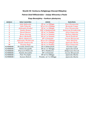 Wyniki XX Konkursu Religijnego Diecezji Elbląskiej Patron Dzieł Miłosierdzia – święty Wincenty a Paulo miejsce 1 2 3 3 4 5 6 7 8 9 10 wyróżnienie wyróżnienie wyróżnienie wyróżnienie wyróżnienie wyróżnienie Etap diecezjalny – konkurs plastyczny imię i nazwisko Julia Sulkowska Julia Tyburska Aleksandra Konkol Sandra Roman Dawid Maziarz Bruno Doering Borys Michalski Maria Adamowicz Aleksander Wróblewski Rozalia Zambrzycka Zuzanna Rapp Weronika Sobolewska Nikola Dowgiałło Wojciech Witkowski Natalia Zawadzka Piotr Pocełujko Szymon Rokicki szkoła SP nr 1 w Elblągu SP nr 14 w Elblągu SP nr 1 w Elblągu SSP w Rudzienicach SP nr 3 w Pasłęku SP nr 2 w Sztumie SP nr 2 w Sztumie SP w Zwierznie SP nr 18 w Elblągu SP nr 8 w Elblągu SP nr 3 w Pasłęku ZS w Dobrzykach SP nr 2 w Morągu SP w Piotrkowie SP w Zwierznie SP nr 8 w Elblągu Przedsz. nr 5 w Elblągu katecheta Ewa Chrostowska Bernarda Cempa Ewa Chrostowska Katarzyna Kwiatkowska Alicja Gumowska Barbara Małyska Darek Świderski Lucyna Skrzypczak Anna Mienicka Agnieszka Mucha Alicja Gumowska Krystian Czaja Agnieszka Górak Małgorzata Dziczek Lucyna Skrzypczak Agnieszka Mucha Agnieszka Mucha