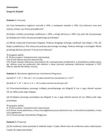 Gimnazjum Grupa 8: Związki Zadanie 1. Procenty (a) Cena komputera najpierw wzrosła o 10%, a następnie zmalała o 10%. Czy końcowa cena jest wyższa, niższa, czy równa początkowej? (b) Jeden z boków prostokąta wydłużono o 20%, a drugi skrócono o 20%. Czy pole tak otrzymanego prostokąta jest różne od pola początkowego prostokąta? (c) Mirek rozpoczął trenowanie biegania. Podczas drugiego treningu wydłużył czas biegu o 5%, ale biegł z prędkością o 5% niższą niż podczas pierwszego treningu. Podczas którego z treningów Mirek przebiegł dłuższy dystans? O ile procent dłuższy? Wymagania ogólne: II. Wykorzystanie i interpretowanie reprezentacji. 5.2) Uczeń oblicza procent danej liczby. 5.4) Uczeń stosuje obliczenia procentowe do rozwiązywania problemów w kontekście praktycznym, np. oblicza ceny po podwyżce lub obniżce o dany procent, wykonuje obliczenia związane z VAT, oblicza odsetki dla lokaty rocznej. Zadanie 2. Wyrażenia algebraiczne, twierdzenie Pitagorasa (a) Jeśli i , to jaką wartość ma wyrażenie ( (b) Jeśli i , to jaką wartość ma iloczyn ) ? ? (c) Przeciwprostokątna pewnego trójkąta prostokątnego ma długość 8 cm, a jego obwód wynosi 18 cm. Oblicz pole tego trójkąta. (d) Przekątna pewnego prostokąta ma długość 5 cm, a jego obwód wynosi 22 cm. Oblicz pole tego prostokąta. Wymagania ogólne: II. Wykorzystanie i interpretowanie reprezentacji. 6.5) Uczeń mnoży jednomiany, mnoży sumę algebraiczną przez jednomian oraz, w nietrudnych przykładach, mnoży sumy algebraiczne. 10.7) Uczeń stosuje twierdzenie Pitagorasa. Zadanie 3. Proporcje (a) Do zrobienia ciasta potrzeba 2 szklanki mąki i 3 jajka. Marta chce do zrobienia ciasta wykorzystać 5 jajek. Ile mąki potrzebuje? (b) Prostokąt o bokach długości 2 cm i 3 cm jest podobny do prostokąta, którego boki mają długości k cm i ( ) cm. Oblicz długości boków większego prostokąta. (c) Podczas pierwszego treningu Ola przebiegła 2 km w czasie t minut. Podczas następnego treningu Ola przebiegła 5 km w czasie o 24 minut dłuższym. W obu wypadkach Ola biegła z tą samą średnią prędkością. Jak długo trwał bieg na jej pierwszym treningu? Wymagania ogólne: II. Wykorzystanie i interpretowanie reprezentacji. 7.1) Uczeń zapisuje związki między wielkościami za pomocą równania pierwszego stopnia z jedną niewiadomą, w tym związki między wielkościami wprost proporcjonalnymi i odwrotnie proporcjonalnymi. 7.3) Uczeń rozwiązuje równania stopnia pierwszego z jedną niewiadomą.