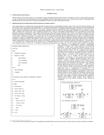 Podstawy Programowania semestr drugi Wykład czwarty 1. Dwukierunkowa lista liniowa Dwukierunkowa lista liniowa różni się w niewielkim stopniu od jednokierunkowej listy liniowej. Zasadnicza różnica w funkcjonalności polega na tym, że elementy listy dwukierunkowej możemy przeglądać zarówno od początku do końca, jak i od końca do początku. W przypadku listy jednokierunkowej, jak sama nazwa wskazuje, przeglądanie możliwe jest tylko od początku do końca. 2. Implementacja listy dwukierunkowej jako dynamicznej struktury danych Lista dwukierunkowa, podobnie jak jej poprzedniczka zostanie opisana na przykładzie programu, który wstawia do niej kolejne elementy, tak aby wartości, które one przechowują znajdowały się w porządku niemalejącym. Definicja typu pojedynczego elementu listy dwukierunkowej zawiera dwa pola wskaźnikowe (wiersze 5-9). Pole „next” przeznaczone jest na zapamiętanie adresu następnego elementu w liście, pole „prev” będzie służyło do przechowywania adresu poprzedniego elementu. Wartość tego pola dla pierwszego elementu na liście będzie wynosiła „NIL”, podobnie jak wartość pola „next” ostatniego elementu listy. Tak jak w przypadku jednokierunkowej listy potrzebujemy tylko jednej globalnej zmiennej wskaźnikowej, która będzie przechowywała adres pierwszego elementu listy 1 (wiersz 11). Pierwszy element listy jest tworzony przy pomocy procedury „create”. Może ona również służyć do wstawiania nowych elementów do listy, gdyż wywołuje procedurę „insert_node”, realizującą tę operację. Ta ostatnia różni się od swojej odpowiedniczki dla listy jednokierunkowej, tym że w jej kodzie zawarte są operacje związane z manipulacją zawartością pola „prev” elementu i że nie potrzebuje dodatkowej zmiennej lokalnej, która pamiętałaby wskaźnik na poprzedni element. Procedura ta ma dwa parametry. Przez pierwszy pobiera wskaźnik pierwszego elementu listy, natomiast poprzez drugi pobiera wartość, którą należy umieścić w elemencie. Posiada ona również dwie lokalne zmienne wskaźnikowe. W wierszach (18 21) tworzony jest i inicjalizowany nowy element listy, z uwzględnieniem pola „prev”, któremu należy nadać wartość początkową „NIL”. Jeśli warunek zawarty w wierszu 22, w instrukcji warunkowej jest prawdziwy, to oznacza to, że nowy element należy umieścić na początku listy. Wymaga to następujących operacji: zapamiętania wskaźnika na element listy, który dotychczas był pierwszym 1 program double_linked_list; elementem w polu „next” nowego elementu (wiersz 24). W 2 uses crt; polu „prev” pierwszego elementu listy należy zapamiętać adres nowego elementu (wiersz 25). Po wykonaniu tych operacji 3 type pozostaje jeszcze uczynić nowy element pierwszym elementem listy (wiersz 26) i zakończyć działanie procedury. Częściej się 4 wskaznik=^element; jednak zdarza, że musimy nowy element wstawić nie na początku listy, lecz w środku lub na końcu. Ponieważ 5 element = record założyliśmy, że elementy w liście powinny być posortowane 6 dana:integer; niemalejąco pod względem przechowywanych przez nie wartości, wystarczy znaleźć element przechowujący wartość 7 next:wskaznik; większą, od tej, którą chcemy umieścić w liście i wstawić nowy element przed tym elementem. Poszukiwania tego elementu 8 prev:wskaznik; przeprowadzamy przy pomocy pętli „repeat” ... „until” (wiersze 9 end; 30 -38). Może się zdarzyć, że na liście nie będzie elementu o większej wartości i nowy elementu powinien zostać dodany do 10 var końca listy. Jest to wykonywane w wierszach 33 34. Przebieg tej operacji jest podobny do tej samej operacji dla listy 11 first:wskaznik; jednokierunkowej, ale uwzględnia zapamiętanie w polu „prev” 12 i:integer; nowego elementu adresu bieżącego ostatniego elementu listy (34). Również w tym wypadku możemy zakończyć działanie 13 procedury. Jeśli jednak w wyniku wykonania pętli znajdziemy element, przed którym należy wstawić nowy element, to 14 procedure insert_node(var f:wskaznik; a:integer); wykonywany jest kod, którego działania można zilustrować 15 var rysunkiem: 16 p,nowy:wskaznik; 1. Przed wykonaniem wiersza 39 17 begin 18 new(nowy); 19 nowy^.dana:=a; 20 nowy^.prev:=nil; 21 nowy^.next:=nil; 22 if f^.dana > a then 23 1 dana NIL NIL 24 nowy^.next:=f; 25 f^.prev:=nowy; 26 f:=f^.prev; 27 exit; 28 end; 29 p:=f; p dana next prev dana next prev begin nowy 2. Po wykonaniu wiersza 39 dana NIL prev dana next prev nowy p dana next prev Jest to tylko pewna przyjęta konwencja. W przypadku listy dwukierunkowej nie ma znaczenia, na który element tej listy wskazuje ta zmienna. 1 Podstawy Programowania 30 31 repeat semestr drugi 3. Po wykonaniu wiersza 40 if p^.next=nil then 32 dana next prev begin 33 p^.next:=nowy; 34 nowy^.prev:=p; 35 exit; 36 end; 37 38 until p^.dana > a; 39 nowy^.prev:=p^.prev; 40 nowy^.next:=p; 41 p^.prev^.next:=nowy; 42 p^.prev:=nowy; p dana next prev dana next prev p:=p^.next; nowy 4. Po wykonaniu wiersza 41 dana next prev nowy p 43 end; dana next prev dana next prev 44 45 procedure create(var f:wskaznik; a:integer); 46 var 47 5. Po wykonaniu wiersza 42 nowy:wskaznik; 48 begin 49 50 begin 51 new(nowy); 52 nowy^.dana:=a; 53 nowy^.next:=nil; 54 nowy^.prev:=nil; 55 f:=nowy; 56 57 dana next prev if f=nil then dana next prev else insert_node(f,a); 59 end; 60 61 procedure show_both(f:wskaznik); 62 var 63 p:wskaznik; 66 begin 67 p:=f; write(f^.dana:3); 69 f:=f^.next; 70 end; 71 writeln; 72 while p<>nil do 73 74 2 while f<> nil do 68 dana next prev Procedura „delete_node” realizuje operację usuwania elementu z listy. Pisząc tego rodzaju procedurę należy uwzględnić trzy przypadki. W pierwszym elementem usuwanym będzie element znajdujący się na początku listy. Usunięcie go jest dokonywane w wierszach 96 -104. W wierszu 98 zapamiętujemy w zmiennej „tmp” adres elementu, który jest jego n