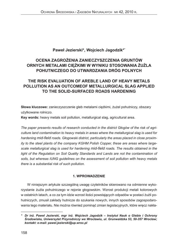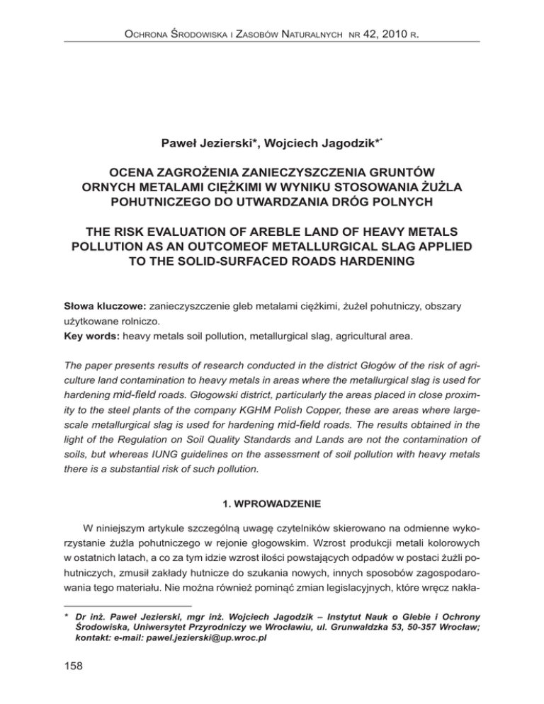 Ochrona Środowiska i Zasobów Naturalnych nr 42, 2010 r. Paweł Jezierski*, Wojciech Jagodzik** OCENA ZAGROŻENIA ZANIECZYSZCZENIA GRUNTÓW ORNYCH METALAMI CIęŻKIMI W WYNIKU STOSOWANIA ŻUżLA POHUTNICZEGO DO UTWARDZANIA DRÓG POLNYCH THE RISK EVALUATION OF AREBLE LAND OF HEAVY METALS POLLUTION AS AN OUTCOMEOF METALLURGICAL SLAG APPLIED TO THE SOLID-SURFACED ROADS HARDENING Słowa kluczowe: zanieczyszczenie gleb metalami ciężkimi, żużel pohutniczy, obszary użytkowane rolniczo. Key words: heavy metals soil pollution, metallurgical slag, agricultural area. The paper presents results of research conducted in the district Głogów of the risk of agriculture land contamination to heavy metals in areas where the metallurgical slag is used for hardening mid-field roads. Głogowski district, particularly the areas placed in close proximity to the steel plants of the company KGHM Polish Copper, these are areas where largescale metallurgical slag is used for hardening mid-field roads. The results obtained in the light of the Regulation on Soil Quality Standards and Lands are not the contamination of soils, but whereas IUNG guidelines on the assessment of soil pollution with heavy metals there is a substantial risk of such pollution. 1. WPROWADZENIE W niniejszym artykule szczególną uwagę czytelników skierowano na odmienne wykorzystanie żużla pohutniczego w rejonie głogowskim. Wzrost produkcji metali kolorowych w ostatnich latach, a co za tym idzie wzrost ilości powstających odpadów w postaci żużli pohutniczych, zmusił zakłady hutnicze do szukania nowych, innych sposobów zagospodarowania tego materiału. Nie można również pominąć zmian legislacyjnych, które wręcz nakła* Dr inż. Paweł Jezierski, mgr inż. Wojciech Jagodzik – Instytut Nauk o Glebie i Ochrony Środowiska, Uniwersytet Przyrodniczy we Wrocławiu, ul. Grunwaldzka 53, 50-357 Wrocław; kontakt: e-mail: [email protected] 158 Ocena zagrożenia zanieczyszczenia gruntów ornych metalami ciężkimi w wyniku... dają obowiązek wykorzystywania odpadów. Dlatego też znaczenie alternatywnych źródeł kruszyw sztucznych, odpadowych lub pochodzących z recyklingu wzrosło i będzie zdecydowanie nadal wzrastać [Sobczyński 1999].Właściwości fizykochemiczne i mechaniczne żużla sprawiają, że znajduje on zastosowanie jako surowiec do produkcji budowlanych kruszyw łamanych, szczególnie w budownictwie drogowym [Dobrzański i in. 1999]. Przeprowadzone liczne badania własności żużla, dotyczące ścieralności, podatności na rozkruszanie, odporności na działanie mrozu oraz nasiąkliwości, wskazują, że w zakresie charakterystyk fizykomechanicznych żużel z procesu szybowego spełnia wymagania stawiane skałom litym II klasy. Skład chemiczny żużla szybowego pochodzącego z huty „Głogów” przedstawiono w tabeli 1 [Pietrzyński 1996]. Tabela 1.Skład chemiczny żużla szybowego Table. 1. The chemical composition of slag shaft Skład chemiczny Cu Ag Fe S Pb As SiO2 CaO MgO Al2O3 Zn Zawartość poszczególnych składników [mg/kg·103] Huta miedzi „Legnica” Huta miedzi „Głogów” 4,10 3,80 0,02 0,02 959,00 832,00 140,00 170,00 230,00 250,00 0,14 0,17 439,90 480,30 146,50 151,80 75,70 92,10 135,90 139,50 4,90 7,40 Źródło: KGHM. W rejonie głogowskim jednym z kierunków wykorzystania materiału żużlowego jest stosowanie go jako kruszywa utwardzającego warstwy powierzchniowe dróg polnych. W przeciwieństwie do dróg z nawierzchnią asfaltową, gdzie warstwa utwardzająca żużla jest izolowana obustronnie, żużel stosowany w nawierzchniach dróg polnych ma bezpośredni kontakt ze środowiskiem zewnętrznym. Oddziałują na niego czynniki klimatyczne w postaci opadów atmosferycznych, wiatru, mrozu i temperatury, jak również czynniki antropogeniczne, np. przemieszczające się ciężkie maszyny rolnicze. Każda z wymienionych form oddziaływania może powodować znaczne rozdrobnienie materiału żużlowego, co prowadzić może do zagrożenia uwalniania się z żużlu metali ciężkich występujących w tym materiale. Celem pracy było określenie całkowitych zawartości metali ciężkich, występujących zarówno w glebach użytkowanych rolniczo, jak i w żużlu wykorzystywanym do utwardzania 159 Paweł Jezierski, Wojciech Jagodzik dróg polnych, a także określenie rozmiarów zagrożenia uwalnianiem się metali ciężkich za2 MATERIAŁY I METODY wartych w żużlu do gruntów ornych. W październiku 2008 r. pobrano próbki glebowe z dwóch obiektów badawczych, 2. MATERIAŁY usytuowanego w miejscowości Moszowie I METODY obiektu badawczego „Moszowie” i w miejscowości Ceber – obiektu badawczego „Ceber” (rys.1).obiektów Na każdym obiekcie próbki W październiku 2008 r. pobrano próbki glebowe z dwóch badawczych, usyglebowe w miejscowości pobrano z czterech punktów,obiektu z dwóch głębokości:„Moszowice” 0 – 10cm i 20 – 30cm. Punkty tuowanego Moszowice badawczego i w miejscowości Ceber – obiektu (rys.1).z Na każdym obiekcie próbkidrodze, glebowe pobra-w poboru próbek badawczego rozmieszczono„Ceber” co 5 metrów, czego jeden punkt na samej a kolejne no linii z czterech punktów, 0 – 10cm i 20 – 30cm. Punkty poboru prostopadłej do z dwóch drogi, nagłębokości: polach uprawnych. Zebrane próbki glebowe, w próbek każdym rozmieszczono co 5 metrów, z czego jeden punkt na samej drodze, a kolejne w linii prostopunkcie z danej głębokości, stanowiły próbę średnia uzyskaną z wymieszania gleby pobranej padłej do drogi, na polach uprawnych. Zebrane próbki glebowe, w każdym punkcie z daz 3 miejsc oddalonych od siebie co 10 m (położonych w linii równoległej do drogi, rys. 2). nej głębokości, stanowiły próbę średnią uzyskaną z wymieszania gleby pobranej z 3 miejsc Próbki naoddrodze pobrano z różnych głębokości, z uwzględnieniem oddalonych siebie co 10 m (położonych w linii równoległej do drogi, rys.morfologicznego 2). Pr