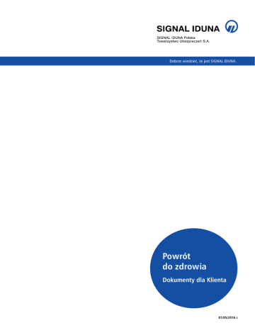 Dobrze wiedzieć, że jest SIGNAL IDUNA. Powrót do zdrowia Dokumenty dla Klienta 01/05/2016 r. Ogólne Warunki Ubezpieczenia Zdrowotnego SIGNAL IDUNA SKOROWIDZ DOTYCZY: najważniejszych informacji zawartych w Ogólnych Warunkach Ubezpieczenia Zdrowotnego SIGNAL IDUNA zatwierdzonych uchwałą nr 23/Z/2016 Zarządu SIGNAL IDUNA Polska Towarzystwo Ubezpieczeń S.A. z dnia 21.04.2016 r. Lp. 1. Rodzaj informacji Przesłanki wypłaty odszkodowania i innych świadczeń lub wartości wykupu ubezpieczenia. Numer jednostki redakcyjnej § 17. § 18. § 28. ust. 1. § 1. § 2. § 3. Ograniczenia oraz wyłączenia odpowiedzialności 2. zakładu ubezpieczeń uprawniające do odmowy wypłaty odszkodowania i innych świadczeń lub ich obniżenia. § 6. § 8 ust. 3. § 9. § 13. ust. 1. § 14. § 16. ust. 2., 4. § 17. ust. 12. SIR 0357/06.16 § 21. ust. 1. SPIS TREŚCI: Rozdział I. Definicje str. 3 Rozdział IV. Przepisy dotyczące okresu obowiązywania umowy str. 4 Rozdział II. Postanowienia Ogólne str. 4 Rozdział V. Rozwiązanie umowy str. 7 Rozdział III. Ocena ryzyka str. 4 Rozdział VI. Inne postanowienia str. 7 Rozdział I. Definicje 1. Call Center: centrum telefoniczne, za pośrednictwem którego Ubezpieczyciel świadczy usługi telefoniczne. Poprzez Call Center Ubezpieczony i Ubezpieczający mogą w szczególności otrzymywać informacje odnośnie Umowy Ubezpieczenia i listy Dostawców Usług Medycznych Sieci SIGNAL IDUNA. Leczenie prowadzone przez Dostawcę Usług Medycznych może być umawiane i zatwierdzane wyłącznie poprzez Call Center, chyba że w Warunkach Produktu ustalono inaczej. 2.Choroba: Nieprawidłowy stan struktury lub funkcji w organizmie Ubezpie czonego, zdiagnozowany przez odpowiednio uprawnionego lekarza. 3.Diagnostyka/ Konsultacja: Procedura wykonywana przez Dostawcę Usług Medycznych w celu zdiagnozowania Choroby lub Leczenia. 4.Dostawca Usług Medycznych: Każdy lekarz lub placówka medyczna, upoważnieni przez właściwe organy i posiadający odpowiednie zezwolenia do świadczenia usług medycznych, zgodnie z obowiązującymi przepisami i powszechną, obowiązującą wiedzą medyczną, świadczący usługi medyczne w ramach posiadanych uprawnień. Dotyczy to również pielęgniarek i innego personelu medycznego dysponującego wiedzą odpowiednią do świadczenia usług medycznych. 5.Dostawca Usług Medycznych Sieci SIGNAL IDUNA: Dostawca Usług Medycznych, który zawarł umowę o współpracy z Ubezpieczycielem. Lista Dostawców Usług Medycznych Sieci SIGNAL IDUNA może ulec zmianie z ważnych powodów, za które uznaje się zawarcie przez Ubezpieczyciela umów z innymi Dostawcami, zmianą lub rozwiązaniem umów istniejących. Aktualna lista Dostawców jest udostępniona na stronie www.zdrowotne.pl. 6.Dzień Zawarcia Umowy: Dzień, w którym Ubezpieczyciel i Ubezpieczający zawierają Umowę Ubezpieczenia, tj. dzień wskazany w Polisie Ubezpieczeniowej, w którym Ubezpieczyciel zaakceptował Wniosek o Objęcie Ubezpieczeniem. 7. Karta Ubezpieczenia: Dokument wydany przez Ubezpieczyciela Ubezpieczonemu, który może być wykorzystywany wyłącznie przez Ubezpieczonego i powinien być każdorazowo okazywany Dostawcy Usług Medycznych przed rozpoczęciem leczenia. Karta Ubezpieczenia zawiera informacje na temat Ubezpieczonego i Umowy Ubezpieczenia. 8.Katalog Świadczeń Gwarantowanych: Wykaz świadczeń medycznych, zapewnianych w ramach Umowy Ubezpieczenia. 9.Koniec Ubezpieczenia: Dzień, zakończenia Ochrony Ubezpieczeniowej. 10.Medycyna Eksperymentalna: Wszystkie procedury medyczne, które nie są stosowane w ogólnie przyjętej praktyce medycznej ani które nie są nauczane w uznanych, państwowych uczelniach medycznych lub podobnych instytucjach edukacyjnych jak również oczekujące na oficjalne uznanie przez odpowiednie władze państwowe lub będące w fazie badań. 11.Ocena Ryzyka: Procedura, w trakcie której Ubezpieczyciel, w razie potrzeby, sprawdza czy lub na jakich warunkach ubezpieczy przyszłego Ubezpieczonego. Wśród wielu czynników, pod uwagę będzie brany wiek, zawód i stan zdrowia Ubezpieczonego. Jako uzupełnienie informacji dostarczonych przez Ubezpieczającego i Ubezpieczonego we Wniosku o Objęcie Ubezpieczeniem, Ubezpieczyciel może zażądać dodatkowych informacji lub dokumentów, które należy dostarczyć od lekarzy przyszłego Ubezpieczonego lub odpowiednich placówek medycznych. 12.Ochrona Ubezpieczeniowa: Ochrona udzielana przez Ubezpieczyciela na podstawie Umowy Ubezpieczenia. 13.Okresy Karencji – okresy, w których Ubezpieczyciel nie świadczy Ochrony Ubezpieczeniowej z tytułu zajścia danego Zdarzenia Ubezpieczeniowego. 14.Początek Ubezpieczenia: Dzień wskazany w Polisie Ubezpieczeniowej, od którego rozpoczyna się Ochrona Ubezpieczeniowa świadczona przez Ubezpieczyciela. 15.Pośrednik: Osoba fizyczna lub prawna, właściwie upoważniona przez Ubezpieczyciela, która pośredniczy w zawarciu Umowy Ubezpieczenia między Ubezpieczającym a Ubezpieczycielem. 16.Produkt Ubezpieczenia: zakres świadczeń zapewnianych Ubezpieczonemu w ramach Umowy Ubezpieczenia. Szczegółową listę zapewnianych świadczeń zawiera Katalog Świadczeń Gwarantowanych). 17.Warunki Produktu: załącznik do niniejszych Ogólnych Warunków Ubezpieczenia opisujący Produkt Ubezpieczenia, stanowiący dodatkową, pisemną część Umowy Ubezpieczenia, która uzupełnia, przekwalifikuje lub zmienia niniejsze Ogólne Warunki Ubezpieczenia. 18 Polisa Ubezpieczeniowa: Pisemny dokument wystawiony przez Ubezpieczyciela, który potwierdza zawarcie Umowy Ubezpieczenia przez Ubezpieczającego i Ubezpieczyciela, oraz który zawiera informacje o Umowie Ubezpieczenia. 19.Rozpoczęcie Leczenia: Moment w czasie, gdy Ubezpieczony jest po raz pierwszy poddawany Leczeniu z powodu danej Choroby lub Zaburzenia. 20.Świadczenie Medyczne: Wszystkie procedury medyczne stosowane w Leczeniu Choroby lub Zaburzenia, jak również związane z prowadzeniem ciąży, porodem i profi