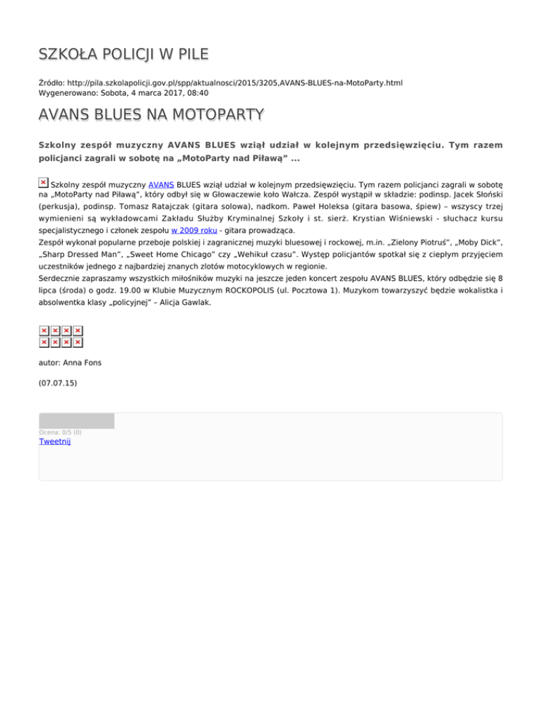 SZKOŁA POLICJI W PILE Źródło: http://pila.szkolapolicji.gov.pl/spp/aktualnosci/2015/3205,AVANS-BLUES-na-MotoParty.html Wygenerowano: Sobota, 4 marca 2017, 08:40 AVANS BLUES NA MOTOPARTY Szkolny zespół muzyczny AVANS BLUES wziął udział w kolejnym przedsięwzięciu. Tym razem policjanci zagrali w sobotę na „MotoParty nad Piławą” ... Szkolny zespół muzyczny AVANS BLUES wziął udział w kolejnym przedsięwzięciu. Tym razem policjanci zagrali w sobotę na „MotoParty nad Piławą”, który odbył się w Głowaczewie koło Wałcza. Zespół wystąpił w składzie: podinsp. Jacek Słoński (perkusja), podinsp. Tomasz Ratajczak (gitara solowa), nadkom. Paweł Holeksa (gitara basowa, śpiew) – wszyscy trzej wymienieni są wykładowcami Zakładu Służby Kryminalnej Szkoły i st. sierż. Krystian Wiśniewski - słuchacz kursu specjalistycznego i członek zespołu w 2009 roku - gitara prowadząca. Zespół wykonał popularne przeboje polskiej i zagranicznej muzyki bluesowej i rockowej, m.in. „Zielony Piotruś”, „Moby Dick”, „Sharp Dressed Man”, „Sweet Home Chicago” czy „Wehikuł czasu”. Występ policjantów spotkał się z ciepłym przyjęciem uczestników jednego z najbardziej znanych zlotów motocyklowych w regionie. Serdecznie zapraszamy wszystkich miłośników muzyki na jeszcze jeden koncert zespołu AVANS BLUES, który odbędzie się 8 lipca (środa) o godz. 19.00 w Klubie Muzycznym ROCKOPOLIS (ul. Pocztowa 1). Muzykom towarzyszyć będzie wokalistka i absolwentka klasy „policyjnej” – Alicja Gawlak. autor: Anna Fons (07.07.15) Ocena: 0/5 (0) Tweetnij