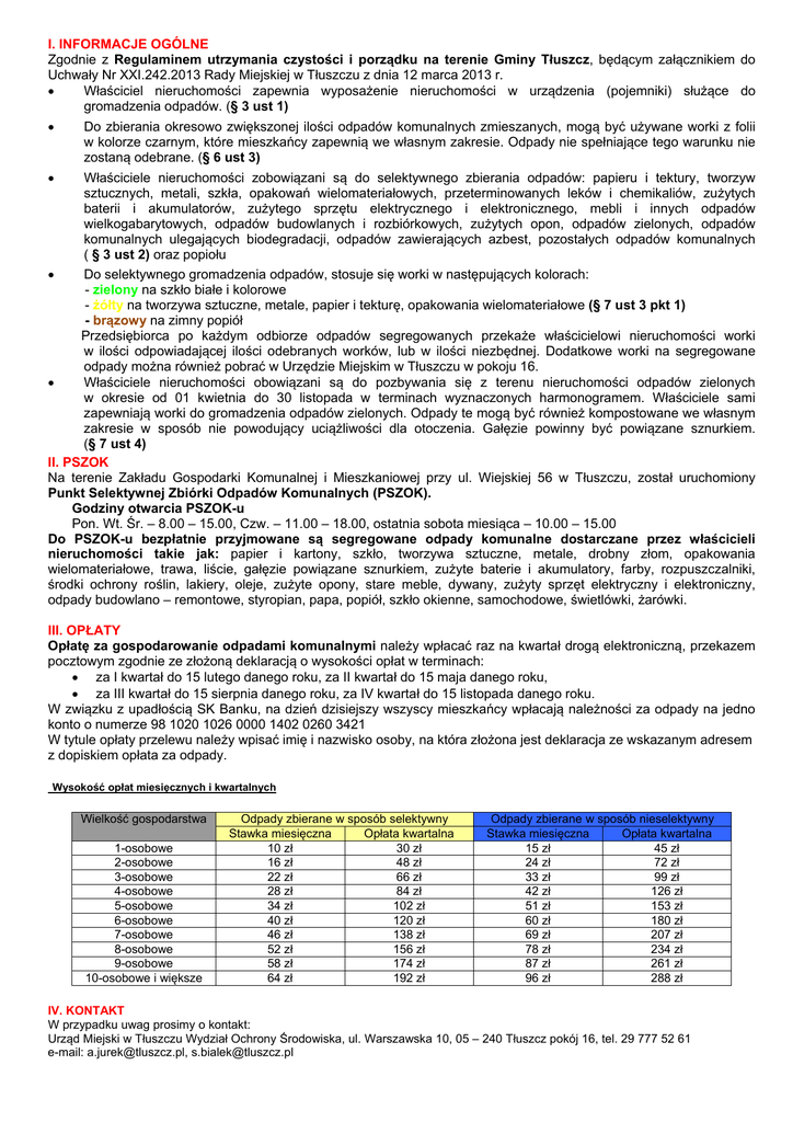 I. INFORMACJE OGÓLNE Zgodnie z Regulaminem utrzymania czystości i porządku na terenie Gminy Tłuszcz, będącym załącznikiem do Uchwały Nr XXI.242.2013 Rady Miejskiej w Tłuszczu z dnia 12 marca 2013 r. Właściciel nieruchomości zapewnia wyposażenie nieruchomości w urządzenia (pojemniki) służące do gromadzenia odpadów. (§ 3 ust 1) Do zbierania okresowo zwiększonej ilości odpadów komunalnych zmieszanych, mogą być używane worki z folii w kolorze czarnym, które mieszkańcy zapewnią we własnym zakresie. Odpady nie spełniające tego warunku nie zostaną odebrane. (§ 6 ust 3) Właściciele nieruchomości zobowiązani są do selektywnego zbierania odpadów: papieru i tektury, tworzyw sztucznych, metali, szkła, opakowań wielomateriałowych, przeterminowanych leków i chemikaliów, zużytych baterii i akumulatorów, zużytego sprzętu elektrycznego i elektronicznego, mebli i innych odpadów wielkogabarytowych, odpadów budowlanych i rozbiórkowych, zużytych opon, odpadów zielonych, odpadów komunalnych ulegających biodegradacji, odpadów zawierających azbest, pozostałych odpadów komunalnych ( § 3 ust 2) oraz popiołu Do selektywnego gromadzenia odpadów, stosuje się worki w następujących kolorach: - zielony na szkło białe i kolorowe - żółty na tworzywa sztuczne, metale, papier i tekturę, opakowania wielomateriałowe (§ 7 ust 3 pkt 1) - brązowy na zimny popiół Przedsiębiorca po każdym odbiorze odpadów segregowanych przekaże właścicielowi nieruchomości worki w ilości odpowiadającej ilości odebranych worków, lub w ilości niezbędnej. Dodatkowe worki na segregowane odpady można również pobrać w Urzędzie Miejskim w Tłuszczu w pokoju 16. Właściciele nieruchomości obowiązani są do pozbywania się z terenu nieruchomości odpadów zielonych w okresie od 01 kwietnia do 30 listopada w terminach wyznaczonych harmonogramem. Właściciele sami zapewniają worki do gromadzenia odpadów zielonych. Odpady te mogą być również kompostowane we własnym zakresie w sposób nie powodujący uciążliwości dla otoczenia. Gałęzie powinny być powiązane sznurkiem. (§ 7 ust 4) II. PSZOK Na terenie Zakładu Gospodarki Komunalnej i Mieszkaniowej przy ul. Wiejskiej 56 w Tłuszczu, został uruchomiony Punkt Selektywnej Zbiórki Odpadów Komunalnych (PSZOK). Godziny otwarcia PSZOK-u Pon. Wt. Śr. – 8.00 – 15.00, Czw. – 11.00 – 18.00, ostatnia sobota miesiąca – 10.00 – 15.00 Do PSZOK-u bezpłatnie przyjmowane są segregowane odpady komunalne dostarczane przez właścicieli nieruchomości takie jak: papier i kartony, szkło, tworzywa sztuczne, metale, drobny złom, opakowania wielomateriałowe, trawa, liście, gałęzie powiązane sznurkiem, zużyte baterie i akumulatory, farby, rozpuszczalniki, środki ochrony roślin, lakiery, oleje, zużyte opony, stare meble, dywany, zużyty sprzęt elektryczny i elektroniczny, odpady budowlano – remontowe, styropian, papa, popiół, szkło okienne, samochodowe, świetlówki, żarówki. III. OPŁATY Opłatę za gospodarowanie odpadami komunalnymi należy wpłacać raz na kwartał drogą elektroniczną, przekazem pocztowym zgodnie ze złożoną deklaracją o wysokości opłat w terminach: za I kwartał do 15 lutego danego roku, za II kwartał do 15 maja danego roku, za III kwartał do 15 sierpnia danego roku, za IV kwartał do 15 listopada danego roku. W związku z upadłością SK Banku, na dzień dzisiejszy wszyscy mieszkańcy wpłacają należności za odpady na jedno konto o numerze 98 1020 1026 0000 1402 0260 3421 W tytule opłaty przelewu należy wpisać imię i nazwisko osoby, na która złożona jest deklaracja ze wskazanym adresem z dopiskiem opłata za odpady. Wysokość opłat miesięcznych i kwartalnych Wielkość gospodarstwa 1-osobowe 2-osobowe 3-osobowe 4-osobowe 5-osobowe 6-osobowe 7-osobowe 8-osobowe 9-osobowe 10-osobowe i większe Odpady zbierane w sposób selektywny Stawka miesięczna Opłata kwartalna 10 zł 30 zł 16 zł 48 zł 22 zł 66 zł 28 zł 84 zł 34 zł 102 zł 40 zł 120 zł 46 zł 138 zł 52 zł 156 zł 58 zł 174 zł 64 zł 192 zł Odpady zbierane w sposób nieselektywny Stawka miesięczna Opłata kwartalna 15 zł 45 zł 24 zł 72 zł 33 zł 99 zł 42 zł 126 zł 51 zł 153 zł 60 zł 180 zł 69 zł 207 zł 78 zł 234 zł 87 zł 261 zł 96 zł 288 zł IV. KONTAKT W przypadku uwag prosimy o kontakt: Urząd Miejski w Tłuszczu Wydział Ochrony Środowiska, ul. Warszawska 10, 05 – 240 Tłuszcz pokój 16, tel. 29 777 52 61 e-mail: [email protected], [email protected]