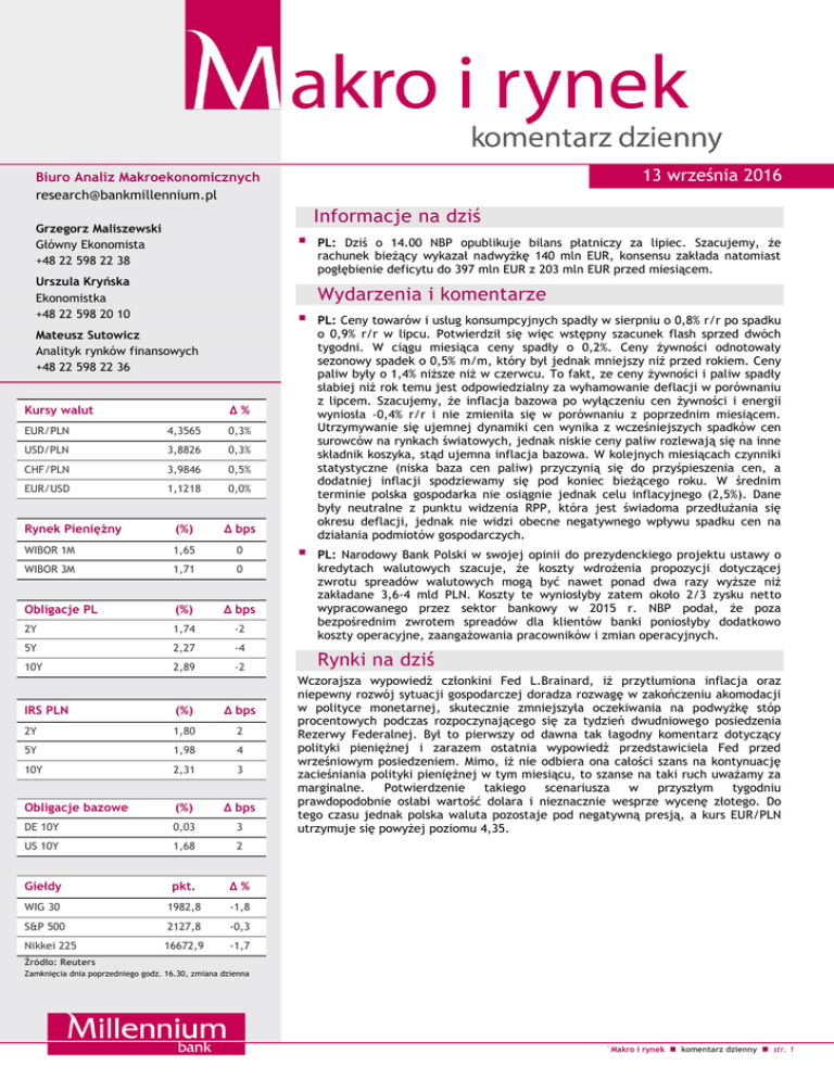 13 września 2016 Biuro Analiz Makroekonomicznych [email protected] Informacje na dziś Grzegorz Maliszewski Główny Ekonomista +48 22 598 22 38 Urszula Kryńska Ekonomistka +48 22 598 20 10 PL: Dziś o 14.00 NBP opublikuje bilans płatniczy za lipiec. Szacujemy, że rachunek bieżący wykazał nadwyżkę 140 mln EUR, konsensu zakłada natomiast pogłębienie deficytu do 397 mln EUR z 203 mln EUR przed miesiącem. Wydarzenia i komentarze PL: Ceny towarów i usług konsumpcyjnych spadły w sierpniu o 0,8% r/r po spadku o 0,9% r/r w lipcu. Potwierdził się więc wstępny szacunek flash sprzed dwóch tygodni. W ciągu miesiąca ceny spadły o 0,2%. Ceny żywności odnotowały sezonowy spadek o 0,5% m/m, który był jednak mniejszy niż przed rokiem. Ceny paliw były o 1,4% niższe niż w czerwcu. To fakt, ze ceny żywności i paliw spadły słabiej niż rok temu jest odpowiedzialny za wyhamowanie deflacji w porównaniu z lipcem. Szacujemy, że inflacja bazowa po wyłączeniu cen żywności i energii wyniosła -0,4% r/r i nie zmieniła się w porównaniu z poprzednim miesiącem. Utrzymywanie się ujemnej dynamiki cen wynika z wcześniejszych spadków cen surowców na rynkach światowych, jednak niskie ceny paliw rozlewają się na inne składnik koszyka, stąd ujemna inflacja bazowa. W kolejnych miesiącach czynniki statystyczne (niska baza cen paliw) przyczynią się do przyśpieszenia cen, a dodatniej inflacji spodziewamy się pod koniec bieżącego roku. W średnim terminie polska gospodarka nie osiągnie jednak celu inflacyjnego (2,5%). Dane były neutralne z punktu widzenia RPP, która jest świadoma przedłużania się okresu deflacji, jednak nie widzi obecne negatywnego wpływu spadku cen na działania podmiotów gospodarczych. PL: Narodowy Bank Polski w swojej opinii do prezydenckiego projektu ustawy o kredytach walutowych szacuje, że koszty wdrożenia propozycji dotyczącej zwrotu spreadów walutowych mogą być nawet ponad dwa razy wyższe niż zakładane 3,6-4 mld PLN. Koszty te wyniosłyby zatem około 2/3 zysku netto wypracowanego przez sektor bankowy w 2015 r. NBP podał, że poza bezpośrednim zwrotem spreadów dla klientów banki poniosłyby dodatkowo koszty operacyjne, zaangażowania pracowników i zmian operacyjnych. Mateusz Sutowicz Analityk rynków finansowych +48 22 598 22 36 Kursy walut Δ% EUR/PLN 4,3565 0,3% USD/PLN 3,8826 0,3% CHF/PLN 3,9846 0,5% EUR/USD 1,1218 0,0% Rynek Pieniężny (%) Δ bps WIBOR 1M 1,65 0 WIBOR 3M 1,71 0 Obligacje PL (%) Δ bps 2Y 1,74 -2 5Y 2,27 -4 10Y 2,89 -2 IRS PLN (%) Δ bps 2Y 1,80 2 5Y 1,98 4 10Y 2,31 3 Obligacje bazowe (%) Δ bps DE 10Y 0,03 3 US 10Y 1,68 2 Giełdy pkt. Δ% WIG 30 1982,8 -1,8 S&P 500 2127,8 -0,3 Nikkei 225 16672,9 -1,7 Rynki na dziś Wczorajsza wypowiedź członkini Fed L.Brainard, iż przytłumiona inflacja oraz niepewny rozwój sytuacji gospodarczej doradza rozwagę w zakończeniu akomodacji w polityce monetarnej, skutecznie zmniejszyła oczekiwania na podwyżkę stóp procentowych podczas rozpoczynającego się za tydzień dwudniowego posiedzenia Rezerwy Federalnej. Był to pierwszy od dawna tak łagodny komentarz dotyczący polityki pieniężnej i zarazem ostatnia wypowiedź przedstawiciela Fed przed wrześniowym posiedzeniem. Mimo, iż nie odbiera ona całości szans na kontynuację zacieśniania polityki pieniężnej w tym miesiącu, to szanse na taki ruch uważamy za marginalne. Potwierdzenie takiego scenariusza w przyszłym tygodniu prawdopodobnie osłabi wartość dolara i nieznacznie wesprze wycenę złotego. Do tego czasu jednak polska waluta pozostaje pod negatywną presją, a kurs EUR/PLN utrzymuje się powyżej poziomu 4,35. Źródło: Reuters Zamknięcia dnia poprzedniego godz. 16.30, zmiana dzienna `Makro i rynek komentarz dzienny str. 1 Rynek krajowy Kursy walutowe EUR/PLN i EUR/USD 4,50 1,14 4,45 4,40 1,12 4,35 1,10 4,30 4,25 1,08 EURPLN EURUSD /prawa skala/ Źródło: Reuters Rentowności polskich obligacji [%] 3,4 Poniedziałkowa sesja miała rozpocząć się od reakcji rynku na decyzję agencji Moody’s, która w piątek po zamknięciu rynków miała zaktualizować rating Polski. Do rewizji oceny wiarygodności jednak nie doszło, a kurs EUR/PLN – pomimo nadal obowiązującego ratingu Polski na poziomie A2/P-1 – zwyżkował do poziomu 4,3585. Wycenie złotego oraz pozostałych walut regionu nie sprzyjało bowiem otoczenie zewnętrzne związane z coraz bardziej powszechnym oczekiwaniem na normalizację polityki pieniężnej w Stanach Zjednoczonych. Z tego powodu wczoraj kurs EUR/HUF przejściowo ustanowił miesięczne maksimum. Poniedziałek na krajowym rynku długu przyniósł natomiast nieznaczne odreagowanie dynamicznych wzrostów dochodowości obserwowanych pod koniec ubiegłego tygodnia. Rentowność 2-latki oraz 10-latki zmalała o 2 bps odpowiednio do poziomów 1,74% i 2,89%. Wczorajszego wzrostu cen nie traktujemy jednak jako nowego trendu, a jedynie korektę. Uważamy bowiem, iż niesprzyjające wycenie aktywów emerging markets otoczenie zewnętrzne w połączeniu z wygaszeniem szans na obniżki kosztu pieniądza w Polsce oraz rozpoczęcie przez Ministerstwo Finansów większej ilości przetargów w miesiącu niż miało to miejsce w wakacje ze sporą podażą papierów skutkować będzie wzrostem dochodowości polskich obligacji, w szczególności długiego końca. Rynki zagraniczne 3,0 Wczorajsza sesja na rynku eurodolara przeszła bez echa. Kurs EUR/USD stabilizował się na poziomie piątkowego zamknięcia tj. 1,1225 generując niewielką, bo pół-centową zmienność wywołaną wieczorną czasu europejskiego wypowiedzią przedstawicielki Fed. L.Brainard stwierdziła, iż przytłumiona inflacja oraz niepewny rozwój sytuacji gospodarczej doradza rozwagę w zakończeniu akomodacji w polityce monetarnej. Był to pierwszy od dawna tak łagodny komentarz dotyczący polityki pieniężnej i zarazem ostatnia wypowiedź przedstawiciela Fed przed posiedzeniem zaplanowanym na 20-21 wrześ