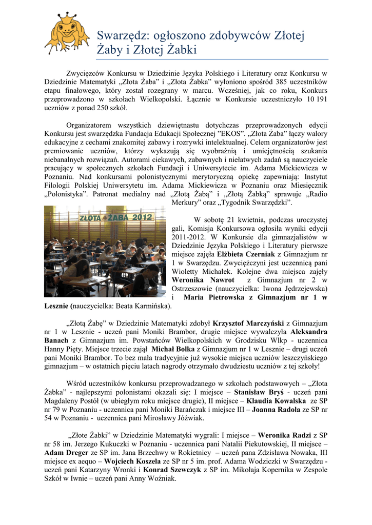 Swarzędz: ogłoszono zdobywców Złotej Żaby i Złotej Żabki Zwycięzców Konkursu w Dziedzinie Języka Polskiego i Literatury oraz Konkursu w Dziedzinie Matematyki „Złota Żaba” i „Złota Żabka” wyłoniono spośród 385 uczestników etapu finałowego, który został rozegrany w marcu. Wcześniej, jak co roku, Konkurs przeprowadzono w szkołach Wielkopolski. Łącznie w Konkursie uczestniczyło 10 191 uczniów z ponad 250 szkół. Organizatorem wszystkich dziewiętnastu dotychczas przeprowadzonych edycji Konkursu jest swarzędzka Fundacja Edukacji Społecznej ”EKOS”. „Złota Żaba” łączy walory edukacyjne z cechami znakomitej zabawy i rozrywki intelektualnej. Celem organizatorów jest premiowanie uczniów, którzy wykazują się wyobraźnią i umiejętnością szukania niebanalnych rozwiązań. Autorami ciekawych, zabawnych i niełatwych zadań są nauczyciele pracujący w społecznych szkołach Fundacji i Uniwersytecie im. Adama Mickiewicza w Poznaniu. Nad konkursami polonistycznymi merytoryczną opiekę zapewniają: Instytut Filologii Polskiej Uniwersytetu im. Adama Mickiewicza w Poznaniu oraz Miesięcznik „Polonistyka”. Patronat medialny nad „Złotą Żabą” i „Złotą Żabką” sprawuje „Radio Merkury” oraz „Tygodnik Swarzędzki”. W sobotę 21 kwietnia, podczas uroczystej gali, Komisja Konkursowa ogłosiła wyniki edycji 2011-2012. W Konkursie dla gimnazjalistów w Dziedzinie Języka Polskiego i Literatury pierwsze miejsce zajęła Elżbieta Czerniak z Gimnazjum nr 1 w Swarzędzu. Zwyciężczyni jest uczennicą pani Wioletty Michałek. Kolejne dwa miejsca zajęły Weronika Nawrot z Gimnazjum nr 2 w Ostrzeszowie (nauczycielka: Iwona Jędrzejewska) i Maria Pietrowska z Gimnazjum nr 1 w Lesznie (nauczycielka: Beata Karmińska). „Złotą Żabę” w Dziedzinie Matematyki zdobył Krzysztof Marczyński z Gimnazjum nr 1 w Lesznie - uczeń pani Moniki Brambor, drugie miejsce wywalczyła Aleksandra Banach z Gimnazjum im. Powstańców Wielkopolskich w Grodzisku Wlkp - uczennica Hanny Pięty. Miejsce trzecie zajął Michał Bolka z Gimnazjum nr 1 w Lesznie – drugi uczeń pani Moniki Brambor. To bez mała tradycyjnie już wysokie miejsca uczniów leszczyńskiego gimnazjum – w ostatnich pięciu latach nagrody otrzymało dwudziestu uczniów z tej szkoły! Wśród uczestników konkursu przeprowadzanego w szkołach podstawowych – „Złota Żabka” - najlepszymi polonistami okazali się: I miejsce – Stanisław Bryś - uczeń pani Magdaleny Postół (w ubiegłym roku miejsce drugie), II miejsce – Klaudia Kowalska ze SP nr 79 w Poznaniu - uczennica pani Moniki Barańczak i miejsce III – Joanna Radoła ze SP nr 54 w Poznaniu - uczennica pani Mirosławy Jóźwiak. „Złote Żabki” w Dziedzinie Matematyki wygrali: I miejsce – Weronika Radzi z SP nr 58 im. Jerzego Kukuczki w Poznaniu - uczennica pani Natalii Piekutowskiej, II miejsce – Adam Dreger ze SP im. Jana Brzechwy w Rokietnicy – uczeń pana Zdzisława Nowaka, III miejsce ex aequo – Wojciech Koszela ze SP nr 5 im. prof. Adama Wodziczki w Swarzędzu uczeń pani Katarzyny Wronki i Konrad Szewczyk z SP im. Mikołaja Kopernika w Zespole Szkół w Iwnie – uczeń pani Anny Woźniak. Spośród uczniów szkół powiatu wolsztyńskiego sukces odniosła Katarzyna Mirecka z Gimnazjum im. Jana Pawła II w Mochach, uczennica Renaty Bortniak (wyróżnienie w dziedzinie języka polskiego i literatury). Konkursy współfinansują w formie dotacji miasta i gminy: Swarzędz, Poznań, Kórnik, Luboń, Murowana Goślina, Września, Szamotuły, Kostrzyn, Suchy Las, Nekla, powiaty poznański, wolsztyński i leszczyński, szamotulski, a także samorząd województwa wielkopolskiego. Sponsorami są: Drukarnia Swarzędzka Stanisława i Marcina Witeckich, ENEA S.A., EVER sp. o. o., TERRAVITA sp. z o. o., „ŻABKA POLSKA” sp. z o. o.., EWA SZPOT sp. z o.o. Wręczono statuetki Złotej Żaby i Złotej Żabki, dyplomy i atrakcyjne nagrody – tablety, aparaty fotograficzne, książki, komputerowe programy edukacyjne, słodkie upominki. Fundacja Edukacji Społecznej „EKOS” przyznała stypendia. Specjalne nagrody otrzymali także nauczyciele, którzy uczą laureatów trzech najwyższych miejsc w obu konkursach. Nagrody i wyróżnienia odebrało 81 uczniów i 13 nauczycieli. Przy wręczaniu nagród organizatorom towarzyszyli przedstawiciele donatorów i sponsorów oraz liczne grono nauczycieli, dyrektorów szkół i rodziców zgromadzonych w auli swarzędzkich szkół społecznych przy ul. Kwaśniewskiego 2. Uroczystość uświetnił koncert poznańskiego zespołu smyczkowego Artu’S Kwartet, który wystąpił w efektownym repertuarze klasycznym. Dotacjodawcy: Luboń Sponsorzy: Patroni: Szamotuły Kostrzyn Nekla