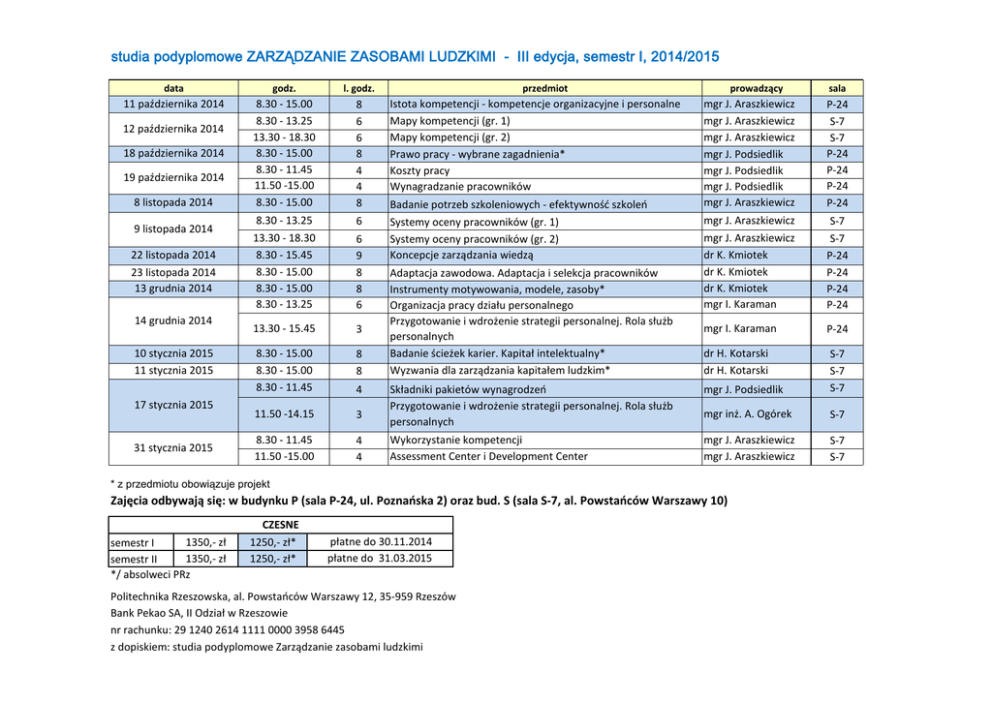 studia podyplomowe ZARZĄDZANIE ZASOBAMI LUDZKIMI - III edycja, semestr I, 2014/2015 data godz. l. godz. 11 października 2014 8.30 - 15.00 8.30 - 13.25 13.30 - 18.30 8.30 - 15.00 8.30 - 11.45 11.50 -15.00 8.30 - 15.00 8 6 6 8 4 4 8 Istota kompetencji - kompetencje organizacyjne i personalne Mapy kompetencji (gr. 1) Mapy kompetencji (gr. 2) Prawo pracy - wybrane zagadnienia* Koszty pracy Wynagradzanie pracowników 8.30 - 13.25 13.30 - 18.30 8.30 - 15.45 8.30 - 15.00 8.30 - 15.00 8.30 - 13.25 6 Systemy oceny pracowników (gr. 1) Systemy oceny pracowników (gr. 2) Koncepcje zarządzania wiedzą 13.30 - 15.45 3 8.30 - 15.00 8.30 - 15.00 8.30 - 11.45 8 8 11.50 -14.15 3 8.30 - 11.45 11.50 -15.00 4 4 12 października 2014 18 października 2014 19 października 2014 8 listopada 2014 9 listopada 2014 22 listopada 2014 23 listopada 2014 13 grudnia 2014 14 grudnia 2014 10 stycznia 2015 11 stycznia 2015 17 stycznia 2015 31 stycznia 2015 6 9 8 8 6 4 przedmiot Badanie potrzeb szkoleniowych - efektywność szkoleń Adaptacja zawodowa. Adaptacja i selekcja pracowników Instrumenty motywowania, modele, zasoby* Organizacja pracy działu personalnego Przygotowanie i wdrożenie strategii personalnej. Rola służb personalnych Badanie ścieżek karier. Kapitał intelektualny* Wyzwania dla zarządzania kapitałem ludzkim* prowadzący P-24 S-7 S-7 P-24 P-24 P-24 P-24 mgr J. Araszkiewicz mgr J. Araszkiewicz dr K. Kmiotek dr K. Kmiotek dr K. Kmiotek mgr I. Karaman S-7 S-7 P-24 P-24 P-24 P-24 mgr I. Karaman P-24 dr H. Kotarski dr H. Kotarski Składniki pakietów wynagrodzeń Przygotowanie i wdrożenie strategii personalnej. Rola służb personalnych mgr J. Podsiedlik S-7 S-7 S-7 mgr inż. A. Ogórek S-7 Wykorzystanie kompetencji Assessment Center i Development Center mgr J. Araszkiewicz mgr J. Araszkiewicz S-7 S-7 * z przedmiotu obowiązuje projekt Zajęcia odbywają się: w budynku P (sala P-24, ul. Poznańska 2) oraz bud. S (sala S-7, al. Powstańców Warszawy 10) 1350,- zł semestr I 1350,- zł semestr II */ absolweci PRz CZESNE 1250,- zł* 1250,- zł* sala mgr J. Araszkiewicz mgr J. Araszkiewicz mgr J. Araszkiewicz mgr J. Podsiedlik mgr J. Podsiedlik mgr J. Podsiedlik mgr J. Araszkiewicz płatne do 30.11.2014 płatne do 31.03.2015 Politechnika Rzeszowska, al. Powstańców Warszawy 12, 35-959 Rzeszów Bank Pekao SA, II Odział w Rzeszowie nr rachunku: 29 1240 2614 1111 0000 3958 6445 z dopiskiem: studia podyplomowe Zarządzanie zasobami ludzkimi
