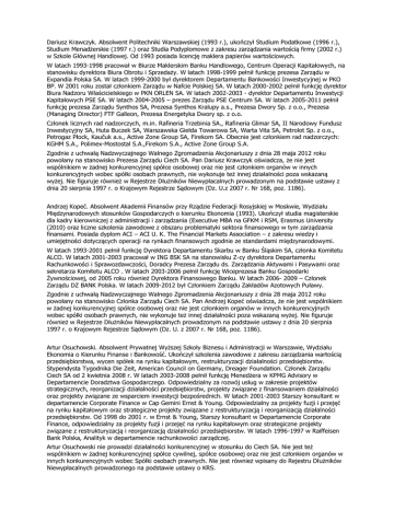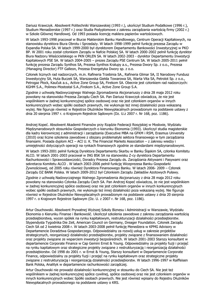 Dariusz Krawczyk. Absolwent Politechniki Warszawskiej (1993 r.), ukończył Studium Podatkowe (1996 r.), Studium Menadżerskie (1997 r.) oraz Studia Podyplomowe z zakresu zarządzania wartością firmy (2002 r.) w Szkole Głównej Handlowej. Od 1993 posiada licencję maklera papierów wartościowych. W latach 1993-1998 pracował w Biurze Maklerskim Banku Handlowego, Centrum Operacji Kapitałowych, na stanowisku dyrektora Biura Obrotu i Sprzedaży. W latach 1998-1999 pełnił funkcję prezesa Zarządu w Expandia Polska SA. W latach 1999-2000 był dyrektorem Departamentu Bankowości Inwestycyjnej w PKO BP. W 2001 roku został członkiem Zarządu w Nafcie Polskiej SA. W latach 2000-2002 pełnił funkcję dyrektor Biura Nadzoru Właścicielskiego w PKN ORLEN SA. W latach 2002-2003 - dyrektor Departamentu Inwestycji Kapitałowych PSE SA. W latach 2004-2005 – prezes Zarządu PSE Centrum SA. W latach 2005-2011 pełnił funkcję prezesa Zarządu Synthos SA, Prezesa Synthos Kralupy a.s., Prezesa Dwory Sp. z o.o., Prezesa (Managing Director) FTF Galleon, Prezesa Energetyka Dwory sp. z o.o. Członek licznych rad nadzorczych, m.in. Rafineria Trzebinia SA., Rafineria Glimar SA, II Narodowy Fundusz Inwestycyjny SA, Huta Buczek SA, Warszawska Giełda Towarowa SA, Warta Vita SA, Petrolot Sp. z o.o., Petrogaz Płock, Kaučuk a.s., Active Zone Group SA, Firekom SA. Obecnie jest członkiem rad nadzorczych: KGHM S.A., Polimex-Mostostal S.A.,Firekom S.A., Active Zone Group S.A. Zgodnie z uchwałą Nadzwyczajnego Walnego Zgromadzenia Akcjonariuszy z dnia 28 maja 2012 roku powołany na stanowisko Prezesa Zarządu Ciech SA. Pan Dariusz Krawczyk oświadcza, że nie jest wspólnikiem w żadnej konkurencyjnej spółce osobowej oraz nie jest członkiem organów w innych konkurencyjnych wobec spółki osobach prawnych, nie wykonuje też innej działalności poza wskazaną wyżej. Nie figuruje również w Rejestrze Dłużników Niewypłacalnych prowadzonym na podstawie ustawy z dnia 20 sierpnia 1997 r. o Krajowym Rejestrze Sądowym (Dz. U.z 2007 r. Nr 168, poz. 1186). Andrzej Kopeć. Absolwent Akademii Finansów przy Rządzie Federacji Rosyjskiej w Moskwie, Wydziału Międzynarodowych stosunków Gospodarczych o kierunku Ekonomia (1993). Ukończył studia magisterskie dla kadry kierowniczej z administracji i zarządzania (Executive MBA na GFKM i RSM, Erasmus University (2010) oraz liczne szkolenia zawodowe z obszaru problematyki sektora finansowego w tym zarządzania finansami. Posiada dyplom ACI – ACI U. K. The Financial Markets Association – z zakresu wiedzy i umiejętności dotyczących operacji na rynkach finansowych zgodnie ze standardami międzynarodowymi. W latach 1993-2001 pełnił funkcję Dyrektora Departamentu Skarbu w Banku Śląskim SA, członka Komitetu ALCO. W latach 2001-2003 pracował w ING BSK SA na stanowisku Z-cy dyrektora Departamentu Rachunkowości i Sprawozdawczości, Doradcy Prezesa Zarządu ds. Zarządzania Aktywami i Pasywami oraz sekretarza Komitetu ALCO . W latach 2003-2006 pełnił funkcję Wiceprezesa Banku Gospodarki Żywnościowej, od 2005 roku również Dyrektora Finansowego Banku. W latach 2006- 2009 – Członek Zarządu DZ BANK Polska. W latach 2009-2012 był Członkiem Zarządu Zakładów Azotowych Puławy. Zgodnie z uchwałą Nadzwyczajnego Walnego Zgromadzenia Akcjonariuszy z dnia 28 maja 2012 roku powołany na stanowisko Członka Zarządu Ciech SA. Pan Andrzej Kopeć oświadcza, że nie jest wspólnikiem w żadnej konkurencyjnej spółce osobowej oraz nie jest członkiem organów w innych konkurencyjnych wobec spółki osobach prawnych, nie wykonuje też innej działalności poza wskazaną wyżej. Nie figuruje również w Rejestrze Dłużników Niewypłacalnych prowadzonym na podstawie ustawy z dnia 20 sierpnia 1997 r. o Krajowym Rejestrze Sądowym (Dz. U. z 2007 r. Nr 168, poz. 1186). Artur Osuchowski. Absolwent Prywatnej Wyższej Szkoły Biznesu i Administracji w Warszawie, Wydziału Ekonomia o Kierunku Finanse i Bankowość. Ukończył szkolenia zawodowe z zakresu zarządzania wartością przedsiębiorstwa, wycen spółek na rynku kapitałowym, restrukturyzacji działalności przedsiębiorstw. Stypendysta Tygodnika Die Zeit, American Council on Germany, Dreager Foundation. Członek Zarządu Ciech SA od 2 kwietnia 2008 r. W latach 2003-2008 pełnił funkcję Menedżera w KPMG Advisory w Departamencie Doradztwa Gospodarczego. Odpowiedzialny za rozwój usług w zakresie projektów strategicznych, reorganizacji działalności przedsiębiorstw, projekty związane z finansowaniem działalności oraz projekty związane ze wsparciem inwestycji bezpośrednich. W latach 2001-2003 Starszy konsultant w departamencie Corporate Finance w Cap Gemini Ernst & Young. Odpowiedzialny za projekty fuzji i przejęć na rynku kapitałowym oraz strategiczne projekty związane z restrukturyzacją i reorganizacją działalności przedsiębiorstw. Od 1998 do 2001 r. w Ernst & Young, Starszy konsultant w Departamencie Corporate Finance, odpowiedzialny za projekty fuzji i przejęć na rynku kapitałowym oraz strategiczne projekty związane z restrukturyzacją i reorganizacją działalności przedsiębiorstw. W latach 1996-1997 w Raiffeisen Bank Polska, Analityk w departamencie rachunkowości zarządczej. Artur Osuchowski nie prowadzi działalności konkurencyjnej w stosunku do Ciech SA. Nie jest też wspólnikiem w żadnej konkurencyjnej spółce cywilnej, spółce osobowej oraz nie jest członkiem organów w innych konkurencyjnych wobec Spółki osobach prawnych. Nie jest również wpisany do Rejestru Dłużników Niewypłacalnych prowadzonego na podstawie ustawy o KRS.