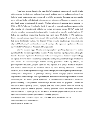 Przewlekła obturacyjna choroba płuc (POChP) należy do najczęstszych chorób układu oddechowego. Jest jednym z nielicznych schorzeń, na które pomimo wielu prowadzonych na świecie badań naukowych oraz ogromnych wysiłków przemysłu farmaceutycznego zapada coraz większa liczba osób. Zajmuje obecnie czwarte miejsce wśród przyczyn zgonów, tuz po chorobach serca, nowotworach i urazach. Według najnowszych danych statystycznych w USA na POChP choruje 50 milionów ludzi. U chorych ze znacznie upośledzoną czynnością płuc rozwija się niewydolność oddechowa będąca przyczyna zgonu. POChP może być również pośrednią przyczyną śmierci pacjentów chorujących na choroby układu krążenia. W Polsce na przewlekłą obturacyjną chorobę płuc cierpi około 5% kobiet i 10% mężczyzn. Liczbę chorych szacuje się na 2 mln, jednak faktyczna liczba cierpiących na te chorobę może być nawet trzykrotnie wyższa. Co dziesiąty Polak powyżej trzydziestego roku życia ma objawy POChP, a 3,6% jest hospitalizowanych każdego roku z powodu tej choroby. Rocznie z powodu POChP umiera w Polsce ok. 15 tysięcy osób. Choroba zaczyna się po 30 roku życia i początkowo przebiega bezobjawowo, można ją wykryć tylko poprzez odpowiednie badanie. Później pojawiają się objawy takie jak: ciągły kaszel i duszność wysiłkowa. Narastające trudności w oddychaniu stopniowo doprowadzają do ciężkiej niewydolności oddechowej, niewydolności krążenia, przedwczesnego inwalidztwa oraz śmierci. W zaawansowanym stadium choroby pacjentowi trudno się oddycha, co powoduje łatwe męczenie, pacjent ogranicza więc wysiłek, a to sprzyja zanikowi mięśni w tym również oddechowych. W rezultacie obniża się coraz bardziej sprawność i narasta duszność, którą można opanować stosując farmakoterapię a w końcowym etapie tlenoterapię. Zmniejszenie dolegliwości w przebiegu choroby można osiągnąć poprzez stosowanie odpowiedniej farmakoterapii oraz fizjoterapii (np. poprzez stosowanie odpowiednich ćwiczeń oddechowych). Nie można jednak zapomnieć o nieodwracalnych zmianach w płucach w postaci rozedmy, które pomimo zastosowanego leczenia będą się pogłębiać. Choroba ta najczęściej dotyka palaczy tytoniu, najlepiej jest więc rzucić palenie wówczas można się spodziewać poprawy zdrowia pacjenta. Niestety pacjenci często lekceważą początkowe objawy choroby i zgłaszają się do lekarza w momencie pogorszenia się stanu zdrowia. Oprócz wieloletniego palenia, powstawaniu choroby sprzyjają: - zanieczyszczenie środowiska (dym, kurz, obecność pyłów, dwutlenku siarki) - częste infekcje dróg oddechowych, - predyspozycje genetyczne. Również często lekarze nie rozpoznają POChP w początkowym bezobjawowym przebiegu choroby, co utrudnia w znacznym stopniu szybką i skuteczną interwencję. Bardzo ważne w rozpoznaniu POChP jest przeprowadzenie właściwego wywiadu, w którym należy zwrócić uwagę na występowanie: -astmy, - alergii, - zapalenia zatok przynosowych lub polipów nosa, - zakażeń układu oddechowego w dzieciństwie oraz innych chorób układu oddechowego. Ważne jest również współistnienie takich chorób, jak choroby serca czy choroby reumatyczne. Podstawową metodą diagnostyczną jest spirometria prowadząca do oceny parametrów dróg oddechowych i płuc, a pozwalająca na rozpoznanie choroby nawet w stadium bezobjawowym. Badaniami dodatkowymi są: - próba odwracalności obturacji z użyciem leku rozkurczającego oskrzela, - radiogram klatki piersiowej ( wyklucza inne choroby). U ludzi młodych (< 45 lat) wykonuje się badania w kierunku niedoboru alfa1-antytrypsyny. Przewlekła obturacyjna choroba płuc charakteryzuje się nieodwracalnym ograniczeniem przepływu powietrza przez drogi oddechowe w następstwie przewlekłego zapalenia oskrzeli lub rozedmy. W obrazie spirometrycznym widoczne jest to jako zmniejszony stosunek natężonej pierwszosekundowej objętości wydechowej do nasilonej pojemności życiowej (FEV1/FVC < 70%). Przebieg choroby może powodować występowanie nagłych zaostrzeń, widocznych w spirometrogramie jako gwałtowny spadek FEV1. W obrazie klinicznym często jest to nasilenie duszności oraz zwiększona ilość odksztuszanej wydzieliny, często ropnej. Jednym z pierwszych niepokojących sygnałów POChP jest przewlekły kaszel. W zaawansowanym stadium choroby pojawiają się: duszność podczas wysiłku, w trakcie wykonywania codziennych czynności, a w końcu trudności z oddychaniem nawet podczas snu. Podstawowa czynność życiowa, jaką jest oddychanie, zostaje nieodwracalnie zakłócona. Duszność ta może tak ograniczyć aktywność pacjenta, że nie jest on w stanie samodzielnie wykonywać takich czynności dnia codziennego, jak: wchodzenie po schodach, zabiegi higieniczne czy przygotowanie posiłku. Może to poważnie wpłynąć na jakość życia prowadząc w niektórych przypadkach do izolacji społecznej i depresji. Szansa na uniknięcie poważnych skutków choroby jest jej wczesne wykrycie oraz natychmiastowe rozpoczęcie leczenia. Podjęcie tych działań spowolni dalszy rozwój choroby oraz da szansę choremu na w miarę normalne życie. Osoby chorujące na POChP są leczone głównie ambulatoryjnie, a w przypadku zaostrzeń objawów hospitalizowane. Leczenie szpitalne jest długotrwałe i związane z przyjmowaniem odpowiednich leków i tlenoterapią. Przez wiele lat leczenie chorych na POChP polegało na podawaniu pacjentom leków przeznaczonych do leczenia astmy, obecnie dostępne są długo działające leki przeznaczone dla pacjentów z tą jednostką chorobową. Stosowane leki pomagają poprawić jakość życia osób dotkniętych tą chorobą. Obok farmakoterapii lekarze również zalecają stosowanie szczepionki przeciw grypie jako rodzaj leczenia uzupełniającego i uodpornienia dla osób zagrożonych POChP. Istotną rolę odgrywa edukacja zdrowotna, zwłaszcza w radzeniu sobie z tą choro