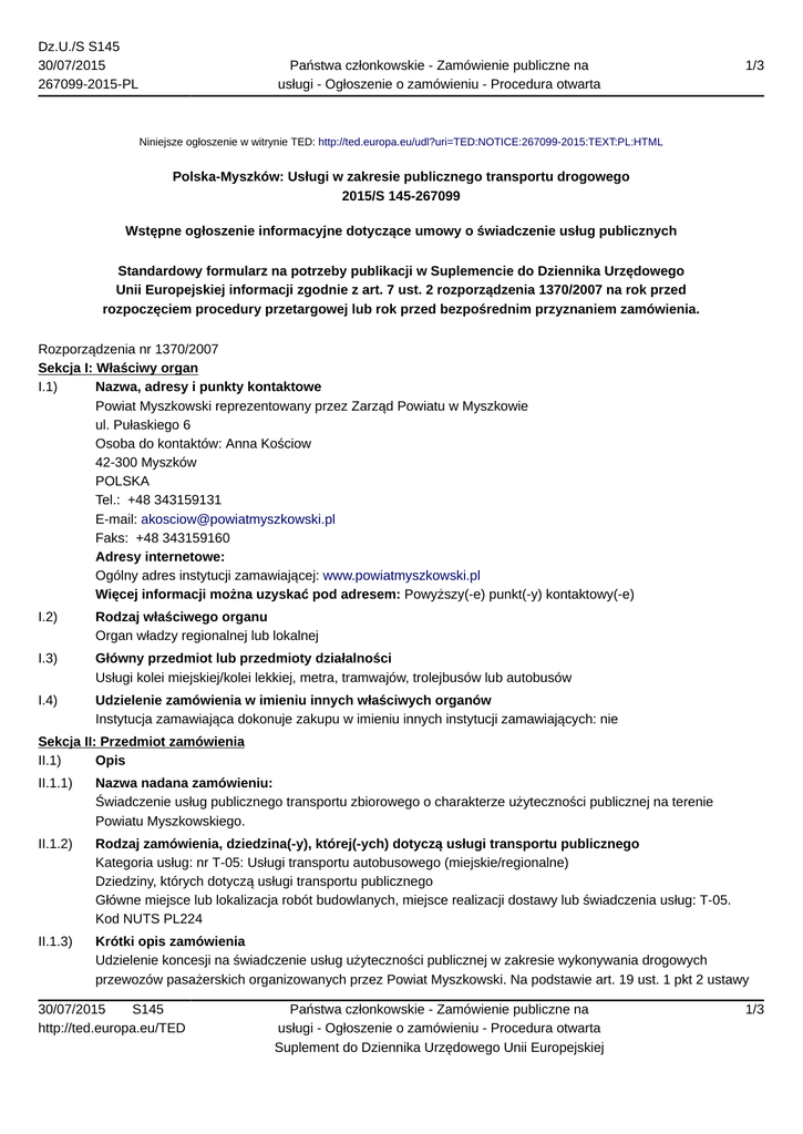 Dz.U./S S145 30/07/2015 267099-2015-PL Państwa członkowskie - Zamówienie publiczne na usługi - Ogłoszenie o zamówieniu - Procedura otwarta 1/3 Niniejsze ogłoszenie w witrynie TED: http://ted.europa.eu/udl?uri=TED:NOTICE:267099-2015:TEXT:PL:HTML Polska-Myszków: Usługi w zakresie publicznego transportu drogowego 2015/S 145-267099 Wstępne ogłoszenie informacyjne dotyczące umowy o świadczenie usług publicznych Standardowy formularz na potrzeby publikacji w Suplemencie do Dziennika Urzędowego Unii Europejskiej informacji zgodnie z art. 7 ust. 2 rozporządzenia 1370/2007 na rok przed rozpoczęciem procedury przetargowej lub rok przed bezpośrednim przyznaniem zamówienia. Rozporządzenia nr 1370/2007 Sekcja I: Właściwy organ I.1) Nazwa, adresy i punkty kontaktowe Powiat Myszkowski reprezentowany przez Zarząd Powiatu w Myszkowie ul. Pułaskiego 6 Osoba do kontaktów: Anna Kościow 42-300 Myszków POLSKA Tel.: +48 343159131 E-mail: [email protected] Faks: +48 343159160 Adresy internetowe: Ogólny adres instytucji zamawiającej: www.powiatmyszkowski.pl Więcej informacji można uzyskać pod adresem: Powyższy(-e) punkt(-y) kontaktowy(-e) I.2) Rodzaj właściwego organu Organ władzy regionalnej lub lokalnej I.3) Główny przedmiot lub przedmioty działalności Usługi kolei miejskiej/kolei lekkiej, metra, tramwajów, trolejbusów lub autobusów I.4) Udzielenie zamówienia w imieniu innych właściwych organów Instytucja zamawiająca dokonuje zakupu w imieniu innych instytucji zamawiających: nie Sekcja II: Przedmiot zamówienia II.1) Opis II.1.1) Nazwa nadana zamówieniu: Świadczenie usług publicznego transportu zbiorowego o charakterze użyteczności publicznej na terenie Powiatu Myszkowskiego. II.1.2) Rodzaj zamówienia, dziedzina(-y), której(-ych) dotyczą usługi transportu publicznego Kategoria usług: nr T-05: Usługi transportu autobusowego (miejskie/regionalne) Dziedziny, których dotyczą usługi transportu publicznego Główne miejsce lub lokalizacja robót budowlanych, miejsce realizacji dostawy lub świadczenia usług: T-05. Kod NUTS PL224 II.1.3) Krótki opis zamówienia Udzielenie koncesji na świadczenie usług użyteczności publicznej w zakresie wykonywania drogowych przewozów pasażerskich organizowanych przez Powiat Myszkowski. Na podstawie art. 19 ust. 1 pkt 2 ustawy 30/07/2015 S145 http://ted.europa.eu/TED Państwa członkowskie - Zamówienie publiczne na usługi - Ogłoszenie o zamówieniu - Procedura otwarta Suplement do Dziennika Urzędowego Unii Europejskiej 1/3 Dz.U./S S145 30/07/2015 267099-2015-PL Państwa członkowskie - Zamówienie publiczne na usługi - Ogłoszenie o zamówieniu - Procedura otwarta 2/3 z 16.12.2010 o publicznym transporcie zbiorowym (Dz.U. z 2011, Nr 5 poz.13 z późn. zm.) organizator dokona wyboru operatora poprzez udzielenie koncesji na usługi w trybie ustawy z 9.1.2009 o koncesji na roboty budowlane lub usługi (Dz.U. z 2015 poz. 113 z późn. zm.). Na podstawie art. 22 ust. 1 pkt 1 ustawy z 16.12.2010 o publicznym transporcie zbiorowym (Dz.U. z 2011, Nr 5 poz. 13 z późn. zm.) organizator dokona bezpośredniego zawarcia umowy o świadczenie usług w zakresie publicznego transportu zbiorowego w przypadku gdy średnia wartość roczna przedmiotu umowy jest mniejsza niż 1000000 euro lub świadczenie usług w zakresie publicznego transportu zbiorowego dotyczy świadczenia tych usług w wymiarze mniejszym niż 300000 kilometrów rocznie. II.1.4) Wspólny Słownik Zamówień (CPV) 60112000 II.1.5) Informacje na temat podwykonawstwa Przewidywane jest zlecenie podwykonawstwa: nie II.2) Ilość i/lub wartość usług: II.3) Planowana data rozpoczęcia i czas trwania zamówienia lub termin realizacji Rozpoczęcie: 1.1.2017 Okres w miesiącach: 60 (od udzielenia zamówienia) II.4) Krótki opis rodzaju i zakresu robót budowlanych Sekcja IV: Procedura IV.1) Rodzaj procedury Otwarta IV.2) Kryteria udzielenia zamówienia IV.2.1) Kryteria udzielenia zamówienia IV.2.2) Informacje na temat aukcji elektronicznej Wykorzystana będzie aukcja elektroniczna: nie IV.3) Informacje administracyjne IV.3.1) Numer referencyjny: IV.3.2) Warunki uzyskania specyfikacji i dokumentów dodatkowych IV.3.3) Termin składania ofert lub wniosków o dopuszczenie do udziału w postępowaniu 30.9.2016 IV.3.4) Języki, w których można sporządzać oferty lub wnioski o dopuszczenie do udziału w postępowaniu polski. IV.3.5) Minimalny okres, w którym oferent będzie związany ofertą IV.3.6) Warunki otwarcia ofert Sekcja VI: Informacje uzupełniające VI.1) Informacje dodatkowe: Na podstawie art. 23 ust. 5 ustawy z 16.12.2010 o publicznym transporcie zbiorowym (Dz.U. z 2011 r. nr 5 poz.13) zastrzega się możliwość zmiany powyższych informacji. VI.2) Procedury odwoławcze VI.2.1) Organ odpowiedzialny za procedury odwoławcze 30/07/2015 S145 http://ted.europa.eu/TED Państwa członkowskie - Zamówienie publiczne na usługi - Ogłoszenie o zamówieniu - Procedura otwarta Suplement do Dziennika Urzędowego Unii Europejskiej 2/3 Dz.U./S S145 30/07/2015 267099-2015-PL Państwa członkowskie - Zamówienie publiczne na usługi - Ogłoszenie o zamówieniu - Procedura otwarta VI.2.2) Składanie odwołań VI.2.3) Źródło, gdzie można uzyskać informacje na temat składania odwołań VI.3) Ogłoszenie o udzieleniu zamówienia: Planowana data publikacji: 30.11.2016 Ogłoszenie o udzieleniu zamówienia zostanie opublikowane w Suplemencie do Dziennika Urzędowego Unii Europejskiej: VI.4) Data wysłania niniejszego ogłoszenia: 27.7.2015 30/07/2015 S145 http://ted.europa.eu/TED Państwa członkowskie - Zamówienie publiczne na usługi - Ogłoszenie o zamówieniu - Procedura otwarta Suplement do Dziennika Urzędowego Unii Europejskiej 3/3 3/3