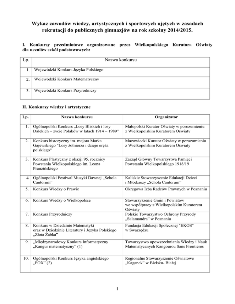 Wykaz zawodów wiedzy, artystycznych i sportowych ujętych w zasadach rekrutacji do publicznych gimnazjów na rok szkolny 2014/2015. I. Konkursy przedmiotowe organizowane przez Wielkopolskiego Kuratora Oświaty dla uczniów szkół podstawowych: Lp. Nazwa konkursu 1. Wojewódzki Konkurs Języka Polskiego 2. Wojewódzki Konkurs Matematyczny 3. Wojewódzki Konkurs Przyrodniczy II. Konkursy wiedzy i artystyczne Lp. Nazwa konkursu Organizator 1. Ogólnopolski Konkurs „Losy Bliskich i losy Dalekich – życie Polaków w latach 1914 – 1989” Małopolski Kurator Oświaty w porozumieniu z Wielkopolskim Kuratorem Oświaty 2. Konkurs historyczny im. majora Marka Gajewskiego "Losy żołnierza i dzieje oręża polskiego" Mazowiecki Kurator Oświaty w porozumieniu z Wielkopolskim Kuratorem Oświaty 3. Konkurs Plastyczny z okazji 95. rocznicy Powstania Wielkopolskiego im. Leona Prauzińskiego Zarząd Główny Towarzystwa Pamięci Powstania Wielkopolskiego 1918/19 4 Ogólnopolski Festiwal Muzyki Dawnej „Schola Kaliskie Stowarzyszenie Edukacji Dzieci i Młodzieży „Schola Cantorum” 5. Konkurs Wiedzy o Prawie Okręgowa Izba Radców Prawnych w Poznaniu 6. Konkurs Wiedzy o Wielkopolsce Stowarzyszenie Gmin i Powiatów we współpracy z Wielkopolskim Kuratorem Oświaty Polskie Towarzystwo Ochrony Przyrody „Salamandra” w Poznaniu Cantorum” 7. Konkurs Przyrodniczy 8. Konkurs w Dziedzinie Matematyki oraz w Dziedzinie Literatury i Języka Polskiego „Złota Żabka” Fundacja Edukacji Społecznej "EKOS" w Swarzędzu 9. „Międzynarodowy Konkurs Informatyczny „Kangur matematyczny” (1) Towarzystwo upowszechniania Wiedzy i Nauk Matematycznych Kangourou Sans Frontieres 10. Ogólnopolski Konkurs Języka angielskiego „FOX” (2) Regionalne Stowarzyszenie Oświatowe „Kaganek” w Bielsku- Białej 1 11. XXIX Wojewódzki Konkurs Recytatorski MDK nr 2 w Poznaniu 12. XV Wielkopolski Konkurs Dziennikarski MDK nr 1w Poznaniu 13. XXXIII Wojewódzki Turniej „Białych Piór” MDK nr 1 w Poznaniu 14. Międzynarodowy Konkurs Informatyczny „Bóbr” Wydział Matematyki i Informatyki Uniwersytety Mikołaja Kopernika w Toruniu III. Uwaga: (1). Wynik bardzo dobry i wyróżnienia w konkursie odpowiadają miejscom 1-3 na szczeblu ogólnopolskim (2) Wynik bardzo dobry i dobry w konkursie odpowiadają miejscom 1-3 na szczeblu ogólnopolskim IV. Zawody sportowe1 - Wojewódzkie i Międzywojewódzkie Mistrzostwa Młodzików, - Igrzyska Młodzieży Szkolnej organizowane przez Szkolny Związek Sportowy, w następujących dyscyplinach sportu2: aerobik biathlon curling jeździectwo karate tradycyjne koszykówka łyżwiarstwo piłka nożna piłka wodna rugby sporty saneczkowe szachy tenis stołowy wioślarstwo akrobatyka sportowa bilard gimnastyka judo karate WKF, kyokushin kręglarstwo narciarstwo piłka ręczna pływanie skoki do wody sporty wrotkarskie szermierka triathlon zapasy badminton boks hokej na lodzie kajakarstwo kick-boxing baseball brydż sportowy hokej na trawie kajak polo kolarstwo lekka atletyka orientacja sportowa piłka siatkowa pływanie synchroniczne snowboard strzelectwo sportowe taekwondo olimpijskie unihokej żeglarstwo łucznictwo pięciobój nowoczesny piłka siatkowa plażowa podnoszenie ciężarów sporty motorowe sumo tenis warcaby 1 Organizowane zgodnie z rozporządzeniem Ministra Edukacji Narodowej z dnia 17 października 2001 r. w sprawie zasad współzawodnictwa sportowego dzieci i młodzieży (Dz. U. Nr 128, poz.1416). 2 Wykaz dyscyplin sportu objętych współzawodnictwem sportowym dzieci i młodzieży szkolnej ustalony przez Polską Federację Sportu i Szkolny Związek Sportowy. 2