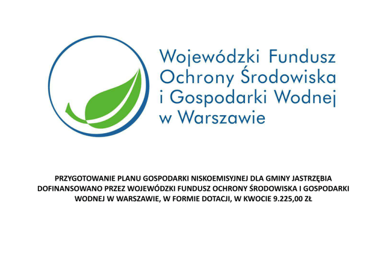 PRZYGOTOWANIE PLANU GOSPODARKI NISKOEMISYJNEJ DLA GMINY JASTRZĘBIA DOFINANSOWANO PRZEZ WOJEWÓDZKI FUNDUSZ OCHRONY ŚRODOWISKA I GOSPODARKI WODNEJ W WARSZAWIE, W FORMIE DOTACJI, W KWOCIE 9.225,00 ZŁ