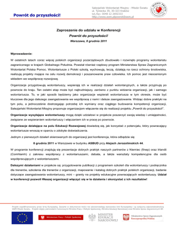 Salezjański Wolontariat Misyjny - Młodzi Światu ul. Tyniecka 39, 30-323 Kraków tel./fax: 0048 12 2692333 http://[email protected] Powrót do przyszłości! Zaproszenie do udziału w Konferencji Powrót do przyszłości! Warszawa, 8 grudnia 2011 Wprowadzenie: W ostatnich latach coraz więcej polskich organizacji pozarządowych zbudowało i rozwinęło programy wolontariatu zagranicznego w krajach Globalnego Południa. Powstał również rządowy program Ministerstwa Spraw Zagranicznych Wolontariat Polska Pomoc. Wolontariusze z Polski szkolą, wychowują, leczą, działają na rzecz ochrony środowiska, realizują projekty mające na celu rozwój demokracji i poszanowanie praw człowieka. Ich pomoc jest nieocenionym wkładem we współpracę rozwojową. Organizacje przygotowują wolontariuszy, wspierają ich w realizacji działań wolontaryjnych, a także przyjmują po powrocie do kraju. Ten ostatni etap może być najtrudniejszy, zarówno z punktu widzenia organizacji, jak i samego wolontariusza. To, w jaki sposób będziemy jako organizacje wspierali wolontariusza w tym okresie, może być kluczowe dla jego dalszego zaangażowania we współpracę z nami i dalsze zaangażowanie. Widząc dobre praktyki na tym polu, a jednocześnie dostrzegając potrzebę ich wymiany oraz ciągłego budowania kompetencji organizacji, Salezjański Wolontariat Misyjny proponuje organizacjom włączenie się do realizacji projektu „Powrót do przyszłości!”. Organizacje wysyłające wolontariuszy mogą dzięki udziałowi w projekcie poszerzyć swoją wiedzę i umiejęstności, związane ze wspieraniem wolontariuszy i włączaniem ich w pracę po powrocie. Organizacje działające na polu Edukacji Rozwojowej dowiedzą się, jak korzystać z potencjału, który powracający wolontariusze wnoszą w oparciu o zdobyte doświadczenia. Jednym z pierwszych działań skierowanych do organizacji jest konferencja, która odbędzie się 8 grudnia 2011 w Warszawie w budynku ASBUD przy Alejach Jerozolimskich 44. W programie konferencji znajdują się prezentacje dobrych praktyk naszych partnerów z Niemiec (finep) oraz Irlandii (Comhlamh) z zakresu współpracy z wolontariuszami, debata, a także warsztaty kompetencyjne dla osób współpracujących z wolontariuszami. Dalszymi działaniami w projekcie są: przygotowanie publikacji z programem szkoleń dla wolontariuszy i podręcznika dla trenerów, szkolenia dla trenerów z organizacji, mapowanie i katalog dobrych praktyk polskich organizacji, badanie dotyczące zaangażowania wolontariuszy, mini – granty na projekty edukacyjne powracających wolontariuszy. Udział w konferencji pozwoli Waszej organizacji włączyć się w te działania i skorzystać z ich rezultatów! Projekt współfinansowany przez Unię Europejską. Zawarte w dokumencie treści nie odzwierciedlają stanowiska Unii Europejskiej i są wyłączną odpowiedzialnością SWM Młodzi Światu. Projekt objęty patronatami honorowymi Ministra Pracy i Polityki Społecznej, Ministra Edukacji Narodowej oraz Ministra Spraw Zagranicznych RP. Salezjański Wolontariat Misyjny - Młodzi Światu ul. Tyniecka 39, 30-323 Kraków tel./fax: 0048 12 2692333 http://[email protected] Powrót do przyszłości! Informacje praktyczne: • Sesja plenarna prowadzona będzie w językach polskim i angielskim, przy czym jako organizatorzy zapewniamy tłumaczenie symultaniczne. • Warsztaty również podzielone są na grupy językowe. Dwa w języku polskim i dwa po angielsku. • Udział w konferencji jest bezpłatny, z jednej organizacji może uczestniczyć więcej niż jedna osoba. • Dla osób spoza Warszawy zapewniamy zwrot kosztów podróży. • Po konferencji materiały zostaną Państwu udostępnione w wersji elektronicznej. • Zgłoszenia przyjmujemy do dnia 2 grudnia – ilość miejsc ograniczona! W załączniku przesyłamy szczegółowy program konferencji oraz formularz zgłoszeniowy. . Informacje o projekcie: Projekt „Powrót do przyszłości!” jest odpowiedzią Salezjańskiego Wolontariatu Misyjnego na problem niewielkiego zaangażowania się wolontariuszy powracających z pracy w krajach Globalnego Południa w dalsze działania z zakresu Edukacji Rozwojowej. Widzimy w wolontariuszach niezwykły potencjał: doświadczenie pracy wolontaryjnej daje możliwość dzielenia się wyjątkowymi przeżyciami, czyniąc z wolontariuszy wiarygodnych i kompetentnych edukatorów. Wiemy też, że powrót po wielu miesiącach spędzonych w tak odmiennej rzeczywistości nie jest łatwy i organizacje wysyłające powinny być pierwszym środowiskiem wspierającym wolontariusza i umożliwiającym mu dalszy rozwój. Jednocześnie obserwujemy, że większość organizacji wysyłających wolontariuszy w bardzo ograniczonym stopniu korzysta z ich potencjału po powrocie, wiele nie ma również specjalnego programu, mającego na celu pomoc wolontariuszom w „Powrocie do przyszłości!”. Dlatego działania projektu skupiały się będą przede wszystkim na współpracy z organizacjami, dzieleniu się doświadczeniem i wypracowaniu polskich standardów współpracy z wolontariuszami powracającymi z placówek zagranicznych. Projekt realizowany jest przy współpracy partnerów w Niemczech (www.finep.org) oraz Irlandii (www.comhlamh.org), współfinansowany przez Unię Europejską w ramach programu EuropeAid. Salezjański Wolontariat Misyjny od 1999 roku realizuje projekty wolontariatu w krajach Afryki, Ameryki Południowej, Azji i Europy Wschodniej. Do tej pory w działaniach wychowawczych, edukacyjnych, projektach budowlanych i medycznych wzięło udział ponad 250 wolontariuszy SWM. Nasza organizacja była konsultantem przy tworzeniu programu Wolontariatu Polskiej Pomocy MSZ, od początku realizacji programu wolontariusze SWM biorą w nim udział każdego roku. Projekt współfinansowany przez Unię Europejską. Zawarte w dokumencie treści nie odzwierciedlają stanowiska Unii Europejskiej i są wyłączną odpowiedzialnośc