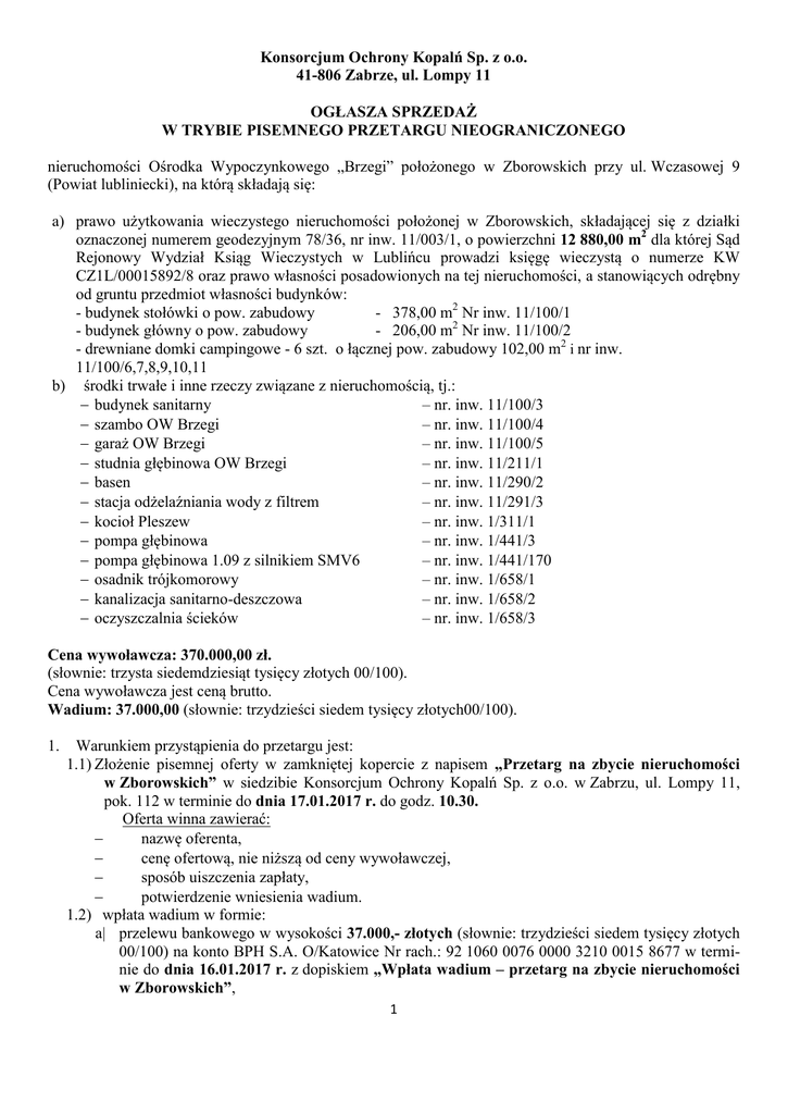 Konsorcjum Ochrony Kopalń Sp. z o.o. 41-806 Zabrze, ul. Lompy 11 OGŁASZA SPRZEDAŻ W TRYBIE PISEMNEGO PRZETARGU NIEOGRANICZONEGO nieruchomości Ośrodka Wypoczynkowego „Brzegi” położonego w Zborowskich przy ul. Wczasowej 9 (Powiat lubliniecki), na którą składają się: a) prawo użytkowania wieczystego nieruchomości położonej w Zborowskich, składającej się z działki oznaczonej numerem geodezyjnym 78/36, nr inw. 11/003/1, o powierzchni 12 880,00 m2 dla której Sąd Rejonowy Wydział Ksiąg Wieczystych w Lublińcu prowadzi księgę wieczystą o numerze KW CZ1L/00015892/8 oraz prawo własności posadowionych na tej nieruchomości, a stanowiących odrębny od gruntu przedmiot własności budynków: - budynek stołówki o pow. zabudowy - 378,00 m2 Nr inw. 11/100/1 - budynek główny o pow. zabudowy - 206,00 m2 Nr inw. 11/100/2 - drewniane domki campingowe - 6 szt. o łącznej pow. zabudowy 102,00 m2 i nr inw. 11/100/6,7,8,9,10,11 b) środki trwałe i inne rzeczy związane z nieruchomością, tj.: budynek sanitarny – nr. inw. 11/100/3 szambo OW Brzegi – nr. inw. 11/100/4 garaż OW Brzegi – nr. inw. 11/100/5 studnia głębinowa OW Brzegi – nr. inw. 11/211/1 basen – nr. inw. 11/290/2 stacja odżelaźniania wody z filtrem – nr. inw. 11/291/3 kocioł Pleszew – nr. inw. 1/311/1 pompa głębinowa – nr. inw. 1/441/3 pompa głębinowa 1.09 z silnikiem SMV6 – nr. inw. 1/441/170 osadnik trójkomorowy – nr. inw. 1/658/1 kanalizacja sanitarno-deszczowa – nr. inw. 1/658/2 oczyszczalnia ścieków – nr. inw. 1/658/3 Cena wywoławcza: 370.000,00 zł. (słownie: trzysta siedemdziesiąt tysięcy złotych 00/100). Cena wywoławcza jest ceną brutto. Wadium: 37.000,00 (słownie: trzydzieści siedem tysięcy złotych00/100). 1. Warunkiem przystąpienia do przetargu jest: 1.1) Złożenie pisemnej oferty w zamkniętej kopercie z napisem „Przetarg na zbycie nieruchomości w Zborowskich” w siedzibie Konsorcjum Ochrony Kopalń Sp. z o.o. w Zabrzu, ul. Lompy 11, pok. 112 w terminie do dnia 17.01.2017 r. do godz. 10.30. Oferta winna zawierać: nazwę oferenta, cenę ofertową, nie niższą od ceny wywoławczej, sposób uiszczenia zapłaty, potwierdzenie wniesienia wadium. 1.2) wpłata wadium w formie: a| przelewu bankowego w wysokości 37.000,- złotych (słownie: trzydzieści siedem tysięcy złotych 00/100) na konto BPH S.A. O/Katowice Nr rach.: 92 1060 0076 0000 3210 0015 8677 w terminie do dnia 16.01.2017 r. z dopiskiem „Wpłata wadium – przetarg na zbycie nieruchomości w Zborowskich”, 1 b| gwarancji bankowej lub ubezpieczeniowej w wysokości 37.000,- zł płatnej w przypadku przepadku wadium na rzecz Konsorcjum Ochrony Kopalń Sp. z o.o., c| wpłaty gotówkowej w kasie Spółki w Zabrzu przy ul. Lompy 11 (kasa czynna w dni robocze w godz. od 10.00 do 12.00). 2. Wadium ulega przepadkowi na rzecz Konsorcjum Ochrony Kopalń Sp. z o.o. w Zabrzu w razie cofnięcia lub zmiany oferty po rozpoczęciu przetargu lub w razie uchylenia się oferenta, który przetarg wygrał od zawarcia umowy na warunkach określonych w ofercie. 3. Wszelkie koszty i opłaty związane z zawarciem umowy sprzedaży pokrywa nabywca. 4. Do dnia podpisania notarialnej umowy sprzedaży winna być uiszczona w całości zapłata za nieruchomość. 5. Jeżeli kilku oferentów zaoferuje w przetargu tą samą cenę, która jest najwyższą z zaproponowanych przez oferentów cen, komisja przetargowa kontynuować będzie przetarg w formie licytacji lub negocjacji z tymi oferentami. W przypadku licytacji minimalne postąpienie wynosić będzie 3.700,- zł. 6. Okres ważności oferty rozpoczyna się w dniu zgłoszenia oferty, a kończy się z dniem zakończenia postępowania przetargowego. 7. Wadium wpłacone gotówką bądź przelewem przez oferenta, którego oferta zostanie wybrana zostanie zaliczone na poczet ceny sprzedaży. Pozostałym oferentom wadium zostanie niezwłocznie zwrócone. 8. Nieruchomości można oglądać we wszystkie dni robocze po wcześniejszym ustaleniu terminu w Biurze Spółki, tel. 605 431 709. Termin otwarcia ofert ustala się na dzień 17.01.2017 r. w siedzibie Spółki w Zabrzu przy ul. Lompy 11, pok. 112 o godz. 11.00. Uwaga: Nieruchomość obciążona jest hipoteką umowną zwykłą w wysokości 521.254,00 zł oraz hipoteką umowną kaucyjną w wysokości 135.530,00 zł wpisaną do Księgi Wieczystej nr CZ1L/00015892/8. Wierzytelność związana z wpisem będzie spłacona, a zabezpieczenie hipoteczne będzie wykreślone z Księgi Wieczystej przed dniem zawarcia umowy sprzedaży nieruchomości. Ogłaszający przetarg zastrzega, że warunkiem zawarcia umowy sprzedaży powyższej nieruchomości jest uzyskanie przez sprzedającego: 1) zgody Rady Nadzorczej, stosownie do postanowień § 20 ust.2 Umowy Spółki, 2) zgody Zgromadzenia Wspólników, stosownie do postanowień § 37 w zw. z art. § 36 ust. 3 pkt. 2 Umowy Spółki, 3) zgody Ministra Energii na dokonanie czynności prawnej w zakresie rozporządzania składnikami aktywów, jeżeli wartość rynkowa przedmiotu rozporządzania przekracza równowartość w złotych kwoty 50 000 euro, stosownie do postanowień art.5a ust.1 ustawy z dnia 8 sierpnia 1996 r. o zasadach wykonywania uprawnień przysługujących Skarbowi Państwa (Dz. U. Nr 106, poz. 493 z późn. zm.). Nabywca zobowiązany będzie do zaparafowania projektu umowy sprzedaży stanowiącej załącznik do wniosku kierowanego do Ministra Energii. Nabycie nieruchomości nie obejmuje wyposażenia, które będzie przedmiotem odrębnych negocjacji. Konsorcjum Ochrony Kopalń Sp. z o.o. zastrzega sobie prawo do unieważnienia przetargu bez podania przyczyn, odstąpienia od przetargu, zamknięcia przetargu bez wybrania którejkolwiek z ofert. Informacje związane z opisem nieruchomości i ich stanem prawnym można uzyskać na stronie www.kokzabrze.pl lub w siedzibie Spółki pod nr tel. 607944913, 605431709, email: [email protected]., [email protected]. Konsorcjum Ochrony Kopal