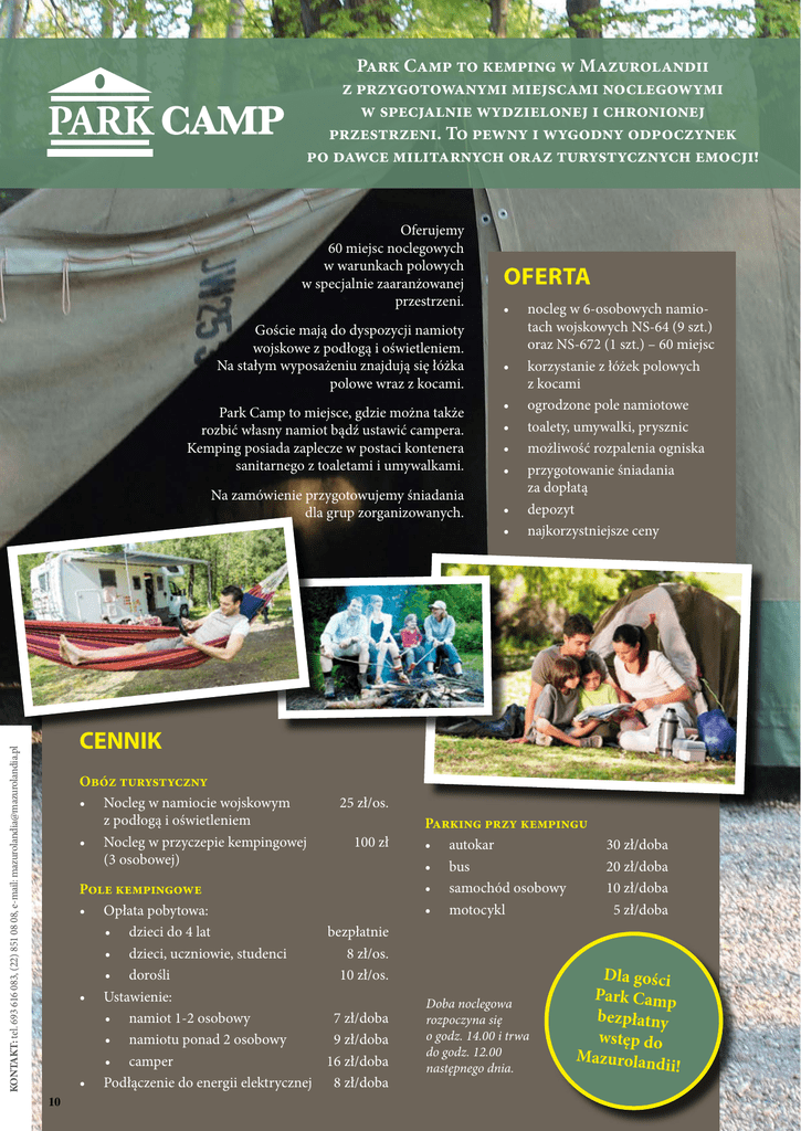 Park Camp to kemping w Mazurolandii z przygotowanymi miejscami noclegowymi w specjalnie wydzielonej i chronionej przestrzeni. To pewny i wygodny odpoczynek po dawce militarnych oraz turystycznych emocji! Oferujemy 60 miejsc noclegowych w warunkach polowych w specjalnie zaaranżowanej przestrzeni. Goście mają do dyspozycji namioty wojskowe z podłogą i oświetleniem. Na stałym wyposażeniu znajdują się łóżka polowe wraz z kocami. Park Camp to miejsce, gdzie można także rozbić własny namiot bądź ustawić campera. Kemping posiada zaplecze w postaci kontenera sanitarnego z toaletami i umywalkami. KONTAKT: tel. 693 616 083, (22) 851 08 08, e-mail: [email protected] Na zamówienie przygotowujemy śniadania dla grup zorganizowanych. OFERTA • • • • • • • • nocleg w 6-osobowych namiotach wojskowych NS-64 (9 szt.) oraz NS-672 (1 szt.) – 60 miejsc korzystanie z łóżek polowych z kocami ogrodzone pole namiotowe toalety, umywalki, prysznic możliwość rozpalenia ogniska przygotowanie śniadania za dopłatą depozyt najkorzystniejsze ceny CENNIK Obóz turystyczny • Nocleg w namiocie wojskowym z podłogą i oświetleniem • Nocleg w przyczepie kempingowej (3 osobowej) 10 25 zł/os. 100 zł Pole kempingowe • Opłata pobytowa: • dzieci do 4 lat bezpłatnie • dzieci, uczniowie, studenci 8 zł/os. • dorośli 10 zł/os. • Ustawienie: • namiot 1-2 osobowy 7 zł/doba • namiotu ponad 2 osobowy 9 zł/doba • camper 16 zł/doba • Podłączenie do energii elektrycznej 8 zł/doba Parking przy kempingu • autokar • bus • samochód osobowy • motocykl Doba noclegowa rozpoczyna się o godz. 14.00 i trwa do godz. 12.00 następnego dnia. 30 zł/doba 20 zł/doba 10 zł/doba 5 zł/doba Dla gości Park Camp bezpłatny wstęp do Mazuroland ii!
