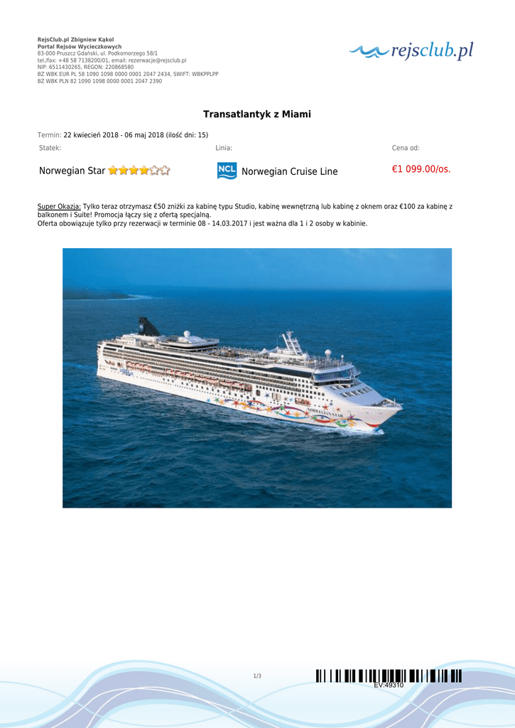 RejsClub.pl Zbigniew Kąkol Portal Rejsów Wycieczkowych 83-000 Pruszcz Gdański, ul. Podkomorzego 58/1 tel./fax: +48 58 7138200/01, email: [email protected] NIP: 6511430265, REGON: 220868580 BZ WBK EUR PL 58 1090 1098 0000 0001 2047 2434, SWIFT: WBKPPLPP BZ WBK PLN 82 1090 1098 0000 0001 2047 2390 Transatlantyk z Miami Termin: 22 kwiecień 2018 - 06 maj 2018 (ilość dni: 15) Statek: Norwegian Star Linia: Cena od: Norwegian Cruise Line €1 099.00/os. Super Okazja: Tylko teraz otrzymasz €50 zniżki za kabinę typu Studio, kabinę wewnętrzną lub kabinę z oknem oraz €100 za kabinę z balkonem i Suite! Promocja łączy się z ofertą specjalną. Oferta obowiązuje tylko przy rezerwacji w terminie 08 - 14.03.2017 i jest ważna dla 1 i 2 osoby w kabinie. 1/3 EV:49310 RejsClub.pl Zbigniew Kąkol Portal Rejsów Wycieczkowych 83-000 Pruszcz Gdański, ul. Podkomorzego 58/1 tel./fax: +48 58 7138200/01, email: [email protected] NIP: 6511430265, REGON: 220868580 BZ WBK EUR PL 58 1090 1098 0000 0001 2047 2434, SWIFT: WBKPPLPP BZ WBK PLN 82 1090 1098 0000 0001 2047 2390 TRASA REJSU dzień 1 Data Port Wpłynięcie Wypłynięcie niedziela 22.04.2018 Miami, Floryda --:-- 17:00 Stany Zjednoczone dzień 2 poniedziałek 23.04.2018 Dzień na morzu --:-- --:-- dzień 3 wtorek 24.04.2018 Dzień na morzu --:-- --:-- dzień 4 środa 25.04.2018 Dzień na morzu --:-- --:-- dzień 5 czwartek 26.04.2018 Dzień na morzu --:-- --:-- dzień 6 piątek 27.04.2018 Dzień na morzu --:-- --:-- dzień 7 sobota 28.04.2018 Dzień na morzu --:-- --:-- dzień 8 niedziela 29.04.2018 Ponta Delgada, Azory 10:00 18:00 dzień 9 poniedziałek 30.04.2018 Dzień na morzu --:-- --:-- dzień 10 wtorek 01.05.2018 Dzień na morzu --:-- --:-- dzień 11 środa 02.05.2018 Lizbona 08:00 15:00 Portugalia czwartek 03.05.2018 09:00 18:00 Hiszpania piątek 04.05.2018 07:00 17:00 Hiszpania sobota 05.05.2018 08:00 15:00 Hiszpania dzień 12 dzień 13 dzień 14 Portugalia Kadyks Malaga Alicante 2/3 EV:49310 Legenda RejsClub.pl Zbigniew Kąkol Portal Rejsów Wycieczkowych 83-000 Pruszcz Gdański, ul. Podkomorzego 58/1 tel./fax: +48 58 7138200/01, email: [email protected] NIP: 6511430265, REGON: 220868580 BZ WBK EUR PL 58 1090 1098 0000 0001 2047 2434, SWIFT: WBKPPLPP BZ WBK PLN 82 1090 1098 0000 0001 2047 2390 dzień 15 Data Port Wpłynięcie Wypłynięcie niedziela 06.05.2018 Barcelona 05:00 --:-- Legenda Hiszpania CENNIK Cena katalogowa Kabina wewnętrzna od €1 099.00 Kabina zewnętrzna z oknem od €1 299.00 Kabina zewnętrzna z balkonem od €1 499.00 Suite (apartament) od €1 839.00 Kabina jednoosobowa na zapytanie 3 i 4 osoba dorosła w kabinie na zapytanie dziecko od 2 do 17 lat jako 3 i 4 osoba w kabinie na zapytanie dziecko od 0 do 2 lat jako 3 i 4 osoba w kabinie na zapytanie Opłaty portowe Cena promocyjna w cenie Uwaga! Ceny za osobę w kabinie dwuosobowej. Cena zawiera: zakwaterowanie w kabinie wybranej kategorii; wyżywienie - 3 główne posiłki, przekąski między posiłkami, bufet lub przekąski o północy; napoje serwowane do śniadania i w bufetach samoobsługowych; serwis bagażowy podczas wejścia i zejścia ze statku; serwis kabinowy; korzystanie ze wszystkich urządzeń sportowo - rekreacyjnych znajdujących się na pokładzie statku (basen, jacuzzi, sala fitness, itp.); udział we wszystkich imprezach organizowanych na statku (przedstawienia w teatrze, koncerty, programy animacyjne itp.). Cena nie zawiera: kosztów dojazdu do portu; ewentualnych noclegów w hotelu przed/po rejsie i transferów; wycieczek fakultatywnych w trakcie rejsu; korzystania z barów, mini baru w kabinie oraz napojów zamawianych w restauracji; korzystania z punktów usługowych (fryzjer, pralnia, fotograf, salon piękności i odnowy biologicznej, internet) i wydatków osobistych; napiwków dla obsługi na statku (kwota uzależniona od długości rejsu); ubezpieczenia KL, NNW i bagaż, kosztów wiz (tam gdzie wymagane). 3/3 EV:49310
