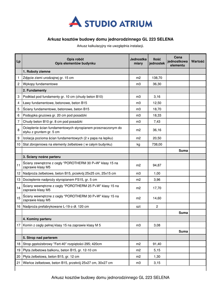 Arkusz kosztów budowy domu jednorodzinnego GL 223 SELENA Arkusz kalkulacyjny nie uwzględnia instalacji. Opis robót Opis elementów budynku Lp Cena Jednostka Ilość jednostkowa miary jednostek elementu 1. Roboty ziemne 1 Zdjęcie ziemi urodzajnej gr. 15 cm m2 138,70 2 Wykopy fundamentowe m3 36,30 2. Fundamenty 3 Podkład pod fundamenty gr. 10 cm (chudy beton B10) m3 3,16 4 Ławy fundamentowe, betonowe, beton B15 m3 12,50 5 Ściany fundamentowe, betonowe, beton B15 m3 18,70 6 Podsypka gruzowa gr. 20 cm pod posadzki m3 18,33 7 Chudy beton B10 gr. 8 cm pod posadzki m3 7,43 8 Ocieplenie ścian fundamentowych styropianem przeznaczonym do styku z gruntem gr. 5 cm m2 36,16 9 Izolacja pozioma ścian fundamentowych (2 x papa na lepiku) m2 20,50 10 Stal zbrojeniowa na elementy żelbetowe ( w całym budynku) kg 738,00 Suma 3. Ściany nośne parteru 11 Ściany zewnętrzne z cegły "POROTHERM 30 P+W" klasy 15 na zaprawie klasy M5 m2 94,87 12 Nadproża żelbetowe, beton B15, przekrój 25x25 cm, 25x15 cm m3 1,00 13 Docieplenie nadproży styropianem FS15, gr. 5 cm m2 3,96 14 Ściany wewnętrzne z cegły "POROTHERM 25 P+W" klasy 15 na zaprawie klasy M5 m2 17,70 15 Ściany wewnętrzne z cegły "POROTHERM 30 P+W" klasy 15 na zaprawie klasy M5 m2 14,60 szt 2 16 Nadproża prefabrykowane L-19 o dł. 120 cm Suma 4. Kominy parteru 17 Komin z cegły pełnej klasy 15 na zaprawie klasy M 5 m3 3,08 Suma 5. Strop nad parterem 18 Strop gęstożebrowy "Fert-40" rozpiętości 295; 420cm m2 91,40 19 Płyta żelbetowa balkonu, beton B15, gr. 12-10 cm m2 5,15 20 Płyta żelbetowa, beton B15, gr. 12 cm m2 1,30 21 Wieńce żelbetowe, beton B15, przekrój 25x27 cm, 30x27 cm m3 3,15 Arkusz kosztów budowy domu jednorodzinnego GL 223 SELENA Wartość 22 Docieplenie wieńców styropianem FS15, gr. 5 cm m2 8,52 23 Belki żelbetowe, beton B15, przekrój 25x40 cm m3 0,40 24 Schody płytowe, żelbetowe, beton B15, gr. 12 cm m2 4,95 Suma 6. Ściany nośne poddasza 25 Ściany zewnętrzne z cegły "POROTHERM 30 P+W" klasy 15 na zaprawie klasy M5 m2 44,80 26 Nadproża żelbetowe, beton B15, przekrój 25x25 cm m3 0,30 27 Docieplenie nadproży styropianem FS15, gr. 5 cm m2 1,18 28 Wieńce opaskowe żelbetowe, beton B15, przekrój 25x25, 25x15 cm m3 1,67 29 Docieplenie wieńców styropianem FS15, gr. 5 cm m2 6,71 30 Słupki kotwiące żelbetowe, beton B15, przekrój 25x25 cm m3 0,38 31 Docieplenie słupków kotwiących styropianem FS15, gr. 5 cm m2 1,50 Suma 7. Kominy poddasza 32 Komin z cegły pełnej klasy 15 na zaprawie klasy M5 33 Komin z cegły klinkierowej klasy 15 na zaprawie klasy M5 ( nad dachem) 34 Nakrywy betonowe kominów, beton B15 m3 3,73 m3 1,03 m3 0,12 Suma 8. Więźba 35 Drewno konstrukcyjne więźby klasy C30 m3 10,00 36 Konstrukcja dachu ( w rozwinięciu) m2 214,00 Suma 9. Dach 37 Krycie dachówką m2 214,00 38 Folia wiatroizolacyjna m2 214,00 39 Rynny f 100 mb 36,00 40 Rury spustowe f 70 mb 19,30 41 Wyłaz dachowy o wymiarach min. 80 x 80 cm szt 1 42 Okna połaciowe o wymiarach ościeżnicy 78x140 cm szt 3 43 Podbitka drewniana, heblowana gr. 2 cm m2 55,56 44 Podłoga z desek na jętkach gr. 3 cm m2 36,60 Suma 10. Ściany działowe parteru 45 Ściana gr. 12 cm z cegły pełnej klasy 10 na zaprawie klasy M2 m2 30,95 46 Nadproża prefabrykowane L-19 o dł. 120 cm szt 4 Suma 11. Podłoga na parterze 47 Izolacja pozioma przeciwwilgociowa (2 x papa na lepiku) m2 91,63 48 Wełna mineralna PAROC VL , gr. 10 cm m2 91,62 Arkusz kosztów budowy domu jednorodzinnego GL 223 SELENA 49 Wylewka betonowa, beton B15, gr. 6, 5 cm, zatarta na gładko m3 5,96 Suma 12. Ścianki lukarny 50 Płyta gipsowo-włóknowa FERMACELL gr. 1, 0 cm m2 9,40 51 Wełna mineralna gr. 12 cm m2 9,40 52 Płyta gipsowo-włóknowa FERMACELL gr. 2, 0 cm m2 9,40 53 Styropian FS 15 gr. 2 cm m2 9,40 Suma 13. Ściany działowe poddasza 54 Ściana gr. 12 cm z cegły dziurawki klasy 5 na zaprawie klasy M2 m2 51,55 55 Nadproża prefabrykowane L-19 o dł. 120 cm szt 4 Suma 14. Podłoga na poddaszu 56 Styropian FS 20 gr. 3 cm m2 70,32 57 Wylewka betonowa, beton B15, gr. 3, 5 cm, zatarta na gładko m3 2,47 Suma 15. Roboty wykończeniowe Tynki 58 Tynk cementowo-wapienny na ścianach od wewnątrz m2 391,14 59 Tynk cementowo-wapienny na sufitach m2 72,92 m2 176,30 61 Ocieplenie cokołu styropianem gr. 5, 0cm m2 10,51 62 Oboknia z wełny mineralnej "PAROC RAL 4", gr. 5cm m2 2,45 63 Wełna mineralna "PAROC IL" gr. 12 cm m2 119,27 64 Wełna mineralna "PAROC IL" gr. 5 cm m2 104,88 m2 104,88 66 Posadzka z płytek gresowych m2 45,00 67 Posadzka z paneli podłogowych m2 118,25 68 Trepy dębowe na schodach m2 4,25 69 Styropian FS 15 gr. 2 cm m2 4,56 70 Izolacja pozioma przeciwwilgociowa (2 x papa na lepiku) m2 5,20 71 Styropian FS 20 gr. 3 cm m2 4,95 72 Wylewka betonowa, beton B15, gr. 4 cm, zatarta na gładko m3 0,17 73 Posadzka z płytek gresowych m2 5,60 Docieplenie ścian zewnętrznych 60 Ocieplenie ścian zewnętrznych wełną mineralną "PAROC RAL 4", gr. 10 cm Sufit podwieszany + skosy poddasza 65 Płyta gipsowo-włóknowa FERMACELL na ruszcie stalowym gr. 1, 0 cm Posadzki Balkon Balustrady Arkusz kosztów budowy domu jednorodzinnego GL 223 SELENA 74 Balustrada na schodach wysokości 90 cm mb 5,80 75 Balustrada na balkonie wysokości 100 cm mb 6,20 Suma 16. Okna i drzwi 76 Okna o wymiarach ościeżnicy 56, 5x53, 5 cm szt 4 77 Okna o wymiarach ościeżnicy 116, 5x143, 5 cm szt 5 78 Okna o wymiarach ościeżnicy 236, 5x173, 5 cm szt 1 79 Drzwi wewnętrzne pokojowe o wymiarach ościeżnicy 88x205 cm szt 4 80 Drzwi wewnętrzne pokojowe o wymiarach ościeżnicy 98x205 cm szt 1 81 Drzwi wewnętrzne łazienkowe o wymiarach ościeżnicy 88x205 cm szt 2 82 Drzwi wewnętrzne łazienkowe o wymiarach ościeżnicy 78x205 cm szt 1 83 Drzwi wewnętrzne pełne o wymiarach ościeżnicy 78x205 cm szt 1 84 Drzwi zewnętrzne o wymiarach ościeżnicy 96, 5x234 cm szt 1 85 Drzwi balkonowe o wymiarach ościeżnicy 96, 5x219 cm szt 2 86 Drzwi balkonowe o wymiarach ościeżnicy 96, 5x234 cm szt 1 