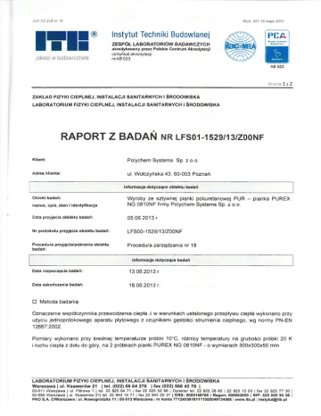Z3A PZ ZLB nr 19 Wyd. Vl/1 15 maja 2012 Instytut Techniki Budowlanej ZESPÓŁ LABORATORIÓW BADAWCZYCH . . Cs PCA , ih łft - w r r r - P olskie C entrum A khso ytac ji akredytowany przez Polskie Centrum Akredytacji certyfikat akredytacji jakosc w budownictwie x \ .0 ,y'-/Q\>'v nr a b 023 BADANIA AB 023 Strona 1 z 2 ZAKŁAD FIZYKI CIEPLNEJ, INSTALACJI SANITARNYCH I ŚRODOW ISKA LABORATORIUM FIZYKI CIEPLNEJ, INSTALACJI SANITARNYCH I ŚRODOW ISKA RAPORT Z BADAŃ NR LFS01-1529/13/Z00NF Klient: Polychem Systems Sp. z o.o. Adres klienta ul. W ołczyńska 43, 60-003 Poznań inform acje dotyczące obiektu badań nazwa, opis, stan i identyfikacja W yroby ze sztywnej pianki poliuretanowej PUR - pianka PUREX NG 081ONF firmy Polychem Systems Sp. z 0.0. Data przyjęcia obiektu badań: 05.06.2013 r Nr protokołu przyjęcia obiektu badań: LFS00-1529/13/Z00NF Procedura przyjęcia/pobrania obiektu badań: Procedura zarządzania nr 18 O biekt badań: Inform acje dotyczące badań Data rozpoczęcia badań: 13.06.2013 r. Data zakończenia badań: 18.06.2013 r. □ Metoda badania Oznaczenie współczynnika przewodzenia ciepła A w warunkach ustalonego przepływu ciepła wykonano przy użyciu jednopróbkowego aparatu płytowego z czujnikami gęstości strumienia cieplnego, wg normy PN-EN 12667:2002. Pomiary wykonano przy średniej temperaturze próbki 10°C, różnicy temperatury na grubości próbki 20 K i ruchu ciepła z dołu do góry, na 2 próbkach pianki PUREX NG 0810NF - o wymiarach 300x300x50 mm. LABORATORIUM FIZYKI CIEPLNEJ, INSTALACJI SANITARNYCH I ŚRODOW ISKA W arszawa | ul. Ksawerów 21 | tel. (022) 56 64 276 | fax (022) 566 42 76 | 00-611 Warszawa | ul. Filtrowa 1 | tel. 22 825 04 71 | fax 22 825 52 86 | Dyrektor tel. 22 825 28 85 | 22 825 13 03 | fax 22 825 77 30 | 02-656 Warszawa | ul. Ksawerów 21 1 tel. 22 843 14 71 | fax 22 843 29 31 ] KRS: 0000158785 | Regon: 000063650 | NIP: 525 000 93 5 8 j PKO S.A. O/Warszawa | ul. Nowogrodzka 11 | 00-513 Warszawa | nr konta 77124059181111000049134568 | www.itb.pl | [email protected] LABORATORIUM LFS RAPO RT Z BADAŃ NR LFS01-1529/13/Z00NF Strona 2 z 2 □ Wyniki badań Wyniki badania współczynnika przewodzenia ciepła próbek pianki PUR firmy Polychem Systems Sp. z o.o. przedstawiono w tablicy 1. Tablica 1. Nr/symbol próbki Data produkcji i szarża Współczynnik przewodzenia ciepła W/(m K) 31.05.2013 1/NG 810/LFS00-1529/13/Z00NF 0,0398 szarża 331E 03.06.2013 2/NG 810/LFS00-1529/13/Z00NF Niepewność, na poziomie 0,0398 szarża 303F ufności 95%, badania współczynnika przewodzenia ciepła według Karty niepewności LF-2/08 wynosi 3%. Odpowiedzialny za badanie Osoba autoryzująca raport Dr Barbara Pietruszka dr inż. Robert Geryło ( - I) i/ // ~ v S ' / /. Ho Podpis Podpis Warszawa, dnia 02.07.2013 r. Laboratorium Badaw cze oświadcza, że w yniki badania odnoszą się w yłącznie do badanego obiektu. Bez p isem nej zgody Laboratorium Badawczego Raport nie m oże być pow ielan y inaczej, ja k tylko w całości. R apo rt z badań nie je s t dokum entem dopuszczającym do obrotu i pow szechnego stosow ania w budownictwie. IW Instytut Techniki Budowlanej 0 0 - 6 1 1 WA R S Z A WA | ul . F I L T ROWA 1 | t e l . : ( 48 22) 8 2 5 04 71, ( 48 22) 8 2 5 76 55 | f a x : ( 48 22) 8 2 5 52 86 Członek Europejskiej Unii A k c e p t a c j i Członek Europejskiej Organizacji Technicznej ds. A p r o b a t w Budow nictwie Technicznych - - UEAtc EOTA Seria: APROBATY TECHNICZNE APROBATA TECHNICZNA ITB AT-15-9028/2012 Na podstawie rozporządzenia Ministra Infrastruktury z dnia 8 listopada 2004 r. w sprawie aprobat technicznych oraz jednostek organizacyjnych upoważnionych do ich wydawania (Dz. U. Nr 249, poz. 2497), w wyniku postępowania aprobacyjnego dokonanego w Instytucie Techniki Budowlanej w Warszawie na wniosek firmy: Polychem System Sp. z o.o. ul. Wołczyńska 43 60-003 Poznań stwierdza się przydatność do stosowania w budownictwie wyrobów pod nazwą: Natryskowa pianka poliuretanowa PUREX NG-0810NF w zakresie i na zasadach określonych w Załączniku, który jest integralną częścią niniejszej Aprobaty Technicznej ITB. DYREKTOR Instytutu Techniki Budowlanej Termin ważności : xx listopada 2017 r. Jan Bobrowicz Załącznik: Postanowienia ogólne i techniczne Warszawa, xx listopada 2012 r. Dokument Aprobaty Technicznej ITB AT-15-9028/2012 zawiera 11 stron. Tekst tego dokumentu można kopiować tylko w całości. Publikowanie lub upowszechnianie w każdej innej formie fragmentów tekstu Aprobaty Technicznej wymaga pisemnego uzgodnienia z Instytutem Techniki Budowlanej. 1 1 11® 1 u u AT-15-9028/2012 2/11 Z AŁ ĄCZ NIK POSTANOWIENIA OGÓLNE I TECHNICZNE SPIS TREŚCI 1. PRZEDMIOT APROBATY...........................................................................................................3 2. PRZEZNACZENIE, ZAKRES I WARUNKI STOSOWANIA......................................................3 3. WŁAŚCIWOŚCI TECHNICZNE. WYMAGANIA....................................................................... 4 3.1. Surowce............................................................................................................................... 4 3.2. Właściwości techniczne ...................................................................................................... 4 4. PAKOWANIE, PRZECHOWYWANIE i TRANSPORT............................................................. 5 5. OCENA ZGODNOŚCI.................................................................................................................6 5.1. Zasady ogólne..................................................................................................................... 6 5.2. Wstępne badanie typu........................................................................................................ 7 5.3. Zakładowa kontrola produkcji.............................................................................................7 5.4. Badania gotowych wyrobów..............