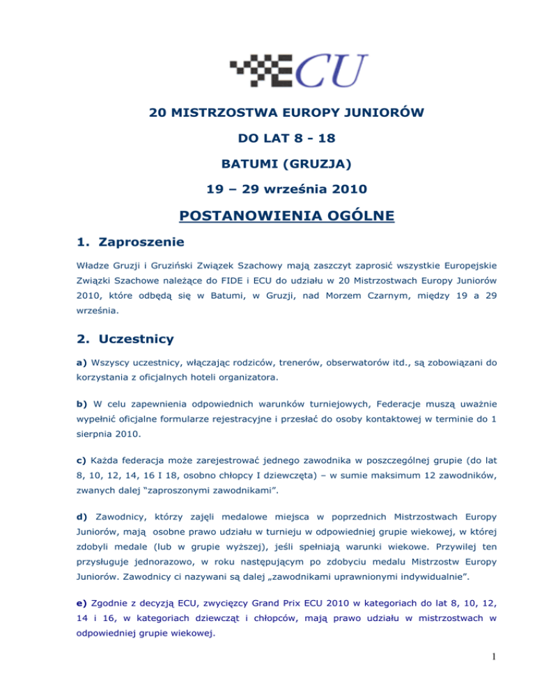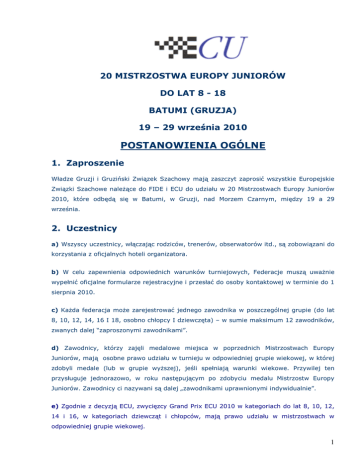 20 MISTRZOSTWA EUROPY JUNIORÓW DO LAT 8 - 18 BATUMI (GRUZJA) 19 – 29 września 2010 POSTANOWIENIA OGÓLNE 1. Zaproszenie Władze Gruzji i Gruziński Związek Szachowy mają zaszczyt zaprosić wszystkie Europejskie Związki Szachowe naleŜące do FIDE i ECU do udziału w 20 Mistrzostwach Europy Juniorów 2010, które odbędą się w Batumi, w Gruzji, nad Morzem Czarnym, między 19 a 29 września. 2. Uczestnicy a) Wszyscy uczestnicy, włączając rodziców, trenerów, obserwatorów itd., są zobowiązani do korzystania z oficjalnych hoteli organizatora. b) W celu zapewnienia odpowiednich warunków turniejowych, Federacje muszą uwaŜnie wypełnić oficjalne formularze rejestracyjne i przesłać do osoby kontaktowej w terminie do 1 sierpnia 2010. c) KaŜda federacja moŜe zarejestrować jednego zawodnika w poszczególnej grupie (do lat 8, 10, 12, 14, 16 I 18, osobno chłopcy I dziewczęta) – w sumie maksimum 12 zawodników, zwanych dalej “zaproszonymi zawodnikami”. d) Zawodnicy, którzy zajęli medalowe miejsca w poprzednich Mistrzostwach Europy Juniorów, mają osobne prawo udziału w turnieju w odpowiedniej grupie wiekowej, w której zdobyli medale (lub w grupie wyŜszej), jeśli spełniają warunki wiekowe. Przywilej ten przysługuje jednorazowo, w roku następującym po zdobyciu medalu Mistrzostw Europy Juniorów. Zawodnicy ci nazywani są dalej „zawodnikami uprawnionymi indywidualnie”. e) Zgodnie z decyzją ECU, zwycięzcy Grand Prix ECU 2010 w kategoriach do lat 8, 10, 12, 14 i 16, w kategoriach dziewcząt i chłopców, mają prawo udziału w mistrzostwach w odpowiedniej grupie wiekowej. 1 f) KaŜda federacja ma ponadto prawo zarejestrować dodatkowych zawodników. 3. Opłaty ECU Zgodnie z regulacjami ECU, kaŜdego zawodnika z grupy „zaproszonych” lub „uprawnionych indywidualnie” obowiązuje wpisowe w wysokości 65 €. KaŜdego zawodnika dodatkowego obowiązuje opłata w wysokości 130 €. WyŜej wymienione kwoty naleŜy wpłacić do ECU przed rozpoczęciem turnieju. 4. Rejestracja a) Termin zgłoszeń upływa 1 sierpnia 2010. Po tym terminie obowiązuje dodatkowa opłata w wysokości 100 €. b) KaŜdy zawodnik i kaŜda osoba towarzysząca (kierownik ekipy, trener, rodzic, dziennikarz) musi wnieść opłatę rejestracyjną w wysokości 100 Euro w momencie rejestracji przed terminem zgłoszeń (1 sierpnia 2010). c) Wymieniona powyŜej kwota 100 Euro jest bezzwrotna i musi zostać wpłacona na rachunek bankowy podany niŜej przed 1 sierpnia 2010. (Event Consulting Company jest oficjalną firmą konsultingową, zajmującą się organizacją, promocją i zarządzaniem - http://www.event-consulting.gr). Rachunek bankowy: BANK: EFG EUROBANK ERGASIAS S.A SWIFT/BIC : EFGBGRAA. IBAN: GR2802601380000970200241704 KOD BANKU: 026 NR ROZLICZENIOWY BANKU: 0138 NUMER RACHUNKU: 0026.0138.97.0200241704 ADRES BANKU: UL. SALAMINOS, THESSALONIKI, GRECJA WŁAŚCICIEL RACHUNKU: THEODOROS TSORBATZOGLOU Koszty wszelkich prowizji bankowych ponosi wpłacający. d) W pierwszej rundzie skojarzeni będą tylko zawodnicy, którzy przybędą do Batumi dzień przed pierwszą rundą. Wszelkie wyjątki muszą być potwierdzone przez organizatorów i sędziego głównego. Jeśli jakakolwiek płatność na rzecz organizatorów nie zostanie uiszczona do drugiej rundy, zawodnicy nie będą mogli kontynuować rozgrywek. 2 5. PodróŜ i wizy a) Koszt transferu z lotniska w Batumi do hoteli w dniu 19 września i z hoteli na lotnisko w dniu 29 września: 30 € b) Koszt transferu z lotniska w Tbilisi do hoteli (ok. 350 km, podróŜ trwa ok. 4 -4.30 godz.) w dniu 19 września i z hoteli na lotnisko w Tbilisi w dniu 29 września: 80 €. c) Koszt transferu z lotniska w Trabzon (przekroczenie granicy turecko-gruzińskiej bez opóźnienia) w dniu 19 września (ok. 180 km – podróŜ autostradą trwa ok. 1.30 godz.) i z hoteli na lotnisko w Trabzon w dniu 29 września: 80 €. d) Jeśli ekipy będą chciały przyjechać dwa dni przed zawodami, organizator postara się zapewnić transport z lotnisk w Tbilisi, Trabzon lub Batumi w tych samych cenach. e) Obywatele Unii Europejskiej, Turcji, Izraela, krajów dawnego ZSRR i większości krajów europejskich nie potrzebują gruzińskich wiz. Otrzymają zwolnioną z opłat pieczęć na lotnisku w Batumi lub Tbilisi. Mieszkańcy Rosji, Serbii, Macedonii i Bośni otrzymają bez problemu wizy na lotnisku w Tbilisi lub Batumi. Koszt wiz wynosi ok. 23 Euro. f) Rezerwacji i płatności naleŜy dokonać do 1 sierpnia 2010. 7. Zakwaterowanie i wyŜywienie a) Wszyscy uczestnicy, włączając kierowników ekip, rodziców i trenerów są zobowiązani do zakwaterowania w oficjalnych hotelach organizatora. b) Rezerwacji i płatności naleŜy do 1 sierpnia 2010. C) Bezpłatne zakwaterowanie i wyŜywienie otrzymują „zawodnicy zaproszeni”, „zawodnicy uprawnieni indywidualnie” i kierownicy delegacji. d) Wszelkie opłaty hotelowe są wnoszone wyłącznie w Euro. e) Płatności z góry za osoby towarzyszące i dodatkowych zawodników muszą zostać wniesione na rachunek bankowy podany w punkcie 9. f) Koszt hotel z wyŜywieniem (śniadanie, obiad i kolacja z duŜą ilością gruzińskich owoców) dla osób towarzyszących i dodatkowych zawodników wynosi za osobodzień: 3 Hotele trzygwiazdkowe *** Hotele czterogwiazdkowe *** Pokój 3-os. 37 EURO Pokój 2-os. 43 EURO Pokój 1-os. 58 EURO Pokój 3-os. 41 EURO Pokój 2-os. 50 EURO Pokój 1-os. 68 EURO g) Liczba pokoi trzyosobowych i jednoosobowych w hotelach *** oraz **** jest ograniczona. Aby otrzymać pokoje jedno- i trzyosobowe, naleŜy się jak najwcześniej zgłosić. 8. Sala gry Sala gry mieści się w „Szachowym pałacu”. Sala gry połoŜona jest w odległości 5-15 minut autobusem. Organizator zapewnia darmowe autobusy z hoteli do sali gry przed kaŜdą rundą o godz. 14.00. Powrotne autobusy będą kursowały co 20-30 minut, począwszy od godz. 17.00. 9. Rachunek bankowy do opłat za zakwaterowanie i transport Rach
