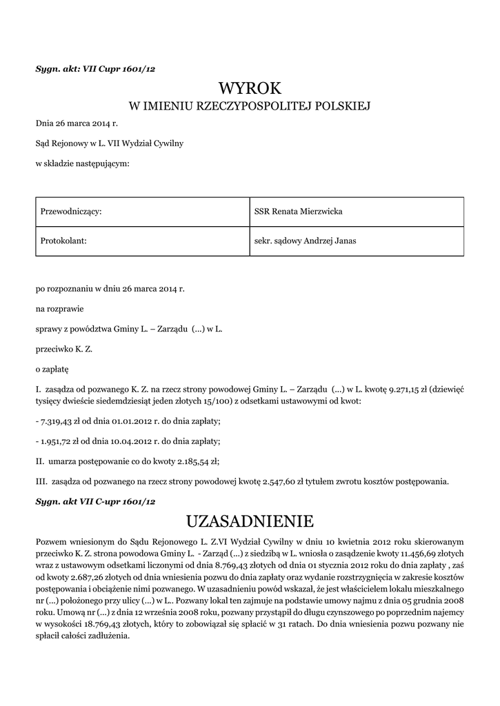 Sygn. akt: VII Cupr 1601/12 WYROK W IMIENIU RZECZYPOSPOLITEJ POLSKIEJ Dnia 26 marca 2014 r. Sąd Rejonowy w L. VII Wydział Cywilny w składzie następującym: Przewodniczący: SSR Renata Mierzwicka Protokolant: sekr. sądowy Andrzej Janas po rozpoznaniu w dniu 26 marca 2014 r. na rozprawie sprawy z powództwa Gminy L. – Zarządu (...) w L. przeciwko K. Z. o zapłatę I. zasądza od pozwanego K. Z. na rzecz strony powodowej Gminy L. – Zarządu (...) w L. kwotę 9.271,15 zł (dziewięć tysięcy dwieście siedemdziesiąt jeden złotych 15/100) z odsetkami ustawowymi od kwot: - 7.319,43 zł od dnia 01.01.2012 r. do dnia zapłaty; - 1.951,72 zł od dnia 10.04.2012 r. do dnia zapłaty; II. umarza postępowanie co do kwoty 2.185,54 zł; III. zasądza od pozwanego na rzecz strony powodowej kwotę 2.547,60 zł tytułem zwrotu kosztów postępowania. Sygn. akt VII C-upr 1601/12 UZASADNIENIE Pozwem wniesionym do Sądu Rejonowego L. Z.VI Wydział Cywilny w dniu 10 kwietnia 2012 roku skierowanym przeciwko K. Z. strona powodowa Gminy L. - Zarząd (...) z siedzibą w L. wniosła o zasądzenie kwoty 11.456,69 złotych wraz z ustawowym odsetkami liczonymi od dnia 8.769,43 złotych od dnia 01 stycznia 2012 roku do dnia zapłaty , zaś od kwoty 2.687,26 złotych od dnia wniesienia pozwu do dnia zapłaty oraz wydanie rozstrzygnięcia w zakresie kosztów postępowania i obciążenie nimi pozwanego. W uzasadnieniu powód wskazał, że jest właścicielem lokalu mieszkalnego nr (...) położonego przy ulicy (...) w L.. Pozwany lokal ten zajmuje na podstawie umowy najmu z dnia 05 grudnia 2008 roku. Umową nr (...) z dnia 12 września 2008 roku, pozwany przystąpił do długu czynszowego po poprzednim najemcy w wysokości 18.769,43 złotych, który to zobowiązał się spłacić w 31 ratach. Do dnia wniesienia pozwu pozwany nie spłacił całości zadłużenia. Nakazem zapłaty wydanym w elektronicznym postępowaniu upominawczym przez Sąd Rejonowy L. Z.VI Wydział Cywilny w dniu 18 maja 212 roku w sprawie o sygn. akt VI Nc-e579250/12 Sąd ten orzekł zgodnie z żądaniem pozwu. W sprzeciwie od wydanego nakazu zapłaty pozwany wniósł o oddalenie powództwa w całości wskazując m.in. że zwarta w dniu 12 września 2008 roku umowa została zawarta przez niego pod przymusem. Pozwany wskazał nadto, że nie wie na jakiej podstawie zostało ustalone zadłużenie mieszkania skoro miesięczny czynsz wynosi około 90 złotych. W toku postępowania pozwany wnosił o zawieszenie postępowania z uwagi na to, że wniósł pozew o uchylenie się od skutków prawnych przystąpienia do długu czynszowego. W toku postępowania pismem z dnia 18 marca 2013 roku strona powodowa ograniczyła żądanie pozwu o kwotę 1450 złotych z tytułu należności głównej oraz o kwotę 735,54 złotych. W następstwie tego pisma żądanie powoda to zasadzenie od pozwanego kwoty 9.271,15 złotych wraz z odsetkami ustawowymi od kwot: a) 7.319,43 złote od dnia 01 stycznia 2012 roku do dnia zapłaty, b) 1.951,72 złotych od dnia wniesienia pozwu do dnia zapłaty. Ograniczenie powództwa wynika z błędnie zaksięgowanym przez powoda zadłużeniem pozwanego z tytułu umowy nr (...) z dnia 12 września 2008 roku. Sąd ustalił następujący stan faktyczny: W dniu 12 września 208 roku pomiędzy Gminą L. Zarządem (...) a pozwanym K. Z. została zawarta umowa o wykonanie remontu lokalu mieszkalnego we własnym zakresie i na własny koszt. Na jej podstawie K. Z. przyjął do wykonania na własny koszt i we własnym zakresie remont mieszkania nr (...), położonego w L. przy ulicy(...), zgodnie z załączonym do tej umowy zakresem robót stanowiącym załącznik nr 1 do umowy. Strony umowy ustaliły następujące terminy wykonania prac: termin rozpoczęcia prac- 12 września 2008 roku, termin zakończenia remontu 09 stycznia 2009 roku. Nadto strony ustaliły, że po odbiorze technicznym mieszkania nastąpi zawarcie umowy najmu pomiędzy w/w. Według załączonego do umowy załącznika nr 1 koszt pracy do wykonania przez pozwanego ustalono na kwotę 14.729,06 złotych. W dniu 02 grudnia 2008 roku dokonano odbioru wykonanych przez pozwanego prac, zaś w dniu 05 grudnia 2008 roku pomiędzy pozwanym a powodem została zawarta umowa najmu w/w lokalu mieszkalnego. Równolegle w dniu 12 września 20o8 roku pomiędzy Gminą L. Zarządem (...) a pozwanym K. Z. została zawarta umowa o przystąpienie do długu. Na jej podstawie pozwany zobowiązał się do spłaty na rzecz powoda zadłużenia byłego najemcy tego lokalu , które na dzień 12 września 2008 roku wyniosło 18.769,43 złotych. Spłata tego zadłużenia miała nastąpić, według ustaleń stron umowy, w sposób ratalny, t.j. I rata w wysokości 10.000 złotych płatna do dnia 12 września 2008 roku, zaś kolejne 29 rat płatnych w wysokości po 290 złotych płatne do 10 każdego miesiąca począwszy od października 2008 roku, zaś ostatnia rata w wysokości 359,43 złotych płatna do dnia 10 lutego 2011 roku. O wysokości zadłużenia pozwany wiedział podpisując w/w. Z pozwanym indywidualnie też konsultowano termin spłaty długu. W wykonaniu tej umowy pozwany uiścił łącznie 10.870 złotych w dniach: 12 września 2008 roku- 10.000 złotych, w dniu 09 października 2008 roku- 290 złotych, w dniu 12 listopada 2008 roku- 290 złotych, w dniu 08 grudnia 2008 roku- 290 złotych. Dowód: - pismo z dnia 15 czerwca 207 roku, - pismo z dnia 02 marca 2007 roku, - potwierdzenia zapłaty Nr (...), Nr (...), Nr (...), Nr (...), -k.6, - umowa o przystąpieniu do długu czynszowego- k. 36, - protokół odbioru z dnia 02 grudnia 2008 roku wraz z załącznikami -k. 8v- 11, - umowa o wykonanie remontu lokalu mieszkalnego we własnym zakresie i na własny koszt , zawarta w dniu 12 września 2008 roku- k. 12-12v, - potwierdzenie salda na dzień 31 grudnia 2011 roku- k. 34, - wezwanie do zapłaty z dnia 03 lutego 2012 roku- k. 35, - oświadczenia pozwanego z dnia 10 września 2008 roku- k. 55, - u