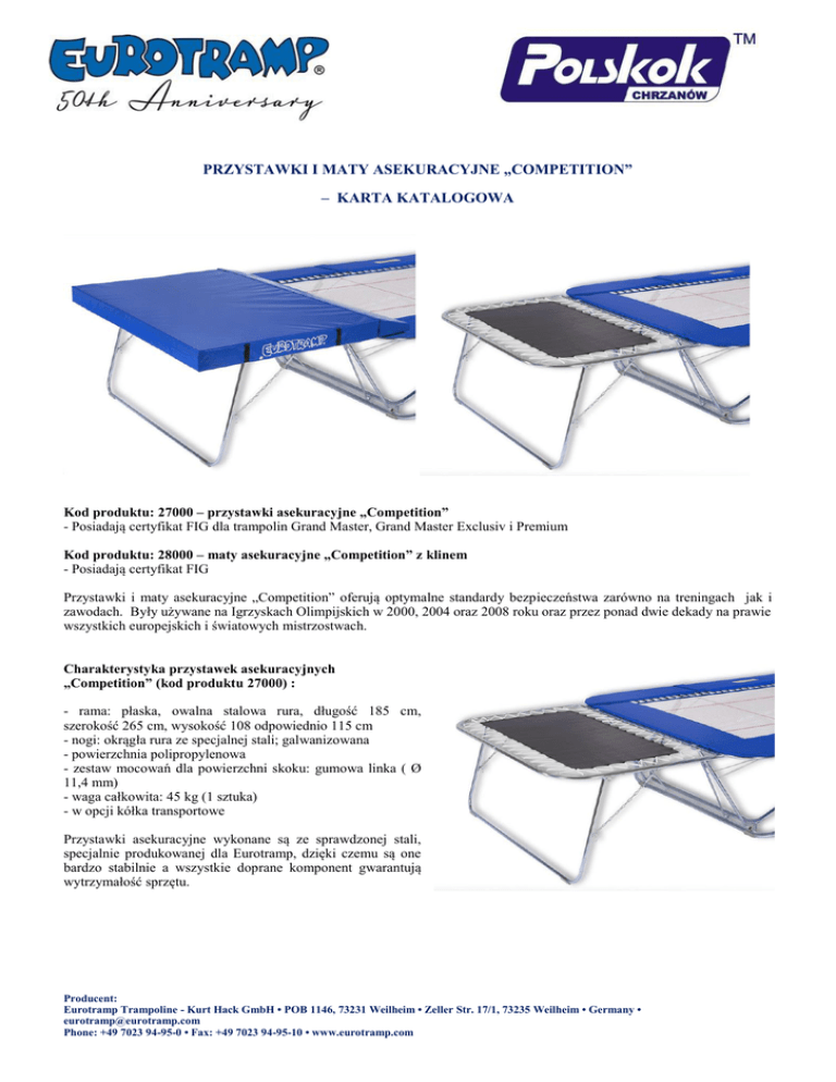 PRZYSTAWKI I MATY ASEKURACYJNE „COMPETITION” – KARTA KATALOGOWA Kod produktu: 27000 – przystawki asekuracyjne „Competition” - Posiadają certyfikat FIG dla trampolin Grand Master, Grand Master Exclusiv i Premium Kod produktu: 28000 – maty asekuracyjne „Competition” z klinem - Posiadają certyfikat FIG Przystawki i maty asekuracyjne „Competition” oferują optymalne standardy bezpieczeństwa zarówno na treningach jak i zawodach. Były używane na Igrzyskach Olimpijskich w 2000, 2004 oraz 2008 roku oraz przez ponad dwie dekady na prawie wszystkich europejskich i światowych mistrzostwach. Charakterystyka przystawek asekuracyjnych „Competition” (kod produktu 27000) : - rama: płaska, owalna stalowa rura, długość 185 cm, szerokość 265 cm, wysokość 108 odpowiednio 115 cm - nogi: okrągła rura ze specjalnej stali; galwanizowana - powierzchnia polipropylenowa - zestaw mocowań dla powierzchni skoku: gumowa linka ( Ø 11,4 mm) - waga całkowita: 45 kg (1 sztuka) - w opcji kółka transportowe Przystawki asekuracyjne wykonane są ze sprawdzonej stali, specjalnie produkowanej dla Eurotramp, dzięki czemu są one bardzo stabilnie a wszystkie doprane komponent gwarantują wytrzymałość sprzętu. Producent: Eurotramp Trampoline - Kurt Hack GmbH • POB 1146, 73231 Weilheim • Zeller Str. 17/1, 73235 Weilheim • Germany • [email protected] Phone: +49 7023 94-95-0 • Fax: +49 7023 94-95-10 • www.eurotramp.com Charakterystyka mat asekuracyjnych „Competition” z klinem (kod produktu 28000) : - mata asekuracyjna: 300 x 200 x 20 cm oraz klin 300x 40 x 20 cm (odłączany) wykonany z wysokiej jakości pianki PE z trwałego pokrycia PCV - waga całkowita: 42,5 kg (1 sztuka) Maty asekuracyjne wykonane są z najwyższej jakości pianki PE zapewniającą optymalną amortyzację a przy tym minimalizującą ryzyko odniesienia kontuzji. Pokryte są specjalnym materiałem PCV odpornym na rozdarcia. Kliny można w każdej chwili odłączyć i wykorzystać je w innym miejscu. W przypadku kiedy dwie trampoliny będą umieszczone blisko siebie, tylko jedna przystawka może być postawiona między nimi. Wówczas tylko jedna mata asekuracyjna będzie pełniła rolę bezpieczeństwa. Specyfikacja paczek: Rozmiar dla przystawek asekuracyjnych: 265 x 185 x 7 cm (1 sztuka) Rozmiar dla mat asekuracyjnych: 300 x 200 x 20 cm (1 sztuka) + klin 300 x 40 x 20 cm (6,5 kg) (1 sztuka) Producent: Eurotramp Trampoline - Kurt Hack GmbH • POB 1146, 73231 Weilheim • Zeller Str. 17/1, 73235 Weilheim • Germany • [email protected] Phone: +49 7023 94-95-0 • Fax: +49 7023 94-95-10 • www.eurotramp.com
