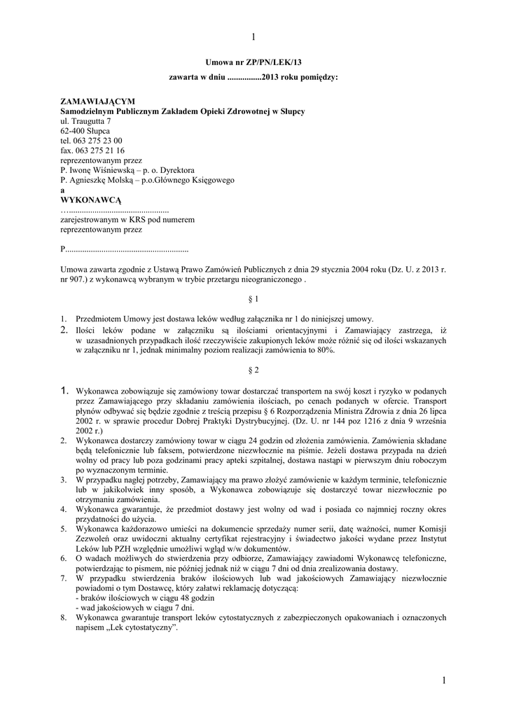 1 Umowa nr ZP/PN/LEK/13 zawarta w dniu ................2013 roku pomiędzy: ZAMAWIAJĄCYM Samodzielnym Publicznym Zakładem Opieki Zdrowotnej w Słupcy ul. Traugutta 7 62-400 Słupca tel. 063 275 23 00 fax. 063 275 21 16 reprezentowanym przez P. Iwonę Wiśniewską – p. o. Dyrektora P. Agnieszkę Molską – p.o.Głównego Księgowego a WYKONAWCĄ …............................................... zarejestrowanym w KRS pod numerem reprezentowanym przez P.......................................................... Umowa zawarta zgodnie z Ustawą Prawo Zamówień Publicznych z dnia 29 stycznia 2004 roku (Dz. U. z 2013 r. nr 907.) z wykonawcą wybranym w trybie przetargu nieograniczonego . §1 1. Przedmiotem Umowy jest dostawa leków według załącznika nr 1 do niniejszej umowy. 2. Ilości leków podane w załączniku są ilościami orientacyjnymi i Zamawiający zastrzega, iż w uzasadnionych przypadkach ilość rzeczywiście zakupionych leków może różnić się od ilości wskazanych w załączniku nr 1, jednak minimalny poziom realizacji zamówienia to 80%. §2 1. Wykonawca zobowiązuje się zamówiony towar dostarczać transportem na swój koszt i ryzyko w podanych 2. 3. 4. 5. 6. 7. 8. przez Zamawiającego przy składaniu zamówienia ilościach, po cenach podanych w ofercie. Transport płynów odbywać się będzie zgodnie z treścią przepisu § 6 Rozporządzenia Ministra Zdrowia z dnia 26 lipca 2002 r. w sprawie procedur Dobrej Praktyki Dystrybucyjnej. (Dz. U. nr 144 poz 1216 z dnia 9 września 2002 r.) Wykonawca dostarczy zamówiony towar w ciągu 24 godzin od złożenia zamówienia. Zamówienia składane będą telefonicznie lub faksem, potwierdzone niezwłocznie na piśmie. Jeżeli dostawa przypada na dzień wolny od pracy lub poza godzinami pracy apteki szpitalnej, dostawa nastąpi w pierwszym dniu roboczym po wyznaczonym terminie. W przypadku nagłej potrzeby, Zamawiający ma prawo złożyć zamówienie w każdym terminie, telefonicznie lub w jakikolwiek inny sposób, a Wykonawca zobowiązuje się dostarczyć towar niezwłocznie po otrzymaniu zamówienia. Wykonawca gwarantuje, że przedmiot dostawy jest wolny od wad i posiada co najmniej roczny okres przydatności do użycia. Wykonawca każdorazowo umieści na dokumencie sprzedaży numer serii, datę ważności, numer Komisji Zezwoleń oraz uwidoczni aktualny certyfikat rejestracyjny i świadectwo jakości wydane przez Instytut Leków lub PZH względnie umożliwi wgląd w/w dokumentów. O wadach możliwych do stwierdzenia przy odbiorze, Zamawiający zawiadomi Wykonawcę telefoniczne, potwierdzając to pismem, nie później jednak niż w ciągu 7 dni od dnia zrealizowania dostawy. W przypadku stwierdzenia braków ilościowych lub wad jakościowych Zamawiający niezwłocznie powiadomi o tym Dostawcę, który załatwi reklamację dotyczącą: - braków ilościowych w ciągu 48 godzin - wad jakościowych w ciągu 7 dni. Wykonawca gwarantuje transport leków cytostatycznych z zabezpieczonych opakowaniach i oznaczonych napisem „Lek cytostatyczny”. 1 2 §3 1. 2. 3. 4. 5. 6. Wartość przedmiotu umowy łącznie wynosi:.................. zł brutto (cena netto............. w tym VAT …...........) z uwzględnieniem postanowienia ust. 3 poniżej”. W cenach jednostkowych zawarte są wszystkie koszty, związane z dostawą przedmiotu umowy do siedziby Zamawiającego, według zasad przyjętych w niniejszej umowie. W przypadku ustawowych zmian: stawki VAT oraz cen urzędowych leków stanowiących przedmiot zamówienia, zmianie ulegną ceny brutto oferowanych leków, w stosunku do wskazanych załącznikami do niniejszej umowy, a zmiany te następować będą z dniem wejścia w życie przepisów regulujących te zmiany. W przypadku okresowych promocji cenowych leków, stosowanych przez producentów, strony uzgadniają, że w tym okresie dostawy towarów wyszczególnionych w załącznikach do umowy będą realizowane przez Wykonawcę w cenach niższych, uwzględniających promocję cenową. Ceny podane przez Wykonawcę nie mogą zostać podwyższone w czasie obowiązywania umowy, poza przypadkiem, gdy podwyższenie ceny spowodowane zostanie urzędową podwyżką stawki VAT na towary będące przedmiotem umowy. W przypadku obniżenia ceny leku przez producenta na skutek umieszczenia leku na liście leków refundowanych, wykonawca obniży cenę ofertową leku do wysokości ceny refundowanej. §4 1. 2. 3. 4. 5. Zamawiający zobowiązuje się do uregulowania należności Wykonawcy przelewem w terminie do 60 dni od daty otrzymania towaru wraz z prawidłowo wystawioną fakturą na konto nr ............................................................................................. Za datę uregulowania należności uważa się datę obciążenia konta Zamawiającego. W przypadku przekroczenia terminu płatności Zamawiający zastrzega sobie prawo negocjowania odroczenia terminu płatności i wysokości naliczonych odsetek. W razie nie uregulowania przez Zamawiającego płatności w wyznaczonym terminie umowy, Wykonawca ma prawo naliczyć odsetki ustawowe za każdy dzień zwłoki, po wyczerpaniu postępowania przewidzianego w pkt. 3 Wykonawca bez zgody Zamawiającego nie może dokonać przelewu wierzytelności wynikającej z niniejszej umowy na osoby trzecie. §5 1. 2. 3. Wykonawca jest zobowiązany do zapłaty kar umownych: a) za zwłokę w realizacji dostawy w wysokości 1% wartości niezrealizowanej części dostawy, za każdy dzień zwłoki, b) w przypadku rozwiązania umowy z winy Wykonawcy, zapłaci on Zamawiającemu karę umowną w wysokości 10% wartości zaproponowanej ceny ofertowej brutto za całość przedmiotu zamówienia, znajdującej się w załączniku nr 1 do niniejszej umowy, c) za zwłokę w dostawie przedmiotu dostawy wolnego od wad w wysokości 0,1% wartości towarów dostarczonych z wadami, za każdy dzień zwłoki liczony od dnia wyznaczonego do dostarczenia towarów wolnych od wad w miejsce wadliwych. Zamawiający kwotę