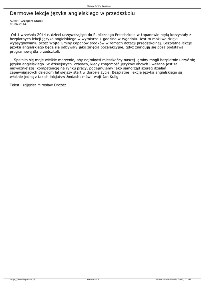 Strona Gminy Łapanów Darmowe lekcje języka angielskiego w przedszkolu Autor: Grzegorz Statek 05.06.2014. Od 1 września 2014 r. dzieci uczęszczające do Publicznego Przedszkola w Łapanowie będą korzystały z bezpłatnych lekcji języka angielskiego w wymiarze 1 godzina w tygodniu. Jest to możliwe dzięki wyasygnowaniu przez Wójta Gminy Łapanów środków w ramach dotacji przedszkolnej. Bezpłatne lekcje języka angielskiego będą się odbywały jako zajęcia pozalekcyjne, gdyż znajdują się poza podstawą programową dla przedszkoli. - Spełniło się moje wielkie marzenie, aby najmłodsi mieszkańcy naszej gminy mogli bezpłatnie uczyć się języka angielskiego. W dzisiejszych czasach, kiedy znajomość języków obcych uważana jest za najważniejszą kompetencję na rynku pracy, podejmujemy jako samorząd szereg działań zapewniających dzieciom łatwiejszy start w dorosłe życie. Bezpłatne lekcje języka angielskiego są właśnie jedną z takich inicjatyw – mówi wójt Jan Kulig. Tekst i zdjęcie: Mirosław Drożdż http://www.lapanow.pl Kreator PDF Utworzono 4 March, 2017, 07:49