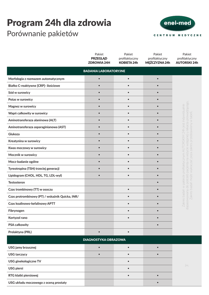 Program 24h dla zdrowia Porównanie pakietów Pakiet PRZEGLĄD ZDROWIA 24H Pakiet profilaktyczny KOBIETA 24h Pakiet profilaktyczny MĘŻCZYZNA 24h Pakiet profilaktyczny AUTORSKI 24h Morfologia z rozmazem automatycznym • • • Białko C-reaktywne [CRP]- ilościowe • • • Sód w surowicy • • • Potas w surowicy • • • Magnez w surowicy • • • Wapń całkowity w surowicy • • • Aminotransferaza alaninowa (ALT) • • • Aminotransferaza asparaginianowa (AST) • • • Glukoza • • • Kreatynina w surowicy • • • Kwas moczowy w surowicy • • • Mocznik w surowicy • • • Mocz-badanie ogólne • • • Tyreotropina (TSH) trzeciej generacji • • • Lipidogram (CHOL, HDL, TG, LDL-wyl) • • • • Testosteron Czas trombinowy (TT) w osoczu • • Czas protrombinowy (PT) / wskaźnik Quicka, INR/ • • Czas koalinowo-kefalinowy APTT • • Fibrynogen • • Kortyzol rano • • • PSA całkowity Prolaktyna (PRL) Zakres badań w pakiecie profilaktycznym AUTORSKIM 24h jest indywidualnie dopasowywany do potrzeb pacjenta na wizycie wstępnej u lekarza prowadzącego. Zakres badań może wykraczać poza zakres przedstawiony w tabeli. BADANIA LABORATORYJNE • • DIAGNOSTYKA OBRAZOWA USG jamy brzusznej • • • USG tarczycy • • • USG ginekologiczne TV • USG piersi • RTG klatki piersiowej • USG układu moczowego z oceną prostaty jw. • • Program 24h dla zdrowia Porównanie pakietów Pakiet PRZEGLĄD ZDROWIA 24H Pakiet profilaktyczny KOBIETA 24h Pakiet profilaktyczny MĘŻCZYZNA 24h Pakiet profilaktyczny AUTORSKI 24h DIAGNOSTYKA KARDIOLOGICZNA EKG spoczynkowe (badanie + opis) • • • USG Echo serca • • • jw. POZOSTAŁE BADANIA • Cytologia ginekologiczna jw. KONSULTACJE SPECJALISTYCZNE Konsultacja ginekologa • Konsultacja kardiologa • • Konsultacja okulisty • • jw. • Konsultacja urologa PODSUMOWANIE Wizyta podsumowująca u internisty prowadzącego (60 minut) • Indywidualna opieka Specjalisty ds. Programów Profilaktycznych • • • jw. • • Dostępność pakietów w oddziałch ENEL-MED MIASTO Katowice NAZWA ODDZIAŁU Chorzowska NOWOŚĆ Pakiet PRZEGLĄD ZDROWIA 24H Pakiet profilaktyczny KOBIETA 24h Pakiet profilaktyczny MĘŻCZYZNA 24h Pakiet profilaktyczny AUTORSKI 24h • • • • Wrocław Arkady Wrocławskie • • • • Kraków Galeria Krakowska • • • • Poznań Kupiec Poznański • • • • Gdańsk Grunwaldzka • • • • Łódź Manufaktura • • • • • • • Warszawa Warszawa Postępu NOWOŚĆ Zacisze •