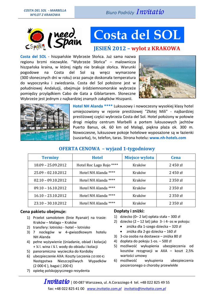COSTA DEL SOL - MARBELLA WYLOT Z KRAKOWA Biuro Podróży Invitatio .Costa del SOL. JESIEŃ 2012 – wylot z KRAKOWA Costa del SOL - hiszpańskie Wybrzeże Słońca. Już sama nazwa regionu brzmi niezwykle. ”Wybrzeże Słońca” – malownicza hiszpańska kraina, w której nigdy nie brakuje słońca. Warunki pogodowe na Costa del Sol są wręcz wymarzone (300 słonecznych dni w roku) oraz panuje doskonała temperatura do wypoczynku i zwiedzania. Costa del Sol położone jest w południowej Andaluzji, obejmuje śródziemnomorskie wybrzeże pomiędzy przylądkiem Cabo de Gata a Giblartarem. Słoneczne Wybrzeże jest jednym z najbardziej znanych zakątków Hiszpanii. Hotel NH Alanda **** Luksusowy i nowoczesny wysokiej klasy hotel umiejscowiony w rejonie prestiżowej "Złotej Mili" - najbardziej prestiżowej części wybrzeża Costa del Sol. Hotel położony w połowie drogi między centrum Marbelli a portem luksusowych jachtów Puerto Banus, ok. 60 km od Malagi, piękna plaża ok. 300 m. Nowoczesne, luksusowe pokoje hotelowe wyposażone są w łazienki (suszarka), tv, telefon, taras. Strona hotelu: www.nh-hotels.com OFERTA CENOWA – wyjazd 1-tygodniowy Terminy Hotel Miejsce wylotu Cena 18.09 – 25.09.2012 Hotel Roc Lago Rojo **** Kraków 2 450 zł 25.09 – 02.10.2012 Hotel NH Alanda **** Kraków 2 450 zł 02.10 – 09.10.2012 Hotel NH Alanda **** Kraków 2 350 zł 09.10 – 16.10.2012 Hotel NH Alanda **** Kraków 2 350 zł 16.10 – 23.10.2012 Hotel NH Alanda **** Kraków 2 350 zł 23.10 – 30.10.2012 Hotel NH Alanda **** Kraków 2 350 zł Cena pakietu obejmuje: 1) Przelot samolotem (linie Ryanair) na trasie: Kraków – Malaga – Kraków 2) transfery: lotnisko - hotel – lotnisko 3) 7 noclegów w 4–gwiazdkowym hotelu NH Alanda 4) pełne wyżywienie (śniadanie, obiad i kolacja) + ¼ l. wina i ¼ l. wody do obiadu i kolacji 5) panoramiczna wycieczka do Kordoby 6) ubezpieczenie AXA: Koszty Leczenia (10 000 €) Następstwa Nieszczęśliwych Wypadków (2 000 € ), bagaż ( 200 €) 7) opiekę polskojęzycznego rezydenta Dopłaty i zniżki: 1) dziecko (0– 2 lat) opłata stała – 300 zł 2) dziecko (2 – 12 lat) jako 3- i 4- os w pokoju: zniżka dla 1-szego dziecka – 320 zł zniżka dla 2-go dziecka – 160 zł 3) 3-cia osoba na dostawce – zniżka 80 zł 4) dopłata do pokoju 1-os. – 500 zł 5) możliwość wykupienia ubezpieczenia od kosztów rezygnacji w AXA – koszt 2,5% wartości umowy 6) możliwość wykupienia ubezpieczenia poszerzonego o choroby przewlekłe Invitatio | 00-087 Warszawa, ul. A.Corazziego 4 tel. +48 022 825 49 55 fax: +48 022 825 41 00 www.invitatio.com.pl [email protected]