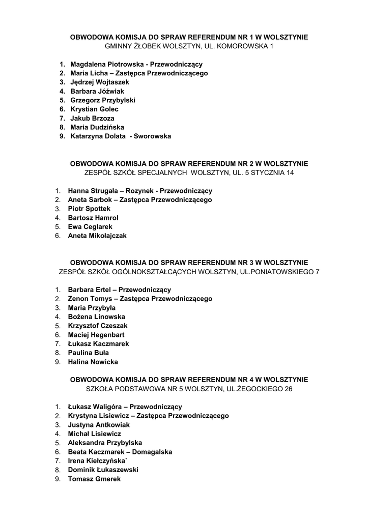 OBWODOWA KOMISJA DO SPRAW REFERENDUM NR 1 W WOLSZTYNIE GMINNY ŻŁOBEK WOLSZTYN, UL. KOMOROWSKA 1 1.1. 2.2. 3.3. 4.4. 5.5. 6.6. 7.7. 8.8. 9.9. Magdalena Piotrowska - Przewodniczący Maria Licha – Zastępca Przewodniczącego Jędrzej Wojtaszek Barbara Jóźwiak Grzegorz Przybylski Krystian Golec Jakub Brzoza Maria Dudzińska Katarzyna Dolata - Sworowska OBWODOWA KOMISJA DO SPRAW REFERENDUM NR 2 W WOLSZTYNIE ZESPÓŁ SZKÓŁ SPECJALNYCH WOLSZTYN, UL. 5 STYCZNIA 14 1. 2. 3. 4. 5. 6. Hanna Strugała – Rozynek - Przewodniczący Aneta Sarbok – Zastępca Przewodniczącego Piotr Spottek Bartosz Hamrol Ewa Ceglarek Aneta Mikołajczak OBWODOWA KOMISJA DO SPRAW REFERENDUM NR 3 W WOLSZTYNIE ZESPÓŁ SZKÓŁ OGÓLNOKSZTAŁCĄCYCH WOLSZTYN, UL.PONIATOWSKIEGO 7 1. 2. 3. 4. 5. 6. 7. 8. 9. Barbara Ertel – Przewodniczący Zenon Tomys – Zastępca Przewodniczącego Maria Przybyła Bożena Linowska Krzysztof Czeszak Maciej Hegenbart Łukasz Kaczmarek Paulina Buła Halina Nowicka OBWODOWA KOMISJA DO SPRAW REFERENDUM NR 4 W WOLSZTYNIE SZKOŁA PODSTAWOWA NR 5 WOLSZTYN, UL.ŻEGOCKIEGO 26 1. 2. 3. 4. 5. 6. 7. 8. 9. Łukasz Waligóra – Przewodniczący Krystyna Lisiewicz – Zastępca Przewodniczącego Justyna Antkowiak Michał Lisiewicz Aleksandra Przybylska Beata Kaczmarek – Domagalska Irena Kiełczyńska` Dominik Łukaszewski Tomasz Gmerek OBWODOWA KOMISJA DO SPRAW REFERENDUM NR 5 W WOLSZTYNIE PRZEDSZKOLE NR 3 WOLSZTYN, UL. KUSOCIŃSKIEGO 2 1. 2. 3. 4. 5. 6. 7. 8. 9. Natalia Ratajczak – Przewodniczący Marcin Kuskiewicz – Zastępca Przewodniczącego Daria Skrobisz Katarzyna Weiss Sandra Trafalska Anna Spottek Karol Rybicki Krystyna Kubaczyk – Gmiąt Marian Zaremba OBWODOWA KOMISJA DO SPRAW REFERENDUM NR 6 W WOLSZTYNIE ZESPÓŁ SZKÓŁ ZAWODOWYCH WOLSZTYN, UL. KUSOCIŃSKIEGO 1 1. 2. 3. 4. 5. 6. 7. 8. 9. Wiesława Sobisiak – Zając – Przewodniczący Karina Borowczak – Zastępca Przewodniczącego Justyna Wieczorek Joanna Florek Beata Willmann Jolanta Krupa Danuta Skrzypczak Dawid Mauer Joanna Pietrzak OBWODOWA KOMISJA DO SPRAW REFERENDUM NR 7 W WOLSZTYNIE SZKOŁA PODSTAWOWA NR 3 WOLSZTYN, UL. KONOPNICKIEJ 1 1. 2. 3. 4. 5. 6. 7. 8. 9. Hanna Świtała – Przewodniczący Aleksandra Kała – Zastępca Przewodniczącego Honorata Wota Tomasz Weiss Hanna Korecka Kamil Gessner Przemysław Podleśny Jolanta Dudziak Bronisława Ptak OBWODOWA KOMISJA DO SPRAW REFERENDUM NR 8 W WOLSZTYNIE GIMNAZJUM NR 1 WOLSZTYN, UL. WSCHOWSKA 15 1. 2. 3. Stanisława Kopacz – Rzepa – Przewodniczący Alicja Czeszak – Zastępca Przewodniczącego Małgorzata Kubik 4. 5. 6. 7. 8. Maria Piosik Karolina Czeszak Monika Janowska Grzegorz Szarłata Jarosław Zygmanowski OBWODOWA KOMISJA DO SPRAW REFERENDUM NR 9 W NIAŁKU WIELKIM ŚWIETLICA WIEJSKA W NIAŁKU WIELKIM 1. 2. 3. 4. 5. 6. 7. 8. 9. Edyta Kurowska – Przewodniczący Magdalena Wolnik – Zastępca Przewodniczącego Sylwia Krzemień Mariusz Rogozinski Jacek Wolnik Beata Adamczak Monika Kopciuch Małgorzata Bressa Patryk Przybyła OBWODOWA KOMISJA DO SPRAW REFERENDUM NR 10 W OBRZE ZESPÓŁ SZKOLNO - GIMNAZJALNY W OBRZE 1. 2. 3. 4. 5. 6. 7. 8. 9. Elżbieta Błaszczyk – Przewodniczący Ewelina Benysek – Zastępca Przewodniczącego Gabriela Wacławik Jakub Piter Jagoda Mencel Paweł Szymonik Karina Fliegier Katarzyna Frycz Piskorska Anna OBWODOWA KOMISJA DO SPRAW REFERENDUM NR 11 W KĘBŁOWIE ZESPÓŁ SZKOLNO – PRZEDSZKOLNY W KĘBŁOWIE 1. 2. 3. 4. 5. 6. 7. 8. 9. Maria Walkowiak – Przewodniczący Grzegorz Kaczmarek – Zastępca Przewodniczącego Ewa Plura Waldemar Wojtkowiak Patrycja Pukacka Aleksander Drożak Marcin Wilczyński Katarzyna Adam Arleta Rozynek OBWODOWA KOMISJA DO SPRAW REFERENDUM NR 12 W ŚWIĘTNIE WIEJSKI DOM KULTURY W ŚWIĘTNIE 1. 2. 3. 4. 5. 6. 7. 8. 9. Katarzyna Drajerska - Przewodniczący Daniela Materna- Zastępca Przewodniczącego Magdalena Jankowiak Anna Skorupińska Maria Przymuszała Kacper Broniszewski Witold Szuch Gabriela May Renata Suś OBWODOWA KOMISJA DO SPRAW REFERENDUM NR 13 WE WRONIAWACH SZKOŁA PODSTAWOWA WE WRONIAWACH 1. 2. 3. 4. 5. 6. 7. 8. 9. Kamil Ptak – Przewodniczący Marek Laskowski – Zastępca Przewodniczącego Anna Białek Waldemar Mielcarek Aleksandra Żak Alicja Sporzecka – Cichy Zdzisław Lotka Iwona Górna Ryszard Matysik OBWODOWA KOMISJA DO SPRAW REFERENDUM NR 14 W STARYM WIDZIMIU SZKOŁA PODSTAWOWA W STARYM WIDZIMIU 1. 2. 3. 4. 5. 6. 7. 8. 9. Marcin Tajchert – Przewodniczący Emilia Szymańska – Zastępca Przewodniczącego Filip Szymczak Renata Wujec Agnieszka Maćkowiak Tomasz Golec Jacek Piętka Marta Kamińska Damian Kania OBWODOWA KOMISJA DO SPRAW REFERENDUM NR 15 W POWODOWIE ZESPÓŁ SZKÓŁ ROLNICZYCH W POWODOWIE 1. 2. 4. 5. Marian Zembrowski – Przewodniczący Paweł Kaźmierczak – Zastępca Przewodniczącego Jadwiga Bączykowska Sabina Horowska 6. 7. 8. 9. Agata Wojtkowiak Magdalena Dziubińska Katarzyna Dudziak Lucyna Rejmann OBWODOWA KOMISJA DO SPRAW REFERENDUM NR 16 W CHORZEMINIE PRZEDSZKOLE W CHORZEMINIE 1. 2. 3. 4. 5. 6. 7. 8. 9. Ewelina Grining – Przewodniczący Anna Orzechowska – Zastępca Przewodniczącego Maria Przybyła Magdalena Fiedosewicz Wojciech Piasek Paulina Tomiak Bronisław Kryś Bernadeta Kaczmarek Izabela Tomaszewska OBWODOWA KOMISJA DO SPRAW REFERENDUM NR 17 W ADAMOWIE SZKOŁA PODSTAWOWA W STARYM WIDZIMIU SZKOŁA FILIALNA W ADAMOWIE 1. 2. 3. 4. 5. 6. 7. 8. 9. Renata Zielińska – Przewodniczący Grażyna Kramarek – Zastępca Przewodniczącego Marta Skrobisz Lech Wachsman Mariola Oblińska Mirosława Dzioch Martyna Strauchmann Janusz Lorenc Marzena Kania OBWODOWA KOMISJA DO SPRAW REFERENDUM NR 18 W NOWYCH TŁOKACH SALA WIEJSKA W NOWYCH TŁOKACH 1. 2. 3. 4. 5. 6. 7. 8. 9. Ilona Krokos – Ziemiak – Przewodniczący Sylwia Sarbak – Zastępca Przewodniczącego Marta Kaźmierczak Radosław Gaweł Ewelina Łuczka Henryka Waligóra Natalia Cyzman Paweł Kania Justyna Górka OBWODOWA KOMISJA DO SPRAW REFERENDUM NR 19 W TŁOKACH SZKOŁA PODSTAWOWA NR 1 W WOLSZTYN