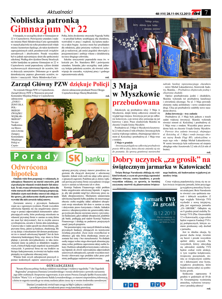 Aktualności 48 (498) 28.11-04.12.2013 Noblistka patronką 7 Gimnazjum Nr 22 8 listopada, to szczególny dzień w Gimnazjum nr 22 w Częstochowie. Poświęcenie sztandaru i nadanie imienia Marii Skłodowskiej-Curie zgromadziła w murach placówki nie tylko przedstawicieli władz miasta i kuratorium śląskiego, ale także dyrektorów zaprzyjaźnionych szkół, przedstawicieli związków zawodowych i absolwentów. Przede wszystkim był to jednak najważniejszy dzień dla społeczności szkolonej. Według słów dyrektor Doroty Strzelczyk wybór kandydata na patrona Gimnazjum nr 22 w Częstochowie został poprzedzony cyklem działań wychowawczych skierowanych do uczniów, które dotyczyły autorytetów. Dokonano go w sposób demokratyczny poprzez głosowanie uczniów, rodziców i nauczycieli. Maria Skłodowska-Curie – Polka, która dwukrotnie otrzymała Nagrodę Nobla – to przykład kobiety uosabiającej siłę charakteru, wytrwałość w pracy i mądrość. Jej kariera naukowa a także bogaty życiorys może być przykładem dla młodzieży, jakie priorytety wybierać w życiu i jak je realizować, jak umieć pogodzić obowiązki z przyjemnościami i ambicje własne z działalnością na rzecz drugiego człowieka. Szkolne uroczystości poprzedziła msza św. w kościele pw. Św. Stanisława BM i poświęcenie sztandaru. Sztandar, jako szczególny znak jednoczy kolejne pokolenia uczniów, ale również zobowiązuje do szacunku, wytężonej pracy i godnego reprezentowania szkoły. red. Zarząd Główny PZW dziękuje Policji Na wniosek Okręgu PZW w Częstochowie, Zarząd Główny PZW w Warszawie przyznał Komendzie Miejskiej Policji w Częstochowie odznaczenie „ZASŁUŻONY DLA POLSKIEGO ZWIĄZKU WĘDKARSKIEGO”. Na ręce Nadkomisarza Sławomira Litwina Zastępcy Komendanta Miejskiego Policji w Często- Odwrócona hipoteka Ostatnio wiele firm proponuje w reklamach, że zabezpieczy finansowo na starość emerytów, jeśli ci przekażą im własność swoich domów lub mieszkań. To tak zwana odwrócona hipoteka, która dla wielu starszych osób stanowi kuszącą propozycję. Jednakże często nasi drodzy emeryci nie zdają sobie sprawy, jak niekorzystne skutki prawne może wywołać dla nich zawarcie takiej umowy. Zawieranie umowy z prywatnym funduszem wiąże się z ogromnym ryzykiem. Przede wszystkim odwrócona hipoteka nie ma uregulowania ustawowego w postaci odpowiednich instrumentów zabezpieczających osoby, które przekazują mieszkanie na własność prywatnej firmie w zamian za rentę (która nie musi być dożywotnia!). Jest to zwykła umowa cywilnoprawna, zawarta w formie aktu notarialnego. I umowa taka w żaden sposób nie chroni klienta, gdy prywatne firmy, jakimi są fundusze, zbankrutują. Bo co się dzieje z mieszkaniem lub domem przekazanymi im w ramach odwróconej hipoteki? Jest de facto własnością bankrutującej firmy, więc skoro ta firma plajtuje z powodu niewypłacalności, to taka nieruchomość stanie się jednym ze składników majątkowych, z których będą mogli zaspokoić się potencjalni wierzyciele. A ponieważ firma nie ma środków na bieżące funkcjonowanie, to również nie będzie miała pieniędzy na wypłacenie obiecanej renty. Właśnie brak owych zabezpieczeń prawnych w postaci konkretnych zapisów ustawowych co do chowie odznaczenie przekazał Prezes Okręgu Częstochowskiego Maciej Brudziński. red. 3 Maja w Myszkowie przebudowana Zakończyła się przebudowa ulicy 3 Maja w Myszkowie, dzięki której całkowicie zmienił się wygląd tego miejsca. Inwestycja jest już po odbiorze końcowym, a po nowej ulicy poruszają się już kierowcy i piesi. Prace zrealizowała Skanska na zlecenie Urzędu Gminy Myszków. Przebudowa ul. 3 Maja w Myszkowie kosztowała 2,5 mln zł netto (3 mln zł brutto). Inwestycja była częścią większego zadania, obejmującego także remont ul. Kościelnej i przebudowę ul. 1 Maja wraz z rondem. 3 Maja w granicie - Inwestycja polegała na całkowitej przebudowie prawie 400 m ulicy, która obecnie zmieniła się nie do poznania. Za sprawą granitowej nawierzchni nabrała bardziej reprezentacyjnego charakteru – mówi Michał Łukaszkiewicz, Kierownik budowy, Skanska. – Przebudowa obejmowała jezdnię i obustronne chodniki. Oprócz przebudowania jezdni i chodników, Skanska wykonała też przebudowę kanalizacji i oświetlenia ulicznego. Na ul. 3 Maja powstały elementy małej architektury i nowe oznakowanie drogi. Ulicę po przebudowie ozdobiły nowo nasadzone drzewa. Jedna inwestycja – trzy zadania Przebudowa ul. 3 Maja była jednym z trzech zadań większej inwestycji. Skanska wykonała również remont ul. Kościelnej i przebudowę ul. 1 Maja wraz z rondem. Wszystkie prace prowadzone były na zlecenie Urzędu Gminy Myszków. - Pierwsze dwa zadania inwestycji, obejmujące ul. Kościelną, ul. 1 Maja i rondo (noszące obecnie nazwę Ronda Flagi RP), zakończyliśmy w maju tego roku – dodaje Michał Łukaszkiewicz. W sumie inwestycja była realizowana od sierpnia ubiegłego roku i kosztowała 5,2 mln zł (5,6 mln zł brutto). red. Dobry uczynek „za grosik” na opisanej powyżej sytuacji stanowi prawdziwe zagrożenie dla chcących skorzystać z odwróconej hipoteki. Jednak wiele osób nie zdaje sobie sprawy z opisanych zagrożeń. Podobnie jak ci, którzy wpłacali pewnej prywatnej firmie oszczędności swojego życia w zamian za lokowanie ich w złoto. Komisja Nadzoru Finansowego widzi problem braku uregulowania odwróconej hipoteki. I sugeruje, aby taki produkt mógł być oferowany przez zakłady ubezpieczeniowe. Mechanizm ustanawiania odwróconej hipoteki byłby podobny do stosowanego obecnie: osoba mogłaby oddać zakładowi ubezpieczeń swoje mieszkanie lub dom w zamian za rentę i dożywotnie prawo korzystania z lokalu. Jednakże umowa z ubezpieczycielem nie generowałaby takiego ryzyka jak obecnie zawierane umowy z prywatnymi funduszami, gdyż zakłady ubezpieczeń, podobnie jak banki, podlegają p