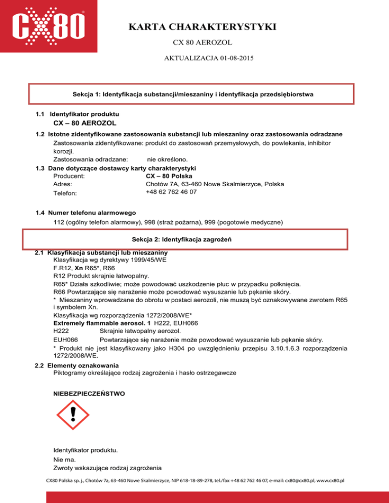 KARTA CHARAKTERYSTYKI CX 80 AEROZOL AKTUALIZACJA 01-08-2015 Sekcja 1: Identyfikacja substancji/mieszaniny i identyfikacja przedsiębiorstwa 1.1 Identyfikator produktu CX – 80 AEROZOL 1.2 Istotne zidentyfikowane zastosowania substancji lub mieszaniny oraz zastosowania odradzane Zastosowania zidentyfikowane: produkt do zastosowań przemysłowych, do powlekania, inhibitor korozji. Zastosowania odradzane: nie określono. 1.3 Dane dotyczące dostawcy karty charakterystyki CX – 80 Polska Producent: Adres: Chotów 7A, 63-460 Nowe Skalmierzyce, Polska +48 62 762 46 07 Telefon: 1.4 Numer telefonu alarmowego 112 (ogólny telefon alarmowy), 998 (straż pożarna), 999 (pogotowie medyczne) Sekcja 2: Identyfikacja zagrożeń 2.1 Klasyfikacja substancji lub mieszaniny Klasyfikacja wg dyrektywy 1999/45/WE F.R12, Xn R65*, R66 R12 Produkt skrajnie łatwopalny. R65* Działa szkodliwie; może powodować uszkodzenie płuc w przypadku połknięcia. R66 Powtarzające się narażenie może powodować wysuszanie lub pękanie skóry. * Mieszaniny wprowadzane do obrotu w postaci aerozoli, nie muszą być oznakowywane zwrotem R65 i symbolem Xn. Klasyfikacja wg rozporządzenia 1272/2008/WE* Extremely flammable aerosol. 1 H222, EUH066 H222 Skrajnie łatwopalny aerozol. EUH066 Powtarzające się narażenie może powodować wysuszanie lub pękanie skóry. * Produkt nie jest klasyfikowany jako H304 po uwzględnieniu przepisu 3.10.1.6.3 rozporządzenia 1272/2008/WE. 2.2 Elementy oznakowania Piktogramy określające rodzaj zagrożenia i hasło ostrzegawcze NIEBEZPIECZEŃSTWO Identyfikator produktu. Nie ma. Zwroty wskazujące rodzaj zagrożenia KARTA CHARAKTERYSTYKI CX 80 AEROZOL AKTUALIZACJA 01-08-2015 H222 Skrajnie łatwopalny aerozol. EUH066 Powtarzające się narażenie może powodować wysuszanie lub pękanie skóry. Zwroty wskazujące środki ostrożności P210 Przechowywać z dala od źródeł ciepła/iskrzenia/otwartego ognia/gorących powierzchni. Palenie wzbronione. P260 Nie wdychać rozpylonej cieczy. Stosować rękawice ochronne/odzież ochronną/ochronę oczu/ochronę twarzy. Dodatkowe informacje Pojemnik pod ciśnieniem: chronić przed słońcem i nagrzaniem powyżej temperatury 50o C. Nie przekłuwać ani nie spalać, także po zużyciu. Nie rozpylać nad otwartym płomieniem lub żarzącym się materiałem. Nie przechowywać w pobliżu źródeł zapłonu – nie palić tytoniu. Chronić przed dziećmi. 2.3 Inne zagrożenia Brak informacji na temat spełnienia kryteriów PBT lub vPvB zgodnie z załącznikiem XIII rozporządzenia REACH. Odpowiednie badania nie były przeprowadzone. Sekcja 3: Skład/informacja o składnikach 3.1 Substancje Nie dotyczy. 3.2 Mieszaniny benzyna ciężka obrabiana wodorem (ropa naftowa) Zakres stężeń: 40-50% Numer CAS: 64742-48-9 Numer WE: 265-150-3 Numer rejestracji właściwej: substancja podlega przepisom okresu przejściowego Klasyfikacja wg 67/548/EWG*: R10; Xn R65; R66 Klasyfikacja wg 1272/2008/WE*: Flam. Liq. 3 H226; Asp. Tox. 1 H304; EUH066 *klasyfikacja po uwzględnieniu noty/uwagi H i P, komponent zawiera poniżej 0,1 % wag. benzenu mieszanina: propan/butan/izobutan Zakres stężeń: 40-60% Numer CAS: 74-98-6/106-97-8/75-28-5 Numer WE: 200-827-9/203-448-7/200-857-2 Numer rejestracji właściwej: substancja podlega przepisom okresu przejściowego Klasyfikacja wg 67/548/EWG: F+ R12 Klasyfikacja wg 1272/2008/WE: Flam. Gas 1 H220, Press. Gas H280 Propan i butan - substancje z określoną na poziomie krajowym wartością najwyższego dopuszczalnego stężenia w środowisku pracy. Pełen tekst zwrotów R i H przytoczony został w sekcji 16 karty. Sekcja 4: Środki pierwszej pomocy 4.1 Opis środków pierwszej pomocy W kontakcie ze skórą: zdjąć zanieczyszczoną odzież. Narażone partie skóry zmyć dokładnie dużą ilością wody z mydłem. W przypadku wystąpienia niepokojących objawów skonsultować się z lekarzem. W kontakcie z oczami: wyjąć szkła kontaktowe. Zanieczyszczone oczy przepłukiwać dokładnie wodą przez co najmniej 15 min. Unikać silnego strumienia wody - ryzyko uszkodzenia rogówki. Skontaktować się z lekarzem okulistą w przypadku wystąpienia podrażnienia. W przypadku spożycia: narażenie tą drogą zazwyczaj nie występuje. W razie spożycia nie KARTA CHARAKTERYSTYKI CX 80 AEROZOL AKTUALIZACJA 01-08-2015 wywoływać wymiotów. Wypłukać usta wodą. Nigdy nie podawać niczego do ust osobie nieprzytomnej. Natychmiast skonsultować się z lekarzem. Po narażeniu drogą oddechową: wyprowadzić poszkodowanego na świeże powietrze, zapewnić ciepło i spokój. Wezwać pomoc medyczną w przypadku dalszego występowania objawów lub w przypadku ich nasilania się. 4.2 Najważniejsze ostre i opóźnione objawy oraz skutki narażenia W kontakcie z oczami: zaczerwienienie, łzawienie, chwilowe podrażnienie. W kontakcie ze skórą: zaczerwienienie, wysuszenie, pękanie, zapalenie skóry, ryzyko absorpcji przez skórę. Po inhalacji: ból i zawroty głowy, zmęczenie, zmniejszenie koncentracji, nudności, wymioty. Po połknięciu: nie są spodziewane negatywne skutki narażenia. 4.3 Wskazania dotyczące wszelkiej natychmiastowej pomocy lekarskiej i szczególnego postępowania z poszkodowanym Decyzję o sposobie postępowania ratunkowego podejmuje lekarz po dokładnej ocenie stanu poszkodowanego. Sekcja 5: Postępowanie w przypadku pożaru 5.1 Środki gaśnicze Odpowiednie środki gaśnicze: mgła wodna, piana gaśnicza, proszek gaśniczy lub CO 2. Niewłaściwe środki gaśnicze: zwarty strumień wody – niebezpieczeństwo rozprzestrzenienia pożaru. 5.2 Szczególne zagrożenia związane z substancją lub mieszaniną Podczas spalania mogą tworzyć się szkodliwe gazy zawierające m.in. tlenki węgla. Unikać wdychania produktów spalania, mogą stwarzać zagrożenie dla zdrowia. Pary produktu mogą tworzyć wybuchowe mieszaniny z powietrzem. 5.3 Informacje dla straży pożarnej Środki ochrony ogólnej typowe w przypadku pożaru. Nie należy