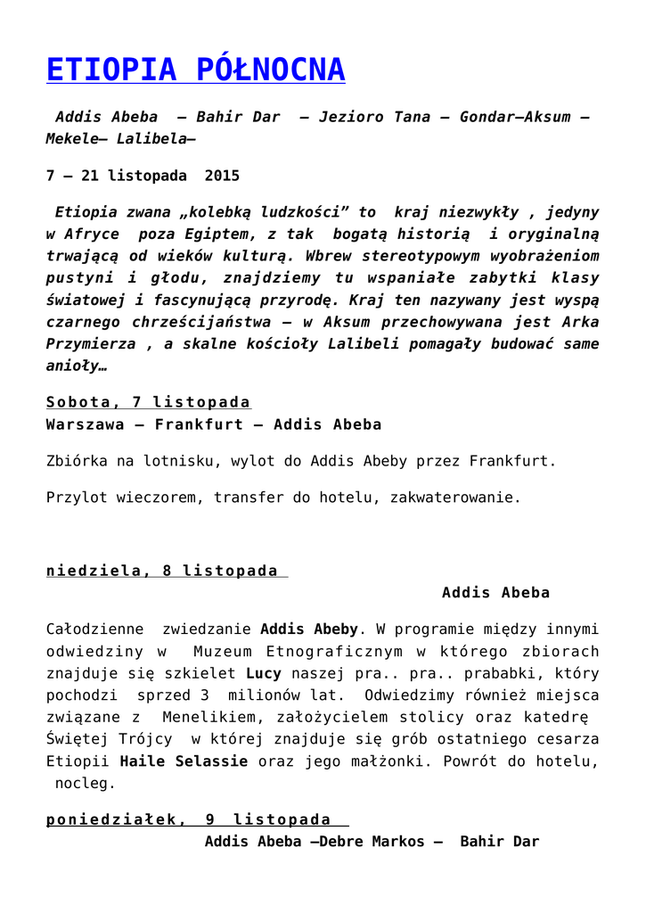 ETIOPIA PÓŁNOCNA Addis Abeba – Bahir Dar Mekele– Lalibela– 7 – 21 listopada – Jezioro Tana – Gondar–Aksum – 2015 Etiopia zwana „kolebką ludzkości” to kraj niezwykły , jedyny w Afryce poza Egiptem, z tak bogatą historią i oryginalną trwającą od wieków kulturą. Wbrew stereotypowym wyobrażeniom pustyni i głodu, znajdziemy tu wspaniałe zabytki klasy światowej i fascynującą przyrodę. Kraj ten nazywany jest wyspą czarnego chrześcijaństwa – w Aksum przechowywana jest Arka Przymierza , a skalne kościoły Lalibeli pomagały budować same anioły… Sobota, 7 listopada Warszawa – Frankfurt – Addis Abeba Zbiórka na lotnisku, wylot do Addis Abeby przez Frankfurt. Przylot wieczorem, transfer do hotelu, zakwaterowanie. niedziela, 8 listopada Addis Abeba Całodzienne zwiedzanie Addis Abeby. W programie między innymi odwiedziny w Muzeum Etnograficznym w którego zbiorach znajduje się szkielet Lucy naszej pra.. pra.. prababki, który pochodzi sprzed 3 milionów lat. Odwiedzimy również miejsca związane z Menelikiem, założycielem stolicy oraz katedrę Świętej Trójcy w której znajduje się grób ostatniego cesarza Etiopii Haile Selassie oraz jego małżonki. Powrót do hotelu, nocleg. poniedziałek, 9 listopada Addis Abeba –Debre Markos – Bahir Dar Po śniadaniu przejazd do Bahyr Daru. Po drodze zatrzymamy się przy moście zbudowanym przez Portugalczyków w XVI wieku i wodospady Nilu. Późnym popołudniem przyjazd do Bahir Daru ważnego centrum handlowego i stolicy regionu Amhara, położonego malowniczo nad jeziorem Tana. Zakwaterowanie, nocleg. wtorek, 10 listopada Bahir Dar – Jezioro Tana Po śniadaniu rejs po jeziorze Tana – największym jeziorze Etiopii gdzie rozpoczyna swój bieg Nil Błękitny. Odwiedzimy ukryte na wyspach kościoły i klasztory Etiopskiego Kościoła Ortodoksyjnego. Ściany klasztorów pokrywają mozaiki przedstawiające sceny z Nowego Testamentu a skarbce chronią obrazy i rękopisy pochodzące z etiopskiego Średniowiecza. Powrót do hotelu. Po południu przejazd do wodospadów położnych na Nilu Błękitnym, uważane za jedne z najpiękniejszych na świecie. Powrót do Bahir Daru, nocleg. środa, 11 listopada Bahir Dar Awramba – Gondar Rano przejazd do Gondar – dawnej stolicy cesarstwa Etiopii (lista UNESCO) po drodze odwiedzając Awra Amba. To unikalna, niereligijna wspólnota założona 40 lat temu na ubogich terenach północnej Etiopii. Najważniejsze zasady żyjących w tym miejscu 400 mieszkańców to równe prawa dla wszystkich bez względu na płeć pochodzenie i rasę, wspólne podejmowanie decyzji i solidarność. Miasto założone w XVI wieku pełne jest śladów przeszłości – pałacy cesarskich i zamków. Po przyjeździe zakwaterowanie w hotelu i po krótkim odpoczynku wyruszmy na zwiedzanie. Odwiedzimy miedzy innymi pałac założyciela miasta, króla Fasidelusa i jego słynne łaźnie oraz monastyr Debre Birham Selassie znane ze wspaniałych fresków i dekoracji. Powrót do hotelu, zakwaterowanie, nocleg. czwartek, 12 listopada Park Narodowy gór Simien Gondar – Rano wyjazd do Parku Narodowego Simien. Park Narodowy chroni unikalny krajobraz gór Simien, jednego z głównych afrykańskich masywów oraz jego florę i faunę, której w ponad 50 % jest endemiczna. Symbolem parku jest kozica ibex ale najciekawszym chyba zwierzęciem, występującym tylko tutaj, są jedyne na świecie trawożerne małpy – gelady. Nocleg na terenie parku. Przyjazd do Lalibeli, zakwaterowanie, kolacja i nocleg. piątek, 13 listopada Góry Siemen – Axum Po śniadaniu wyjazd do Axum przez malownicze krajobrazy gór Siemen, przełomy rzeki Tekeze i klify Tigray. Nocleg w Axum. sobota 14 listopada Axum Po śniadaniu całodzienne zwiedzanie Aksum, w programie miedzy innymi pałac Królowej Saby, łaźnie królowej Saby oraz kościół Najświętszej Marii z Zion gdzie, jak głosi legenda, złożona jest Arka Przymierza sprowadzona do Etiopii przez króla Salomona. Nocleg. niedziela, 15 listopada Dolina Gherhalta Axum – Na trasie do doliny Gherhalta zwiedzmy kościoły rejonu Tigray: między innymi świątynie w Yeha, pierwszej stolicy imperium Axumite oraz kościół Debre Damo umiklany ze względu na położenie wysoko przechowywane. poniedziałek, na 16 skale i bezcenne listopada Dolina Gheralta – manuskrypty tam Mekele Przejazd do Mekele po drodze kontynuując zwiedzanie skalnych kosciołow Tigray. Zobaczymy między kościoły Abracha Atsbecha – jeden z najpiękniejszych w regionie, słynący z pięknie rzeźbionych drewnianych sufitów i kolumn oraz Wukro Cherkos , wykutego w piaskowcu, z malowidłami z 15 wieku. Przyjazd do Mekele, nocleg. wtorek, 17 listopada Mekele – Lalibela Przejazd do Lalibeli, po drodze zatrzymując się w mieście Sekota. środa, 18 listopada Lalibela Całodzienne zwiedzanie. Lalibela – miasto wpisane na listę światowego dziedzictwa UNESCO – najważniejsze miejsce Etiopii, afrykańska nowa Jerozolima, miejsce pielgrzymek chrześcijan z całego świata. W XII wieku pobożny król Lalibela otrzymał polecenie od Boga, aby na ziemi odtworzyć skalną Jerozolimę. Przez ponad 20 lat nad tym niezwykłym zadaniem pracowało 40 000 robotników. Efekt można podziwiać do dziś: jedenaście kościołów wykutych w skale. Obejrzymy kolejno pierwszą grupa kościołów (m.in. Bet Medhame Alem, Bet Maryam) jak i drugą grupa kościołów m.in. Abba Libanos, Bet Emmanuel. Nocleg. czwartek, 19 listopada Po śniadaniu wyjazd do Yimrhanna Kristos. To wspaniały przykład architektury Axumite – kościół ten, starszy o wiek od kościołów pobliskiej Lalibeli, znajduje się w jaskini. Następnie wizyta w monastyrze Nakuto Leab – również położonym w jaskini, w miejscu gdzie w 13 wieku król Nakuto Leab wiódł życie pustelnika po abdykacji z tronu. Popołudnie wolne, uczestnictwo w ceremonii parzenia kawy w kawiarni Old Abissinia. Nocleg. Piątek, 20 listopada Abeba – Frank
