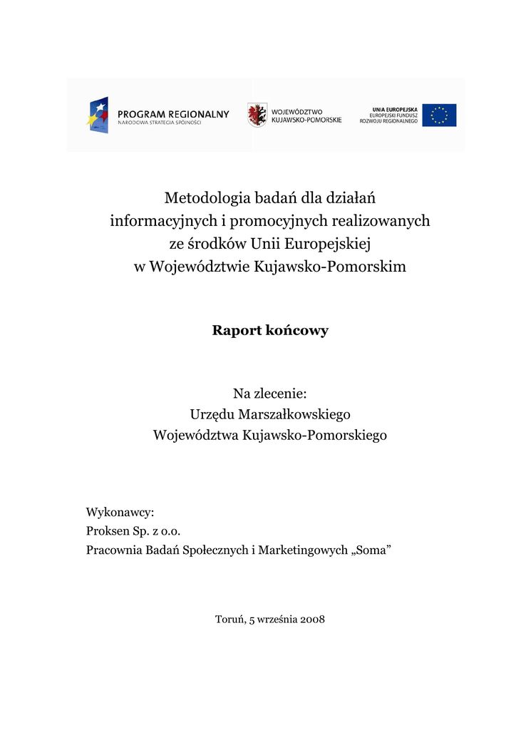 Metodologia badań dla działań informacyjnych i promocyjnych realizowanych ze środków Unii Europejskiej w Województwie Kujawsko-Pomorskim Raport końcowy Na zlecenie: Urzędu Marszałkowskiego Województwa Kujawsko-Pomorskiego Wykonawcy: Proksen Sp. z o.o. Pracownia Badań Społecznych i Marketingowych „Soma” Toruń, 5 września 2008 Spis treści 1. STRESZCZENIE ...................................................................................................................... 3 2. WPROWADZENIE .................................................................................................................. 5 3. ZAŁOŻENIA METODOLOGICZNE BADANIA ............................................................................ 7 4. OGÓLNA CHARAKTERYSTYKA OBSZARU BADANIA ............................................................. 14 5. WYNIKI ANALIZY PROBLEMÓW BADAWCZYCH .................................................................. 18 6. OCENA ZAŁOŻEŃ METODOLOGICZNYCH PRZYJĘTYCH DLA BADANIA PILOTAŻOWEGO .... 35 7. REKOMENDACJE DLA BADANIA WŁAŚCIWEGO .................................................................. 41 8. WYKAZ UŻYTYCH SKRÓTÓW ............................................................................................... 49 9. ANEKSY ............................................................................................................................... 50 2 1. Streszczenie 1. STRESZCZENIE W raporcie przedstawiono wyniki badania pilotażowego, w ramach którego dokonano oceny możliwości wykonania badania ewaluacyjnego nt.: Ocena działań informacyjnych i promocyjnych realizowanych ze środków Unii Europejskiej w Województwie Kujawsko-Pomorskim. Rozdział 2 opracowania zawiera krótkie wprowadzenie w temat przeprowadzonej ewaluacji. Rozdział 3 przedstawia założenia metodologiczne, w tym cel badania i opis głównych elementów metodologii przeprowadzonych badań. Celem badania było określenie szczegółowej metodologii właściwego badania ewaluacyjnego nt. oceny działań informacyjno-promocyjnych Urzędu Marszałkowskiego Województwa Kujawsko-Pomorskiego, dobranie najskuteczniejszych narzędzi do jego realizacji, weryfikacja adekwatności i jasności sformułowania pytań badawczych, ocena metod badawczych oraz konstrukcji narzędzi badawczych – ich trafności i efektywności. W ramach badania zrealizowano: 1) wywiady indywidualne pogłębione (IDI) z pracownikami Urzędu Marszałkowskiego Woj. Kujawsko-Pomorskiego, 2) wywiady kwestionariuszowe telefoniczne (CATI), 3) wywiady kwestionariuszowe osobiste (PAPI), 4) wywiady w postaci panelu eksperckiego, 5) analizę dokumentów. Ponadto w ramach niniejszego badania dokonano analizy mechanizmów organizowania działań informacyjnych i promocyjnych w ramach RPO WK-P. Analizie poddano przede wszystkim dokumenty programowe, które regulują zasady prowadzenia tego typu działań, jak i dokumenty wewnętrzne opracowane na użytek poszczególnych działań operacyjnych. Całość zebranego materiału poddana była ocenie pod kątem czy: 1) użyte metody i narzędzia dostarczają wyczerpujących odpowiedzi na postawione pytania ewaluacyjne (główne i uzupełniające); 2) narzędzia są dostosowane do grupy respondentów, do których są skierowane; 3) multiplikacja źródeł, na podstawie których oparte mają być oceny i rekomendacje jest niezbędna; 4) prawidłowo zastosowano dobór prób badawczych; 1. Streszczenie 5) przebadano wszystkie interesujące grupy respondentów i zadano planowane pytania; 6) uzyskano pożądane wyniki, pozwalające na rozwiązanie problemów badawczych. Rozdział 4 zawiera charakterystykę przedmiotu badania, tj. omówienie zasad prowadzenia działań promocyjnych i informacyjnych. Zasady te określone są przez rozporządzenia krajowe i UE, w których jasno określono podstawowe obowiązki w tym zakresie. Narzucają one m.in. obowiązek opracowania Planu Komunikacji, zawierającego szczegółowe zasady organizacji działań promocyjnych i informacyjnych. Rozdział 5 to analiza zebranego materiału badawczego w celu udzielenia odpowiedzi na postawione zagadnienia badawcze (ewaluacyjne): 1) Analiza aktywności IZ RPO WK-P w podejmowaniu działań informacyjnopromocyjnych; 2) Ocena dostępnych na rynku produktów promocyjnych i informacyjnych; 3) Ocena zapotrzebowania na promocję – wypełnienie wymagań UE, RPO, beneficjentów; 4) Charakterystyka potencjalnych odbiorców/ kanały dystrybucji; 5) Analiza promocji marki: jej rozpoznawalność, powszechność, odrębność (badania marki UE, RPO, EFRR, województwa); 6) Analiza możliwości i ograniczeń prowadzenia działań promocyjno- informacyjnych. Rozdział 6 stanowi jednocześnie odpowiedź na ostanie z powyższych pytań i jest standardowym elementem badania ewaluacyjnego, jakim są wnioski i rekomendacje. Rozdział 7 to rozwinięcie rekomendacji sformułowanych w rozdziale 6 i jednocześnie wskazanie propozycji dla badania właściwego. 4 2. Wprowadzenie 2. WPROWADZENIE Głównym celem badania była analiza możliwości przeprowadzenia badania ewaluacyjnego nt.: Ocena działań informacyjnych i promocyjnych realizowanych ze środków Unii Europejskiej w Województwie Kujawsko-Pomorskim. Zatem zadaniem badania, którego wyniki tu prezentujemy, było określenie szczegółowej metodologii właściwego badania ewaluacyjnego, dobranie najskuteczniejszych narzędzi do jego realizacji, weryfikacji adekwatności i jasności sformułowania pytań badawczych, ocena metod badawczych oraz konstrukcji narzędzi badawczych – ich trafności i efektywności. Dla realizacji ww. celów przeprowadzono badanie, które umożliwiało uzyskanie wstępnych wyników w zakresie oceny działań promocyjnych. Przede wszystkim umożliwiało ono ocenę możliwości zastosowania danego narzędzia badawczego oraz ewentualnych wad i zalet jego stosowania. W ramach badania empirycznego zrealizowano: 1) Wywiady indywidualne (IDI)