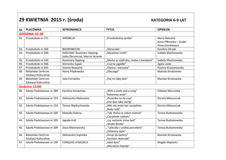 29 KWIETNIA 2015 r. (środa) Lp. PLACÓWKA KATEGORIA 6-9 LAT WYKONAWCA TYTUŁ OPIEKUN GODZINA 10.30 32. Przedszkole nr 271 WRÓBELKI „Przedszkolna samba” 33. 34. Przedszkole nr 309 Przedszkole nr 240 „Słoneczko” „Niewinne minki” 35. 36. 37 38. Przedszkole nr 240 Przedszkole nr 306 Przedszkole nr 245 Bielańskie Centrum Edukacji Kulturalnej Bielańskie Centrum Edukacji Kulturalnej BIEDRONECZKI DZIECIAKI: Rosemary Oppong, Julita Zbroszczyk, Marcin Siciarek Rosemary Oppong Weronika Sypek Joanna Nowacka Hania Filipkowska Maria Rekucka Anna Piłkowska – Gudel Anna Gronkiewicz Karolina Olczak Izabela Machnowska „Mamo w szlafroku, mamo z kwiatami” „Czarne jagódki” „Owoce i warzywa” „Dlaczego” Izabela Machnowska Agata Jasko Paulina Krzyżanowska Mariola Strukowska Julia Fornalska „Daj mi rękę tato” Mariola Strukowska „With a smile and a song” “Kolorowy wiatr” „Piosenka na zły czas” „Ene due rabe swing” „Nikt nie może być szczęśliwy „Rudy rydz” „Tyle słońca w całym mieście” „Cierpliwie czekam” „czy nastanie znów świt” „Joszko Broda” „”Laleczka z saskiej porcelany” „Orkiestry dęte” „Drzwi do kariery” „Kocham zwierzaki” „Idzie dysc” „Mariackie hejnały” Elżbieta Moczulska 39. Godzina 12:00 40. Szkoła Podstawowa nr 289 Karolina Kordońska 41. Szkoła Podstawowa nr 133 Aleksandra Makowska 42. Szkoła Podstawowa nr 133 Teresa Wędrychowska 43. Szkoła Podstawowa nr 209 Matylda Dubina 44. Szkoła Podstawowa nr 209 Jagoda Król 45. Szkoła Podstawowa nr 209 Zosia Maronowska 46. Bielańskie Centrum Edukacji Kulturalnej Szkoła Podstawowa nr 109 Aleksandra Sopińska 47. CONQUES of MUSICA Dorota Matuszczak Dorota Matuszczak Teresa Budzanowska Teresa Budzanowska Teresa Budzanowska Mariola Strukowska Magda Majewicz