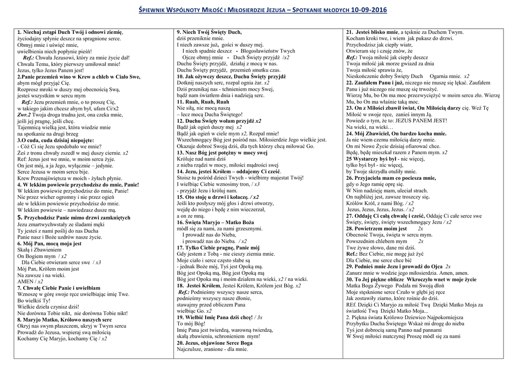 Śpiewnik na spotkanie 10.09.2016 - Wspólnota Miłość i Miłosierdzie