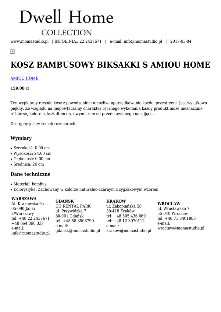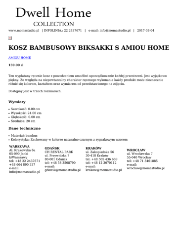 www.momastudio.pl | INFOLINIA.: 22 2437671 | e-mail: [email protected] | 2017-03-04 KOSZ BAMBUSOWY BIKSAKKI S AMIOU HOME AMIOU HOME 159.00 zł Ten wyplatany ręcznie kosz z powodzeniem umożliwi uporządkowanie każdej przestrzeni. Jest wyjątkowo piękny. Ze względu na niepowtarzalny charakter ręcznego wykonania każdy produkt może nieznacznie różnić się kolorem, kształtem oraz wymiarem od przedstawionego na zdjęciu. Dostępny jest w trzech rozmiarach. Wymiary ● ● ● ● Szerokość: 0.00 cm Wysokość: 24.00 cm Głębokość: 0.00 cm Średnica: 20 cm Dane techniczne ● ● Materiał: bambus Kolorystyka: Zachowany w kolorze naturalno-czarnym z zygzakowym wzorem WARSZAWA Al. Krakowska 6a 05-090 Janki k/Warszawy tel: +48 22 2437671 +48 664 890 337 e-mail: [email protected] GDAŃSK CH RENTAL PARK ul. Przywidzka 7 80-001 Gdańsk tel: +48 58 3508790 e-mail: [email protected] KRAKÓW ul. Zakopiańska 56 30-418 Kraków tel: +48 505 436 669 tel: +48 12 3070112 e-mail: [email protected] WROCŁAW ul. Wrocławska 7 55-040 Wrocław tel: +48 71 3461885 e-mail: [email protected]
